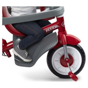The 4-in-1 Stroll ‘NTrike is the ultimate grow-with-me trike that offers 4 ways to ride. It easily converts from an infant trike to a steering trike, learn-to-ride-trike, and finally a classic trike. The trike features removable wrap around tray with cup holder, adjustable UV blocking canopy, and a 3-point harness for safety. It also has wide rear wheels to provide a quiet ride, removable footrest for early stages, and a rear storage bucket. The parent steering push handle removes for older riders. The sturdy steel frame and adjustable seat ensure it will last for years.