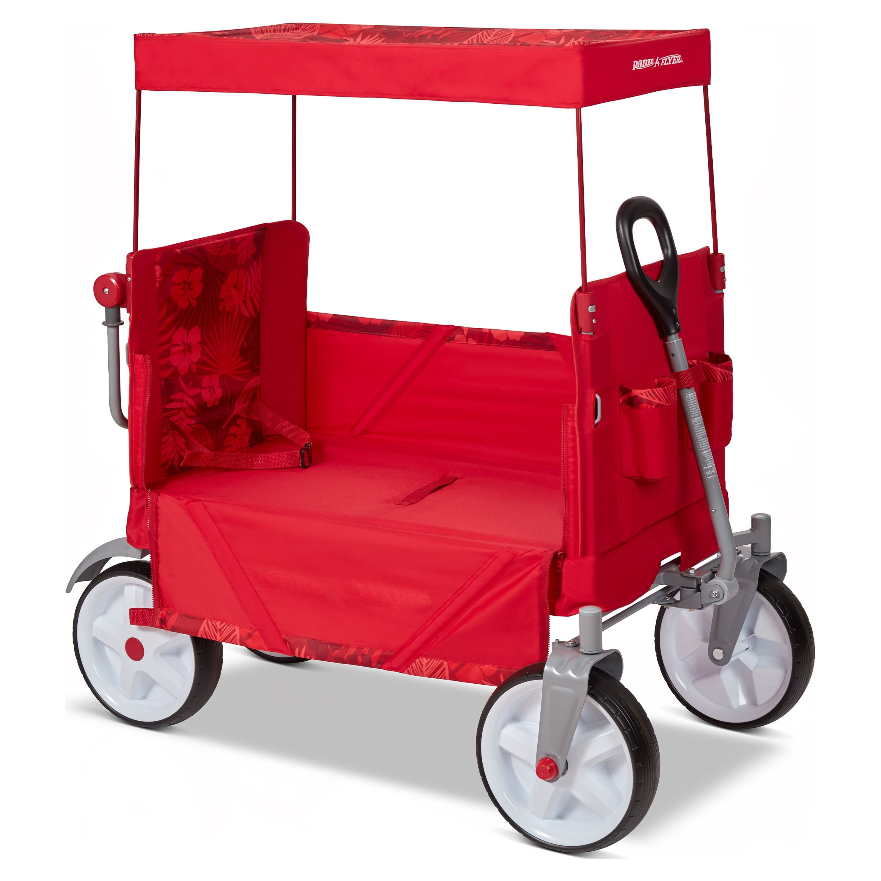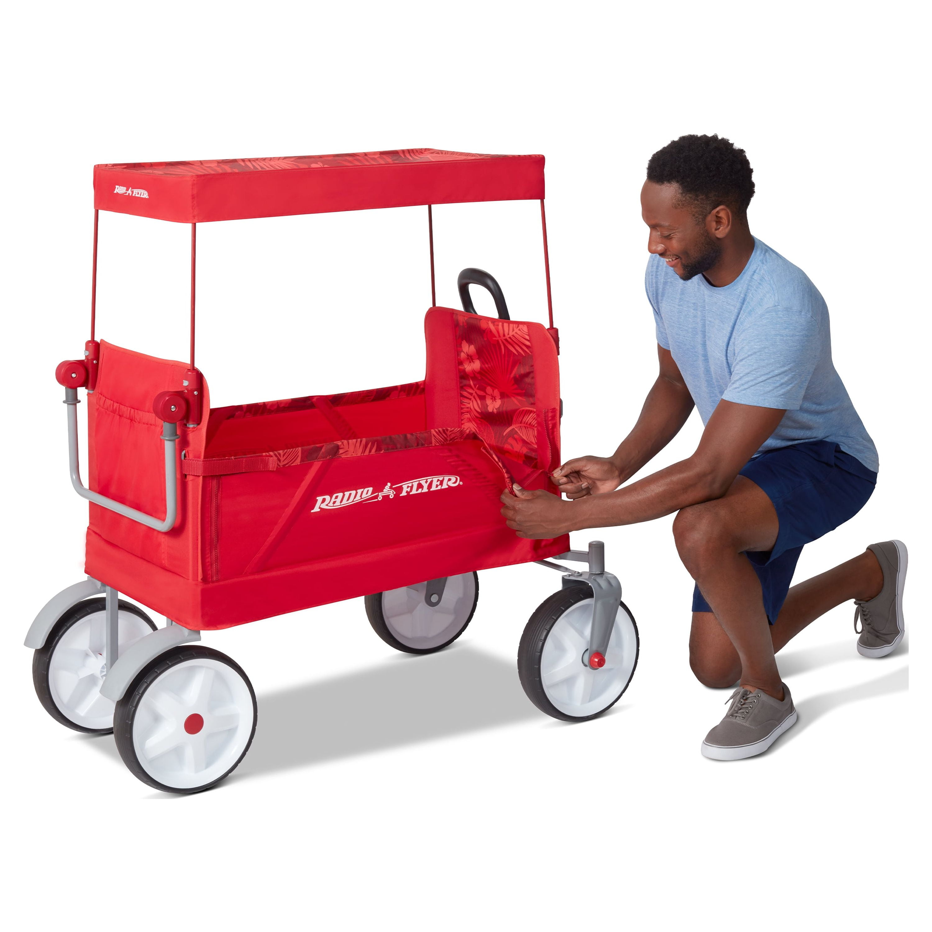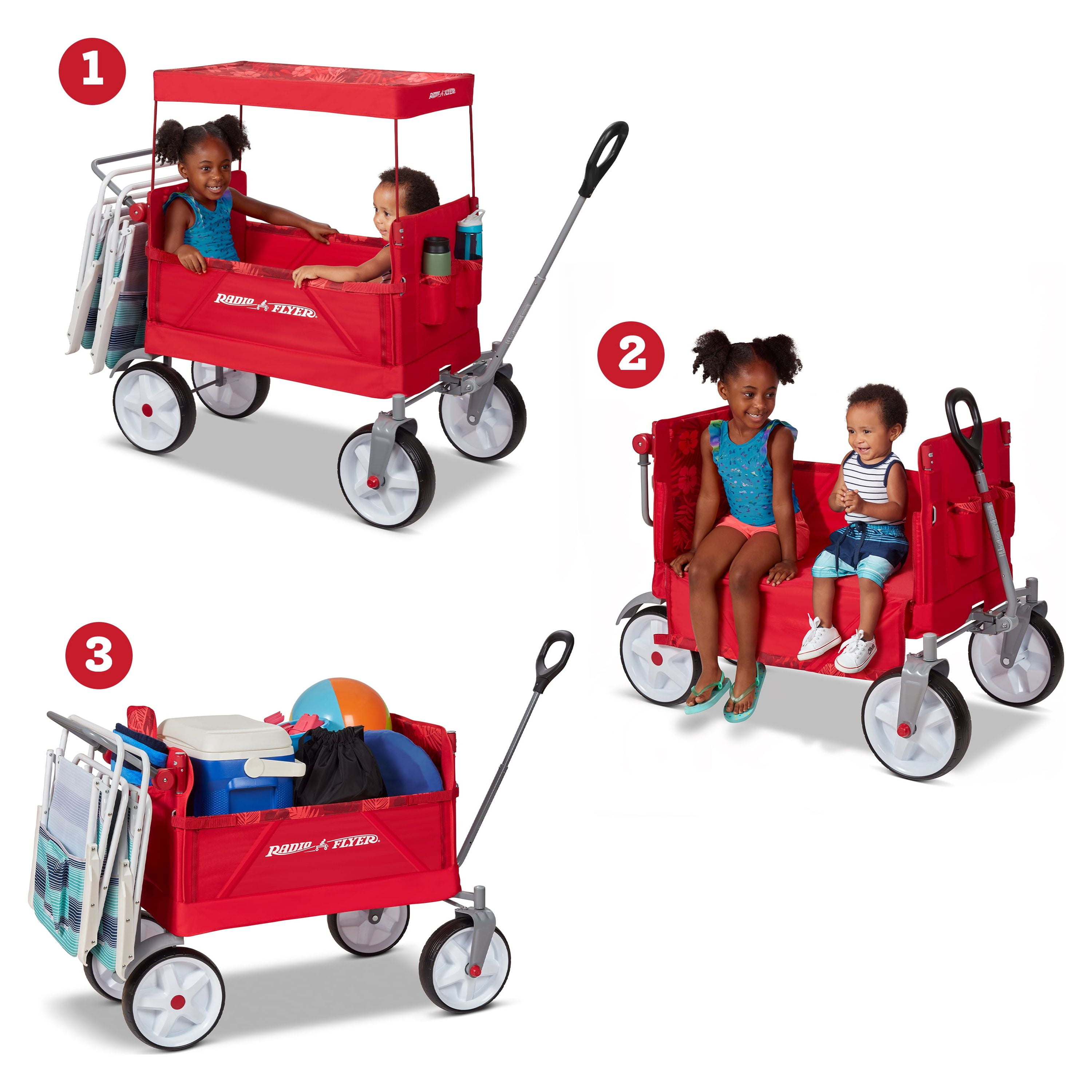 3 wagons in 1 – two rider seating, hauling, & bench seating Extra-wide beach tires and linked steering provide a smooth ride on sand Easy one hand fold, folds flat for easy storage UV protection canopy and beach chair storage 100% recycled wagon fabric Adult assembly required, instructions included Maximum weight capacity 150 lbs. For ages 18 months and up Body Dimensions: 49.0″ L x 28.5″ W x 44.5″ H Weight: 29.5 lbs. Carton Dimensions: 28.0″ L x 10.0″ W x 25.5″ H If you have any questions regarding your product, please contact Radio Flyer Customer Service at 1 (800) 621-7613 or email us at [email protected].