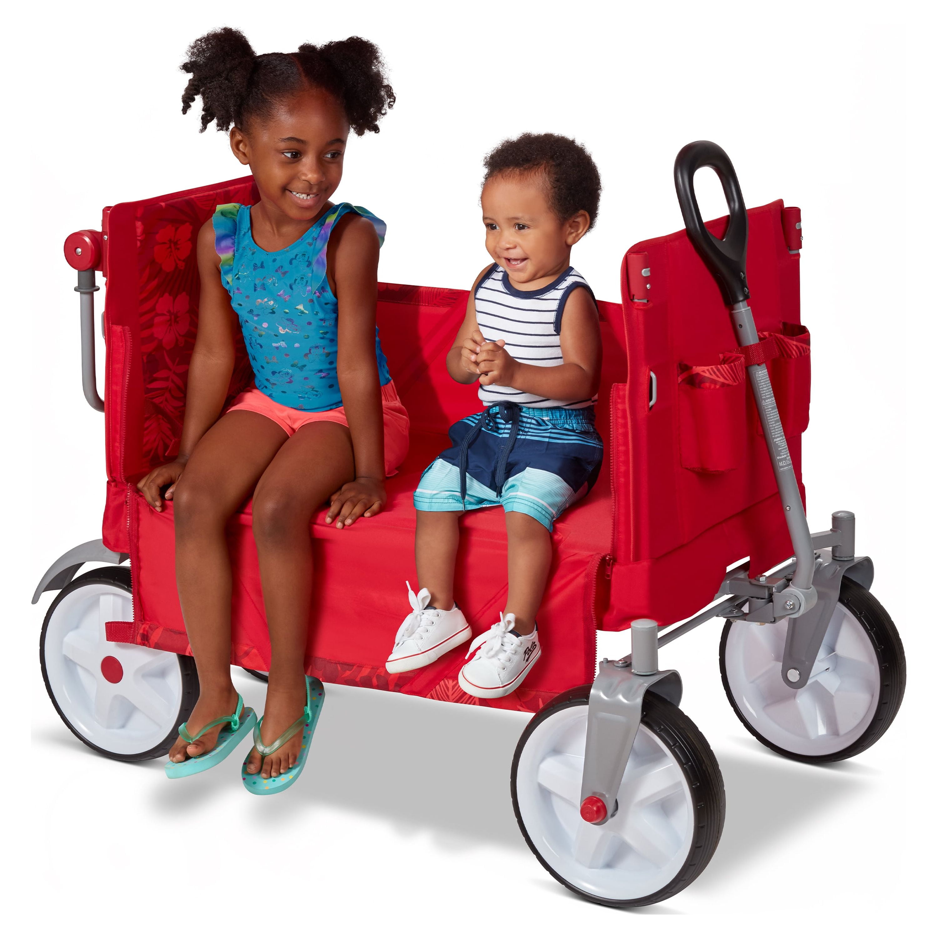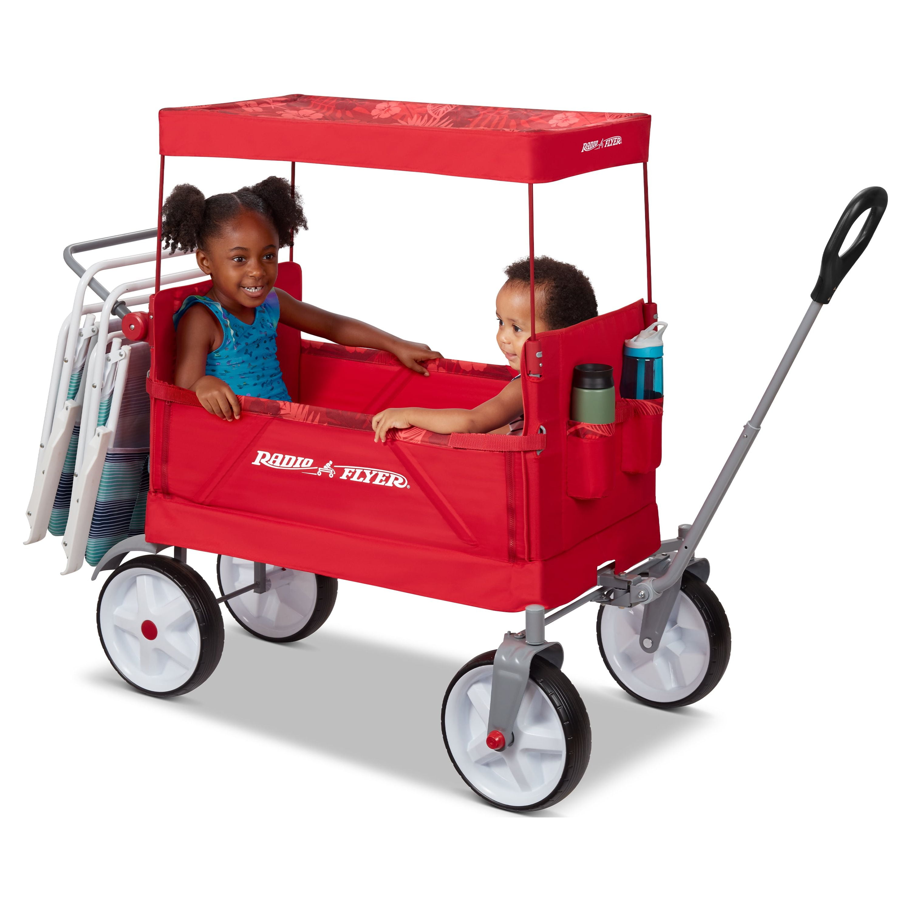 Radio Flyer’s Beach & Boardwalk is the best choice wagon for the beach! Designed as a full-sized wagon for kids, it folds compactly and offers 3 different modes: 2 kids riding, flatbed hauling, and bench seating. With an easy one hand fold and extra-wide tires, you can take or store the wagon anywhere, including the beach! The high seat backs and thick padded seat with seat belts provide a comfortable ride, while the UV blocking canopy protects from the sun. It also features a rear bar to carry up to three beach chairs. The canopy can be stored in the rear storage pouch and the canopy poles retract into the wagon frame when not in use. The DuraClean® 2.0 is our most durable fabric and can be easily wiped clean. It also features 2 front cup holders. Maximum weight capacity 150 lbs. For 1 ½+ years and up.