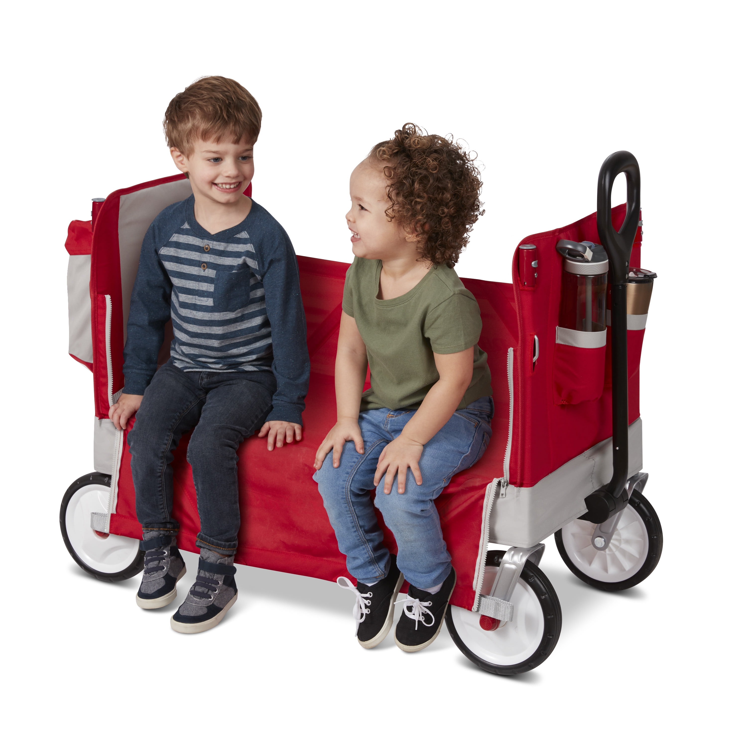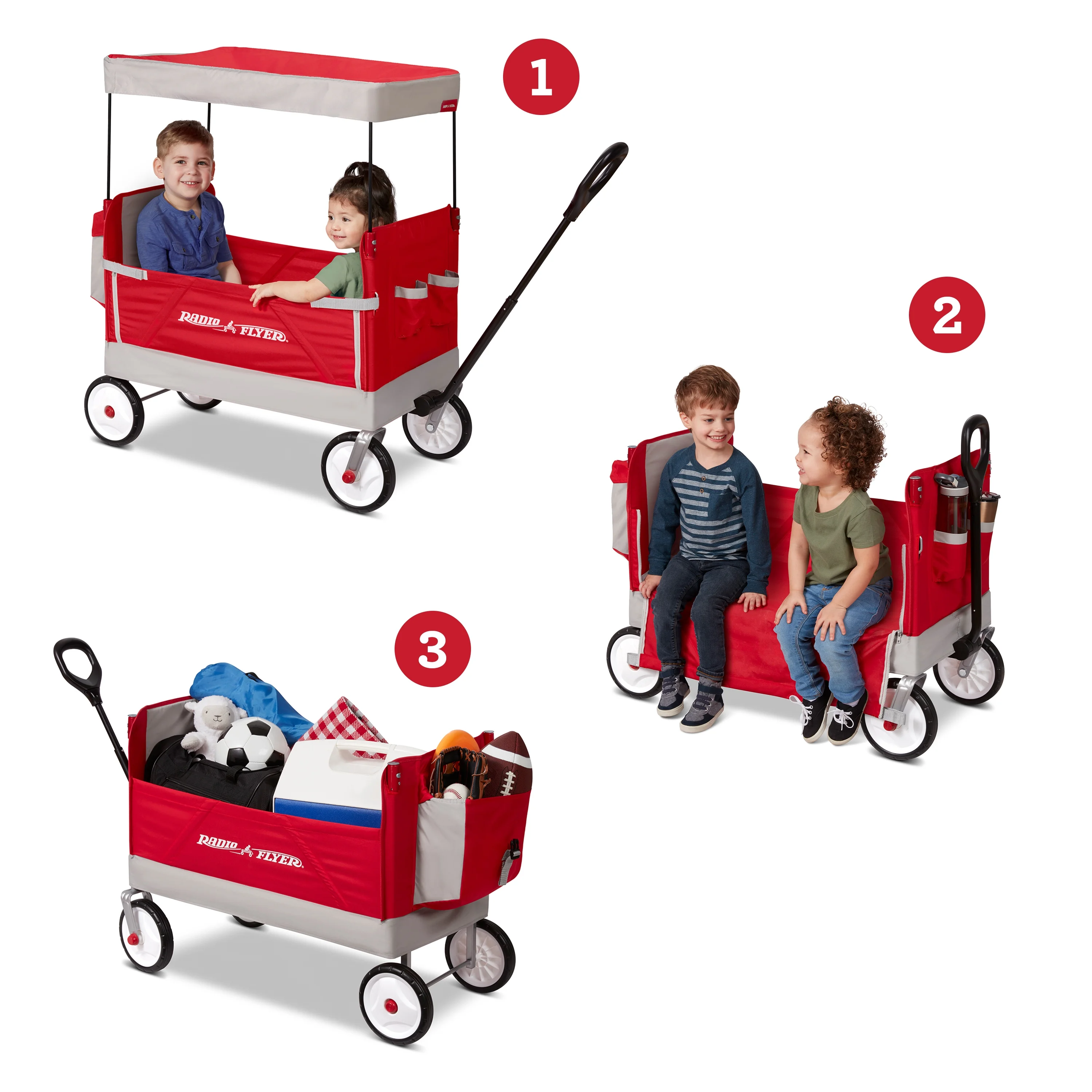 3 wagons in 1 – two rider seating, hauling, & bench seating Easy one hand flat fold, folds flat for easy storage Removable UV protection canopy stores on wagon when not in use Never Fall™ pull handle stays upright when not in use Rear storage bag hauls cargo and canopy Two front cupholders Seatbelts for added safety for your child Recommended for kids 1.5 years and up Maximum weight capacity 150 lbs. Assembled dimensions: 42.5″ L x 21.2″ W x 40.75″ H Assembled weight: 21.38 lbs. If you have any questions regarding your product, please contact Radio Flyer Customer Service at 1 (800) 621-7613 or email us at [email protected]