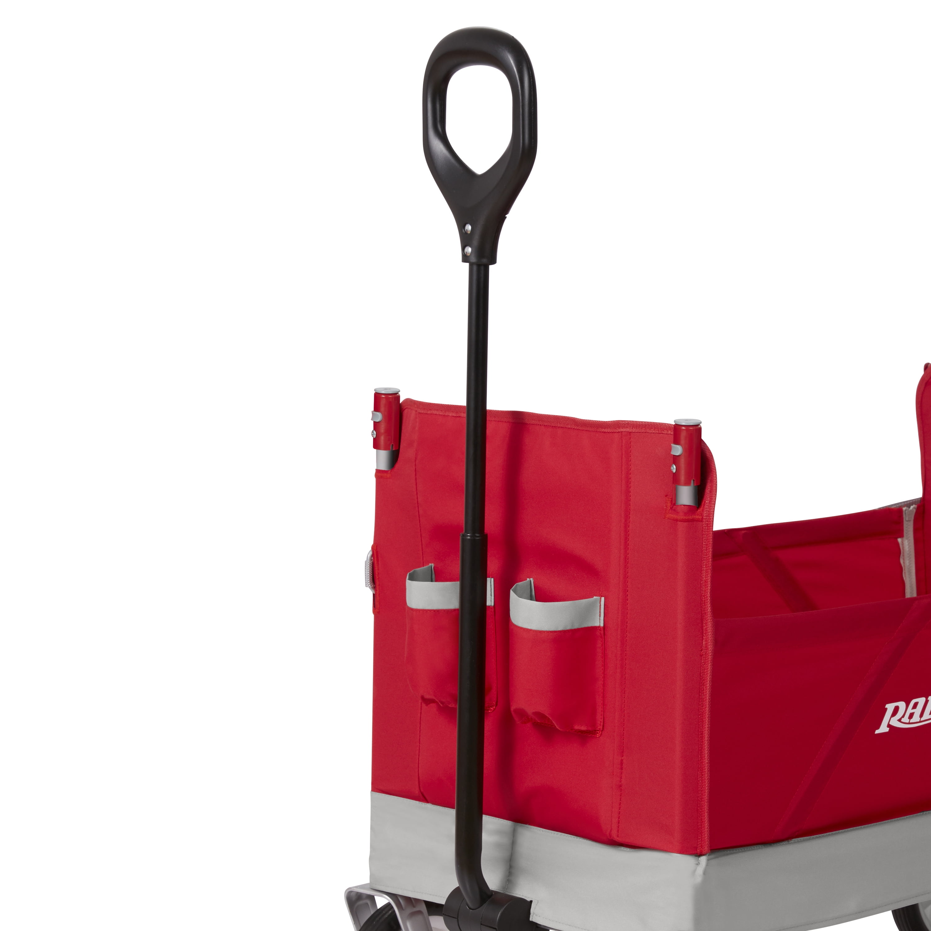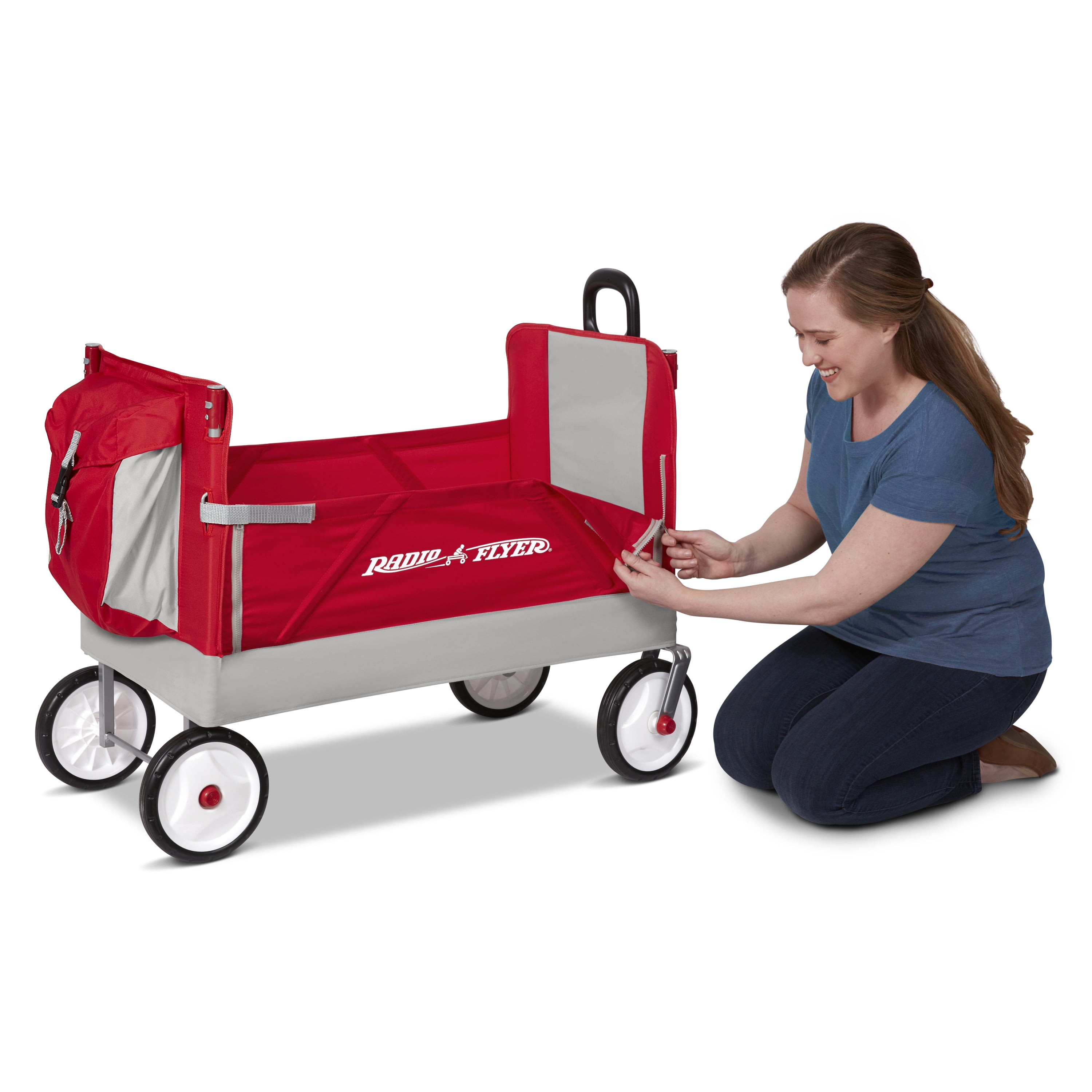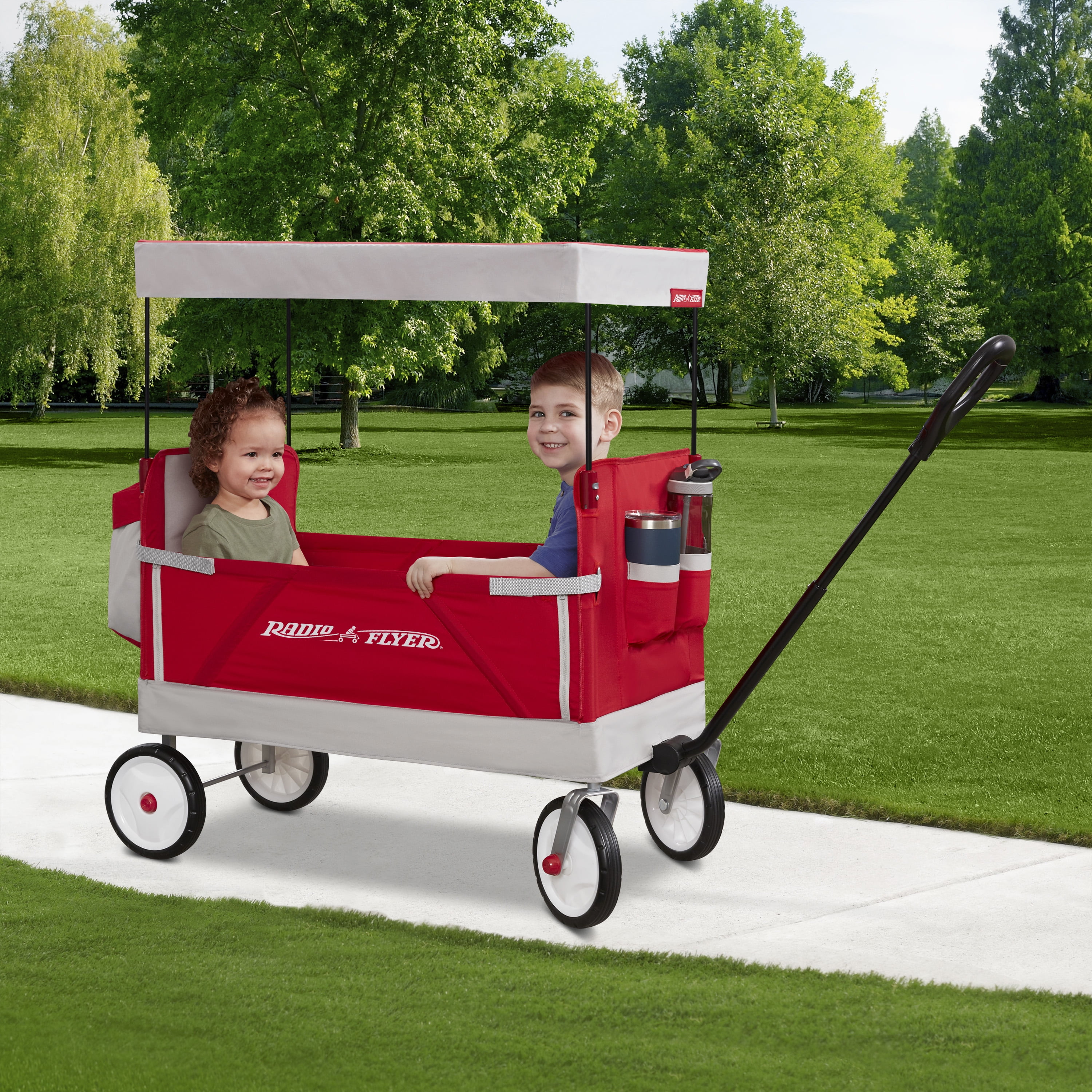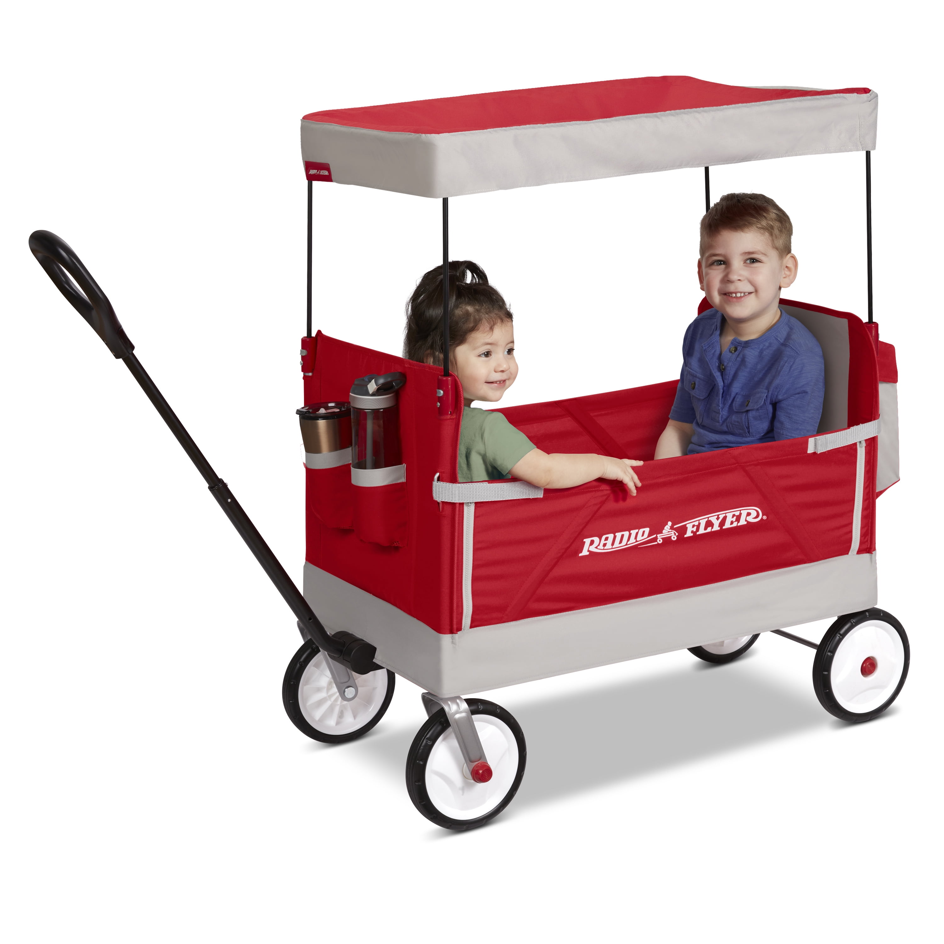 Radio Flyer’s Family Wagon with Canopy is designed as a full-sized wagon for children that folds compactly and offers plenty of storage for a family on the go. With an easy one hand fold, you can take or store the wagon anywhere! The integrated rear storage bag hauls additional cargo while the high seat backs and thick padded seats with seatbelts add comfort. The removable canopy provides UV protection and can be stored in the rear storage bag when not in use. The safety straps and zippers transform the wagon into bench seating and the Never Fall™ pull handle stays upright. The Dura Clean® fabric is durable and can be easily wiped clean and features 2 front cup holders. Maximum weight capacity 150 lbs. For ages 1 ½+ years.