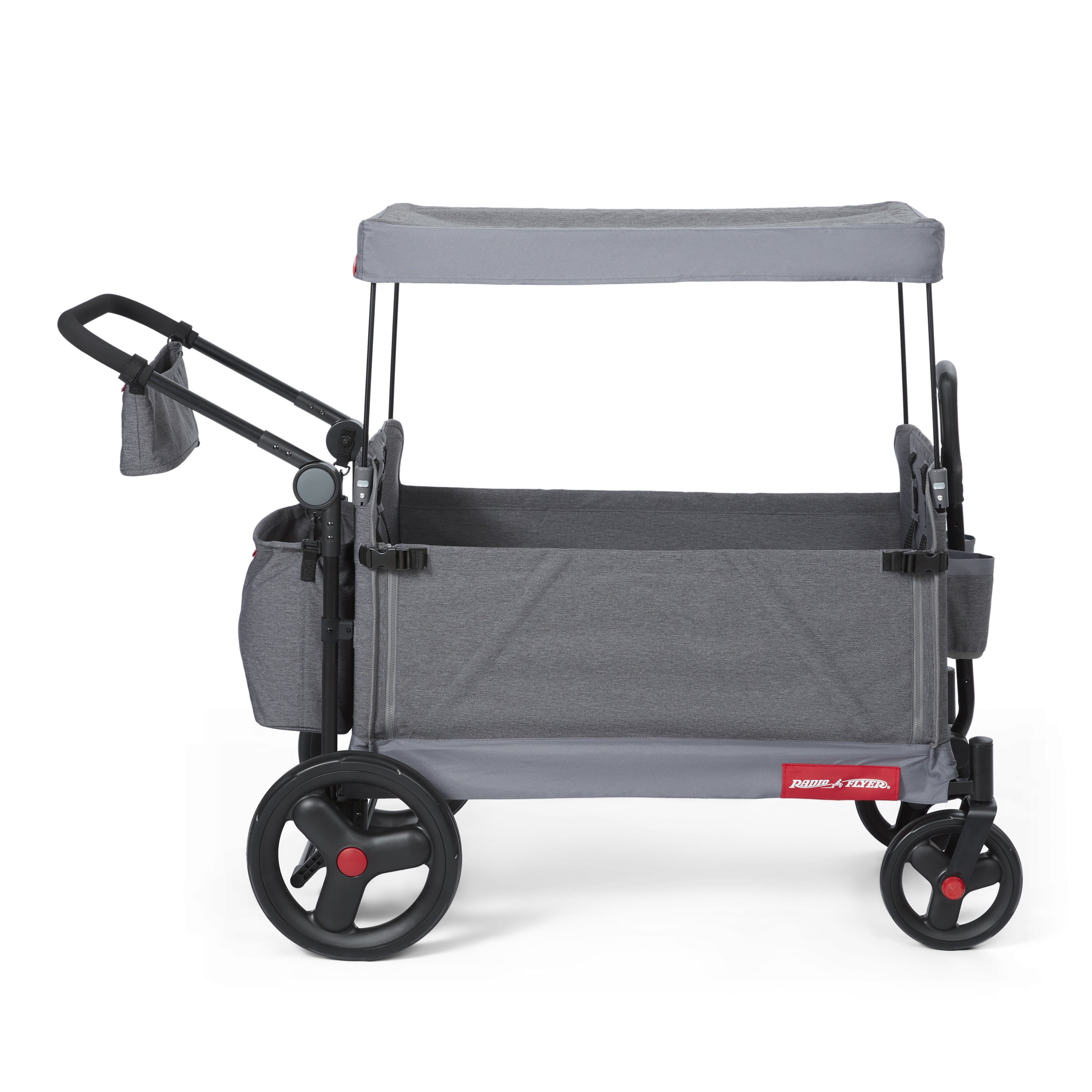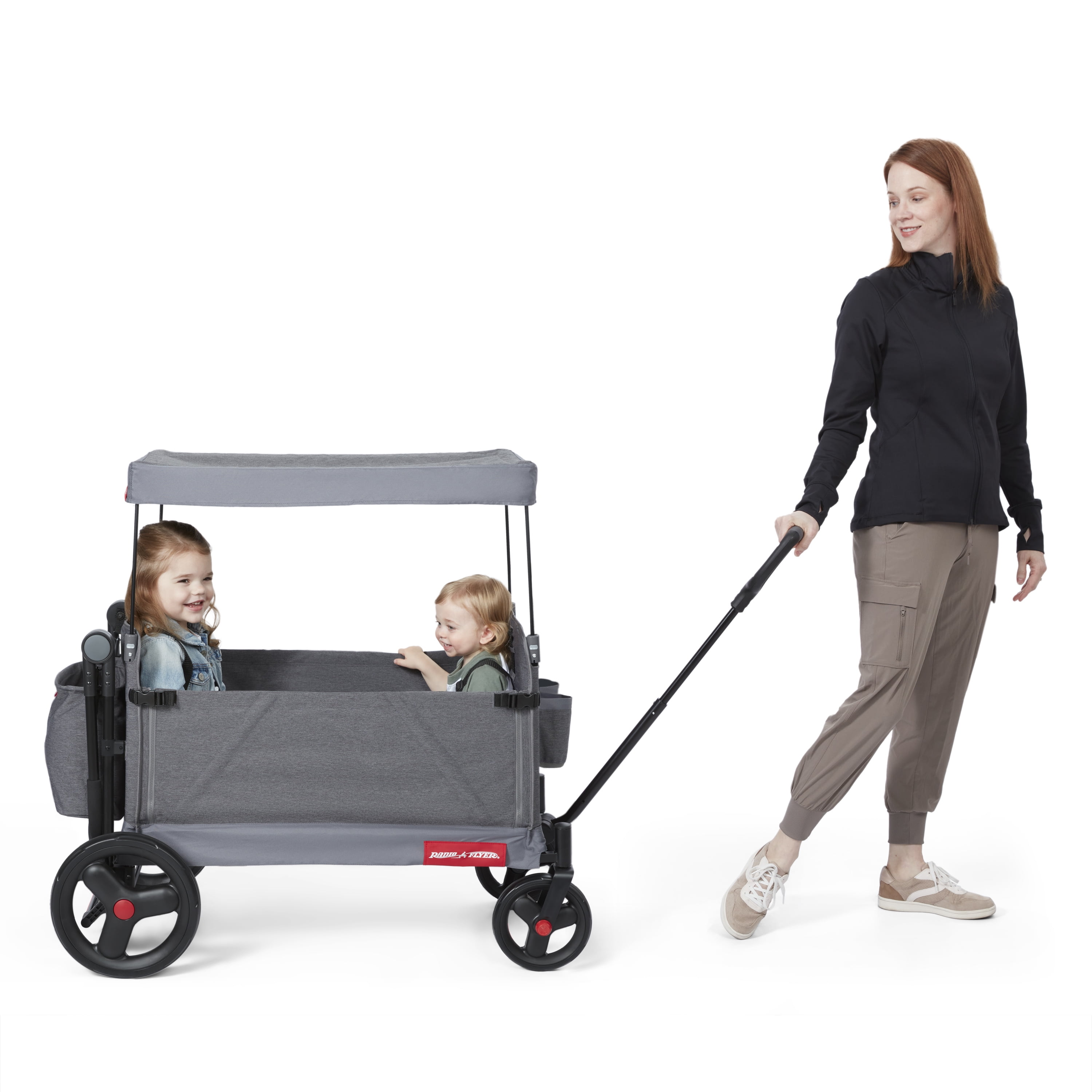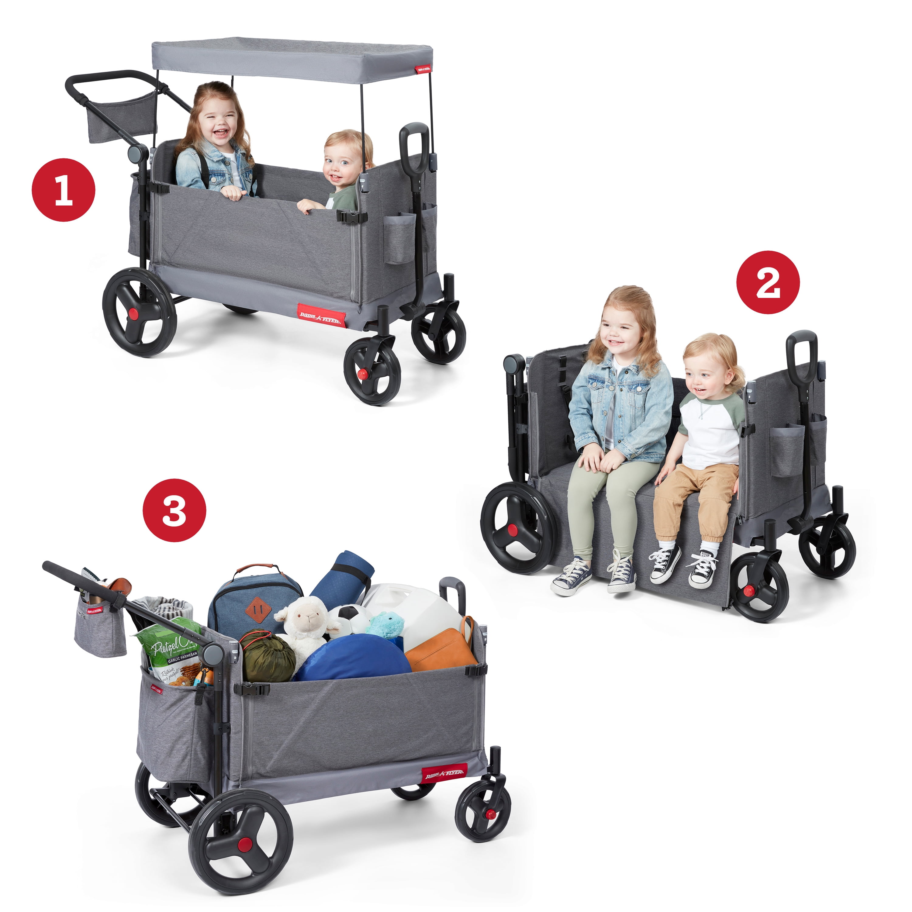 3 wagons in 1 – hauling, 2 rider seating, & bench seating Convenient push or pull steering Easy fold; wagon folds flat for easy storage 5-point safety harnesses and rear brake Internal pockets, rear storage bag, and parent caddy for maximum storage UV protection canopy rolls and stores on the wagon when not in use Front caster wheels for nimble steering and large, 12” easy push rear wheels Unisex design for all kids to enjoy! Maximum weight capacity 120 lbs. Recommended for kids and toddlers 1 year and up Assembled wagon dimensions: 47.2″ L x 24.4″ W x 41.3″ H Assembled wagon weight: 33.5 lbs. If you have any questions regarding your product, please contact Radio Flyer Customer Service at 1 (800) 621-7613 or email us at [email protected].