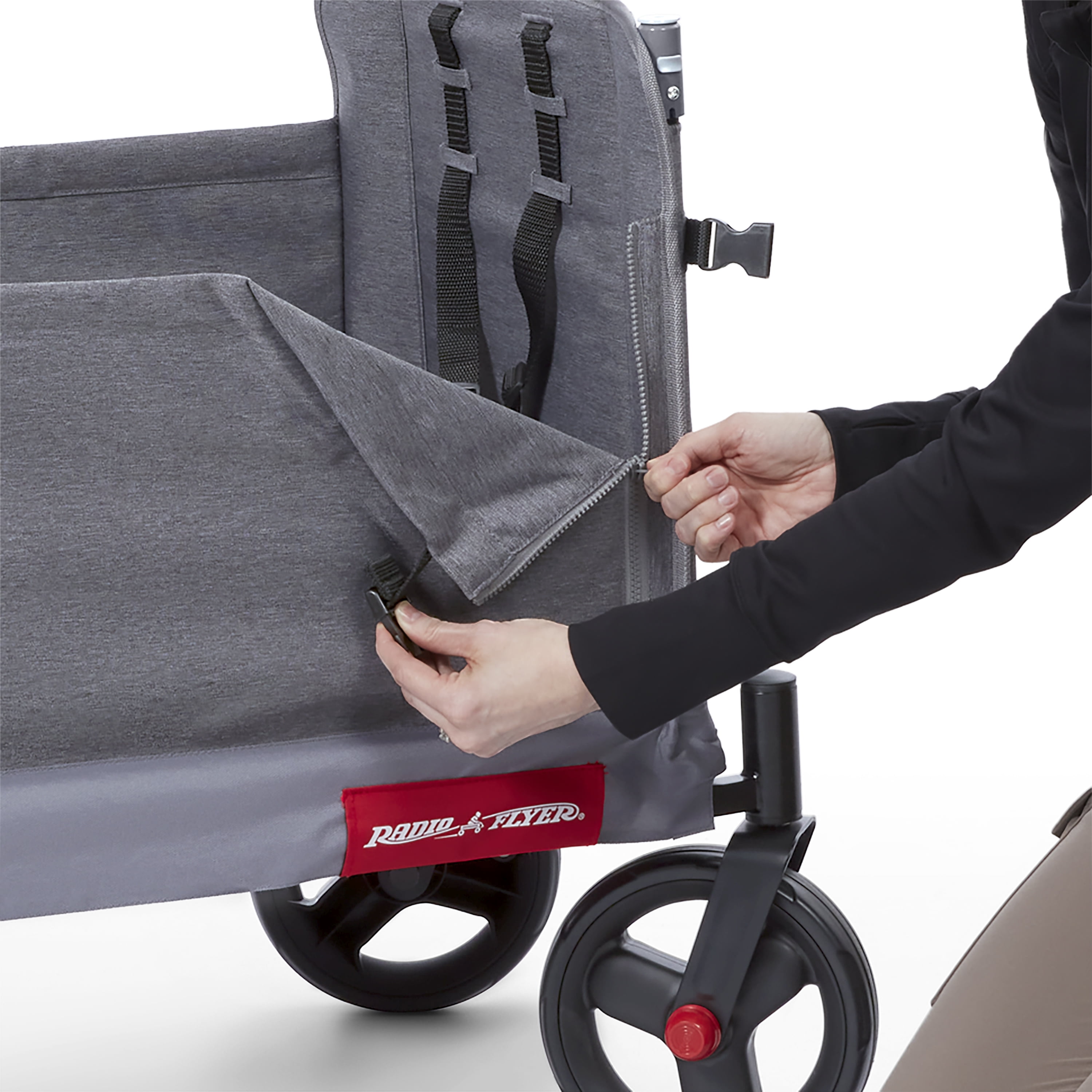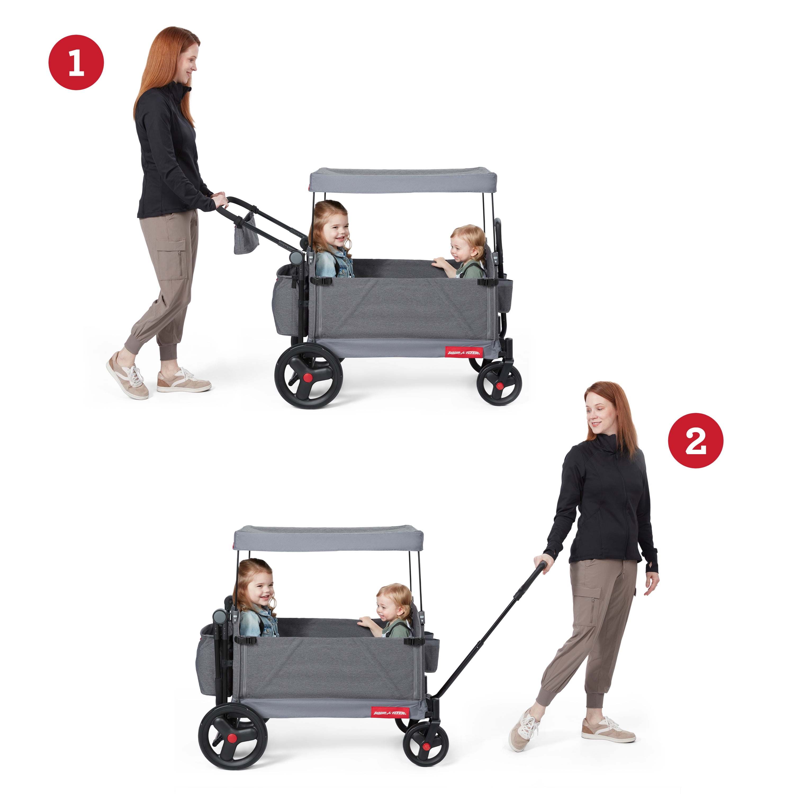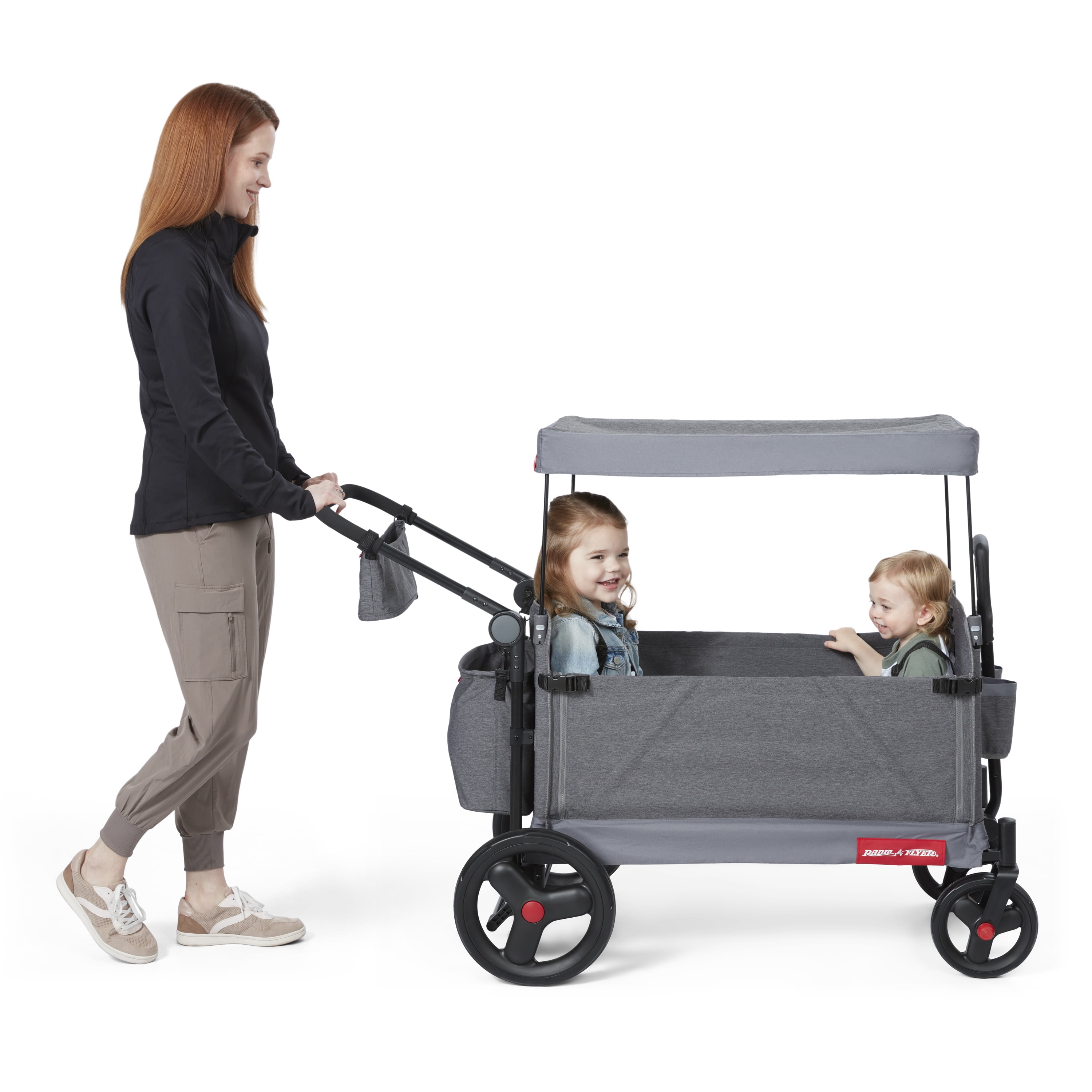 3 wagons in 1 – hauling, 2 rider seating, & bench seating Convenient push or pull steering Easy fold; wagon folds flat for easy storage 5-point safety harnesses and rear brake Internal pockets, rear storage bag, and parent caddy for maximum storage UV protection canopy rolls and stores on the wagon when not in use Front caster wheels for nimble steering and large, 12” easy push rear wheels Unisex design for all kids to enjoy! Maximum weight capacity 120 lbs. Recommended for kids and toddlers 1 year and up Assembled wagon dimensions: 47.2″ L x 24.4″ W x 41.3″ H Assembled wagon weight: 33.5 lbs. If you have any questions regarding your product, please contact Radio Flyer Customer Service at 1 (800) 621-7613 or email us at [email protected].