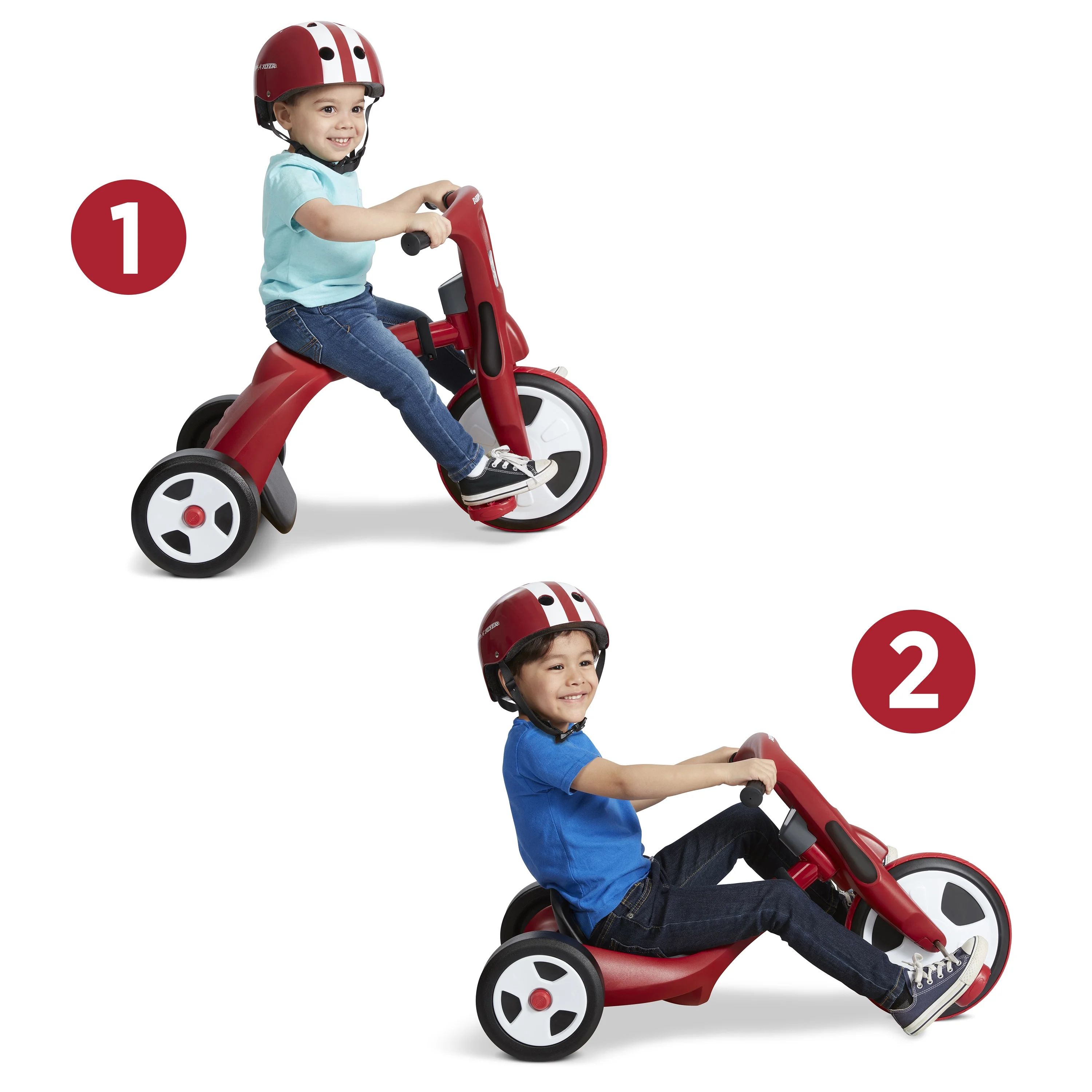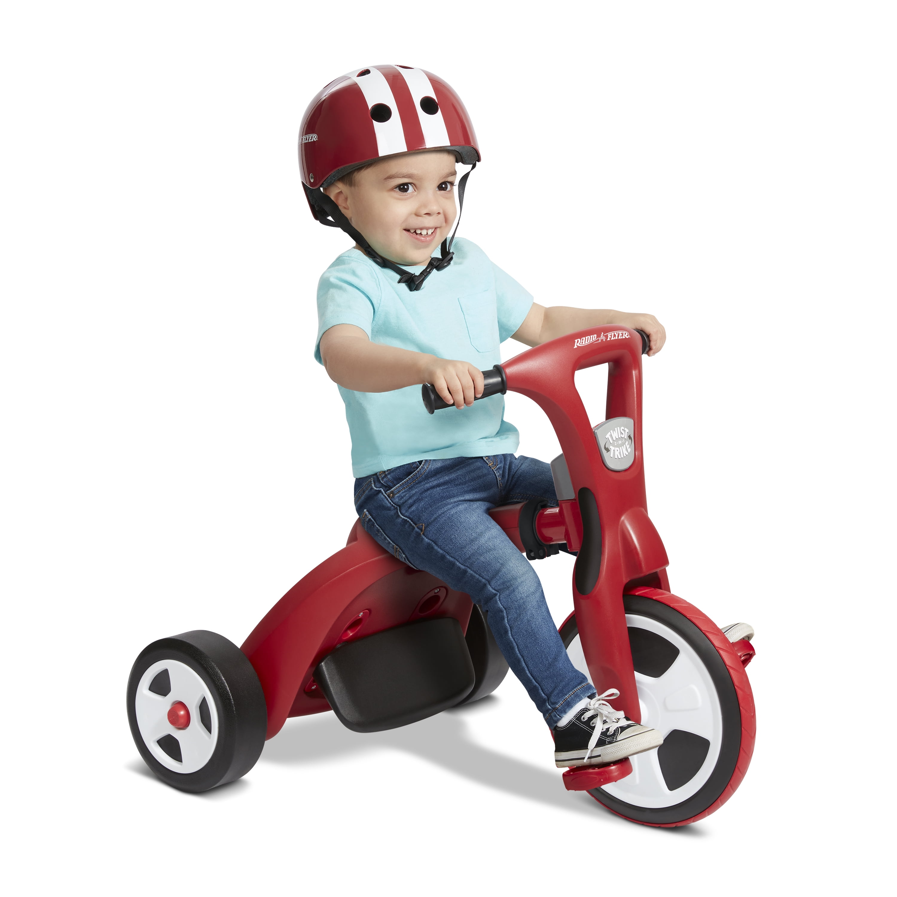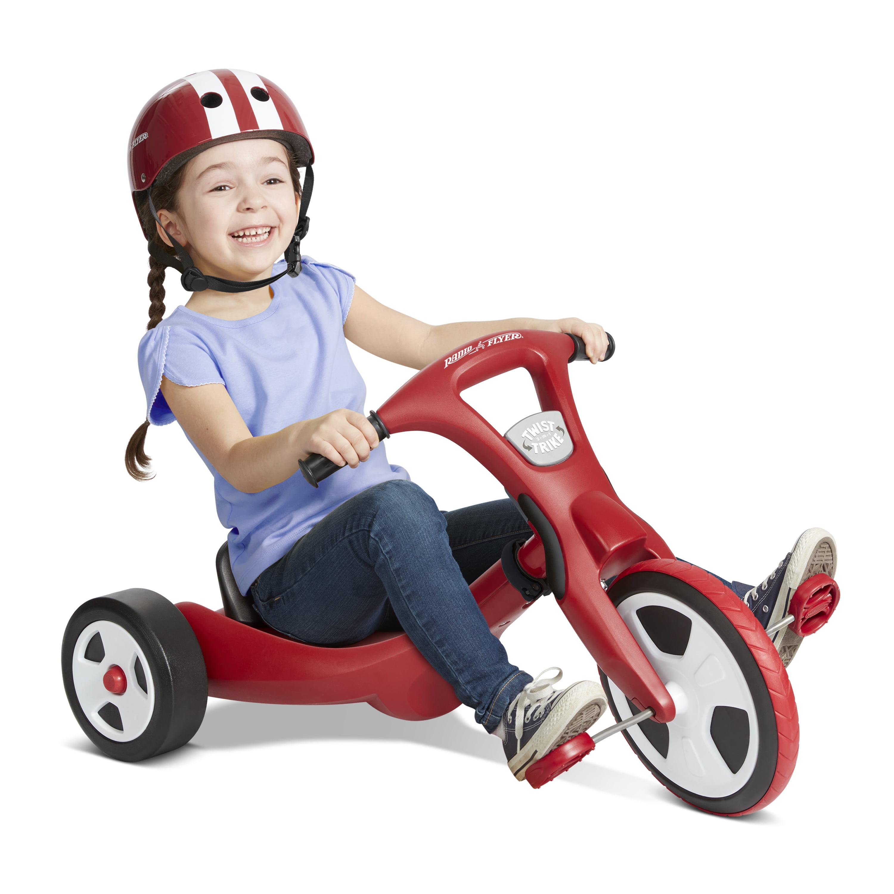 Two trikes in one – ride as a trike or a chopper for years of fun! Tool free transformation – Simply unlock & twist the frame or front wheel to switch modes – no tools needed! Adjustable seat in chopper mode grows with your child Traction tread on front wheel Comfort hand grips Unisex design for all to enjoy For boys and girls 2-7 years If you have any questions regarding your product, please contact Radio Flyer Customer Service at 1 (800) 621-7613 or email us at [email protected].