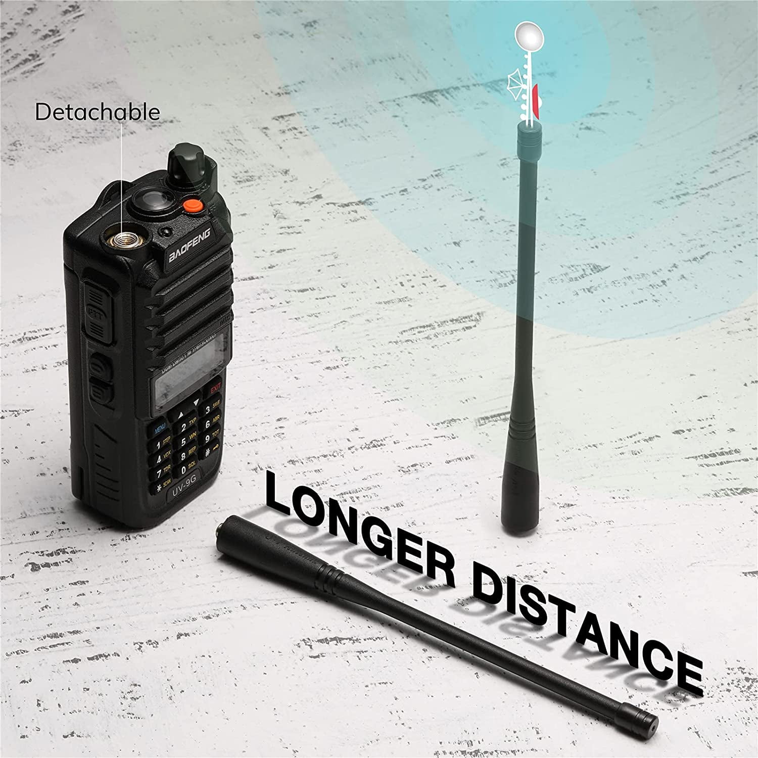 💦[Extend DIY CH] UV-9G has set 31-54 CH as DIY repeater channels except for the common 23-30 CH. So you have a total of 4 groups of repeating frequencies to set different CTCSS/DCS and reduce the interruptions. Have fun with your team! 💦[GMRS Version] New upgraded version of UV-9R / GT-3WP. UV-9G has 30 GMRS pre-programmed channels + 11 NOAA channels with weather radio alert function. UV-9G is ready to go, right out of the box even outdoors. FCC ID: 2AJGM-P52UV (Part 95E & Part 15B Certificated). VHF & UHF receiver. Compatible with all FRS/GMRS radios. 💦[IP67 Waterproof] With better waterproof and dustproof ability than old models, UV-9G can be submerged in water up to 3ft/1m depth for 30 minutes without any damage. Just choose UV-9G at a lower cost and better quality when hiking, kayaking, boating, etc. 💦[Long Range for Adults] Up to 5 miles talking range without GMRS repeater. While using UV-9G with a GMRS repeater, it can catch a further-ranging signal. Brave the heavy weather whether by land or by sea, just count on this semi-rugged waterproof comm. and keep your team in connected. Antenna detachable, you can replace it to test longer talking distance. 💦[Programming Cable Included] UV-9G comes with a original programming cable (328 Moto- Jack). You can easily ham it up via keypad manual or PC (Just ask to send the software). The bright flashlight and tri-color LCD display provide a clear look in dark. Besides, it’s with VOX hands-free calling function. 💦[NOAA Weather Alert Radio] No cellular signals in adventures? UV-9G can stand by 24/7, send instant alerts, and wake you up from dreams. The NOAA function requires only a little power from the 1500mAh battery. With above exceptional capabilities, UV-9G is cool stuff if you’re finding a survival radio.