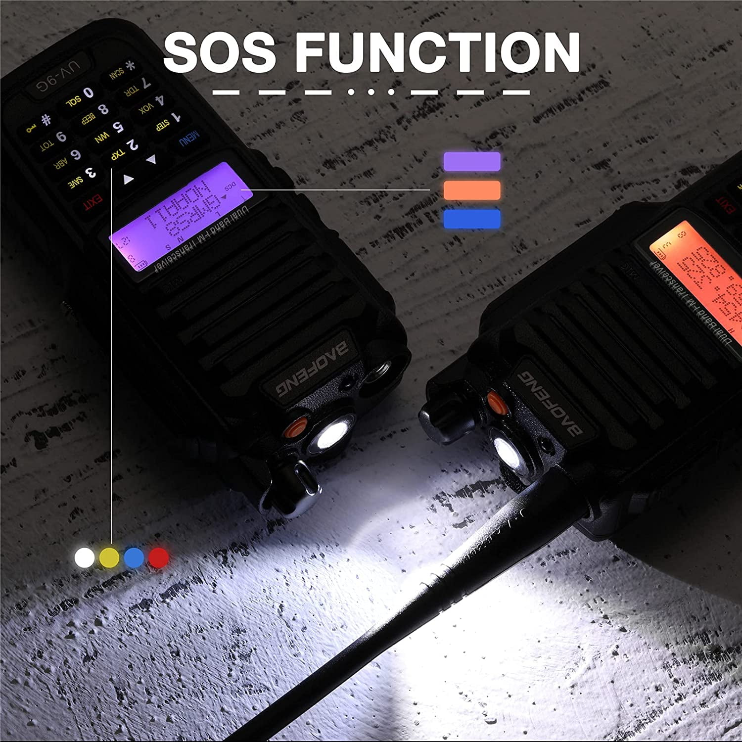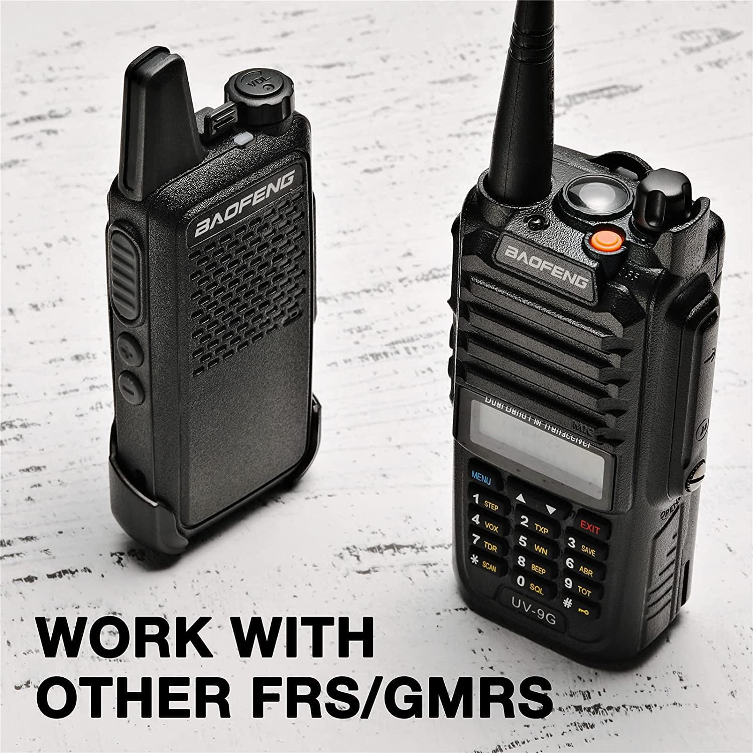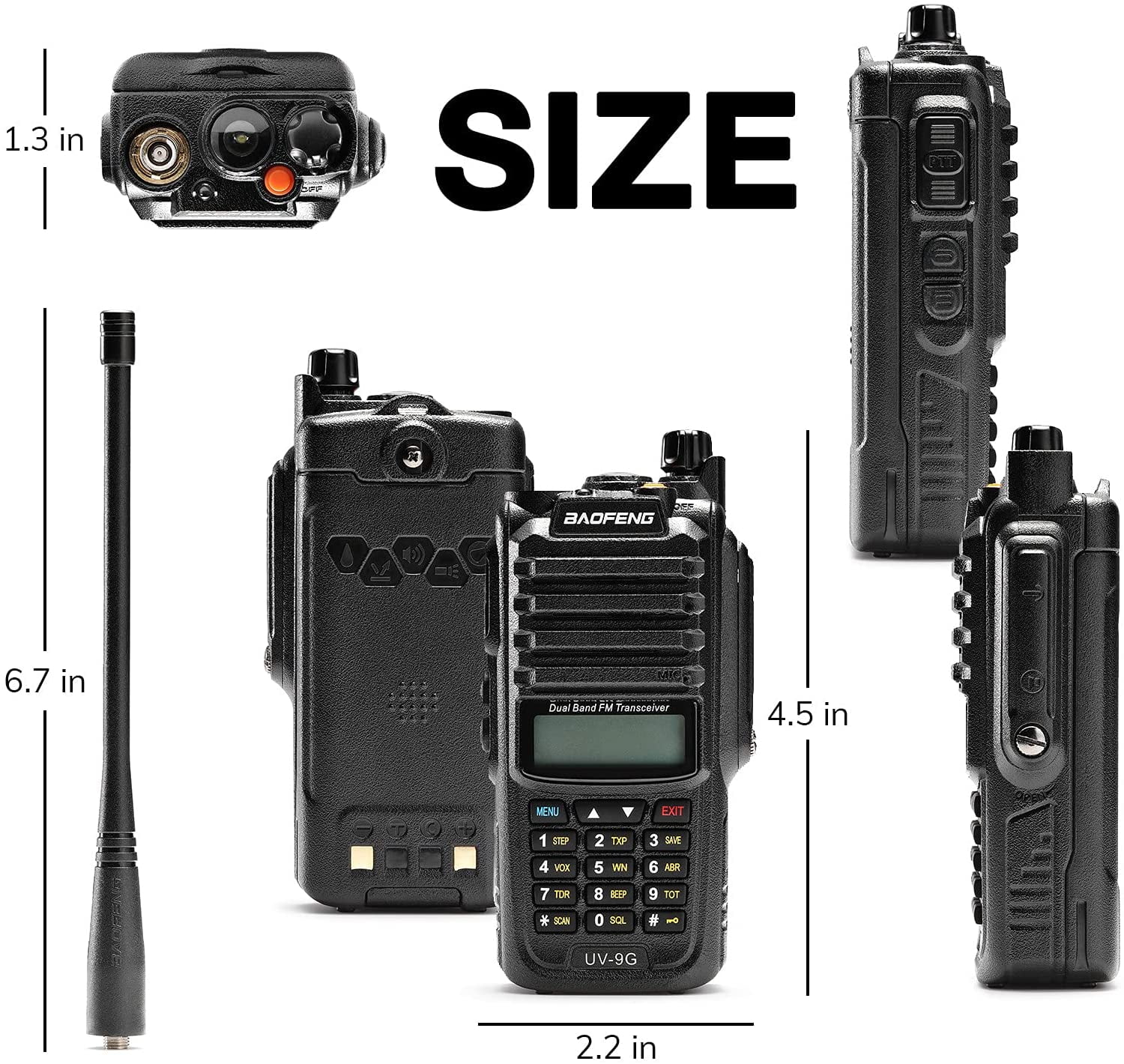 THE UPGRADE LOG [202110] What FIXED in the latest stock? Problem: CTCSS/DCS was activated when open the box. →→ ✔️ FIXED. Now CTCSS/DCS is OFF in factory setting. Problem: All channels were set to narrow-band. →→ ✔️ FIXED. They’re wide-band now (except CH8-CH14). Problem: The screw on the programming port is hard to remove, but easy to be lost. →→ ✔️ Get it. A spare screw is added into the package, there are total two screws for users now. What’s on our 2022 TO-DO-LIST? Improve the DIY channels setting (for the moment you can only set it from 1 to 8 in order). Fix the “#” key so you can change power setting via this button. Fix the antenna interface (for the time being it’s not quite fit for other SMA-M antennas). Make UV-9G available on CHIRP. Remarkable IP67 Waterproof: Something with real water-resistant may be necessary for every outdoorsman in hiking seasons. Even dropped in puddles for 30 minutes, the UV-9G GMRS radio can still work normally without any complex drying progress. Just try UV-9G rather than risk one of your high-priced radios outdoors. Durable Two Way Radio for Adults: Given the substitution metal interior construction, the screw-down attachments over the plastic casing, and the rubberized accessory port covers, the UV-9G is a solid, fairly heavy radio that fits in an adult’s hand well. Suitable for camping, hunting, fishing, biking, etc. Just enjoy your wildest adventures with it! Longer Standby The 5-level power save feature enables a reduction of battery consumption when on standby. Strive for a longer communication duration and rescue time as much as possible. SOS Flashlight Light up your way in the dark. If you have no other choice in an emergency, activate UV-9G flashlight, signal S.O.S. for help flashlight for help: fast 3 times, slowly 3 times, and then quickly 3 times. Bright Backlight Like UV-9R Plus, the UV-9G has a backlit keyboard. This is a feature that most people will find indispensable once they’ve used it outside of well-lit areas. Weather Warning “The wise see danger ahead and avoid it. ” 24/7 standby, UV-9G keeps updating and sending alerts, ensuring your travel safety. It can automatically scan 11 NOAA weather channels with low power usage. What battery fits UV-9G? BL-9 Battery What’s in the Box: 1 x UV-9G GMRS Ra