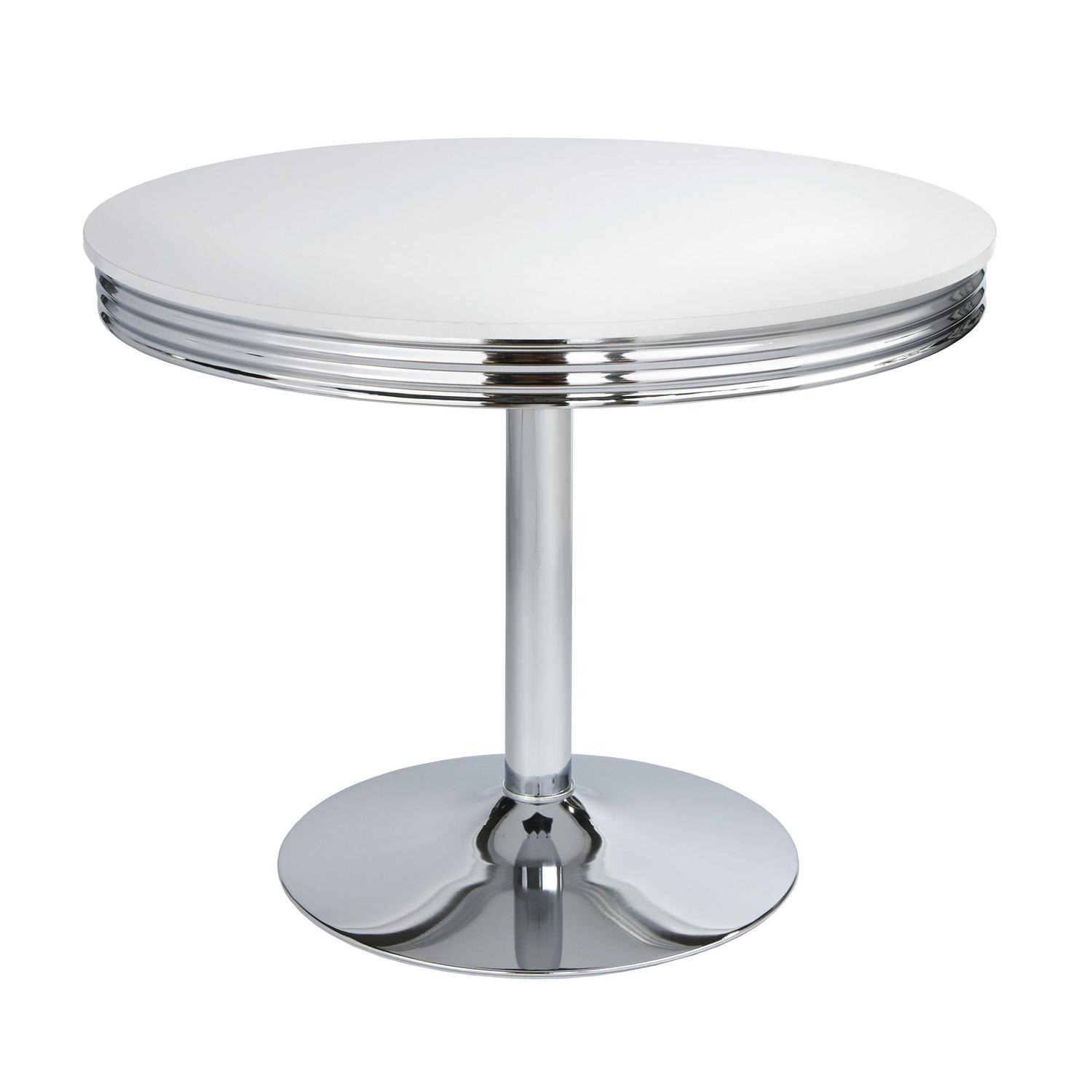Create a retro themed decor with this Raleigh Retro Dining Table. It is perfect for small spaced room. The glossy white top with laminated MDF makes a fashion statement. The pedestal base and edges of the tabletop are plated in chrome