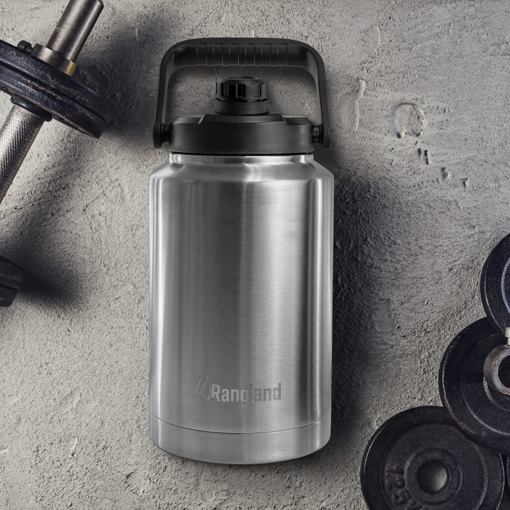 Rangland 1 Gallon Water Bottle with Insulated Storage Sleeve, 128 oz Stainless Steel Growler for Hot/Cold Drinks for Sports and Outdoors