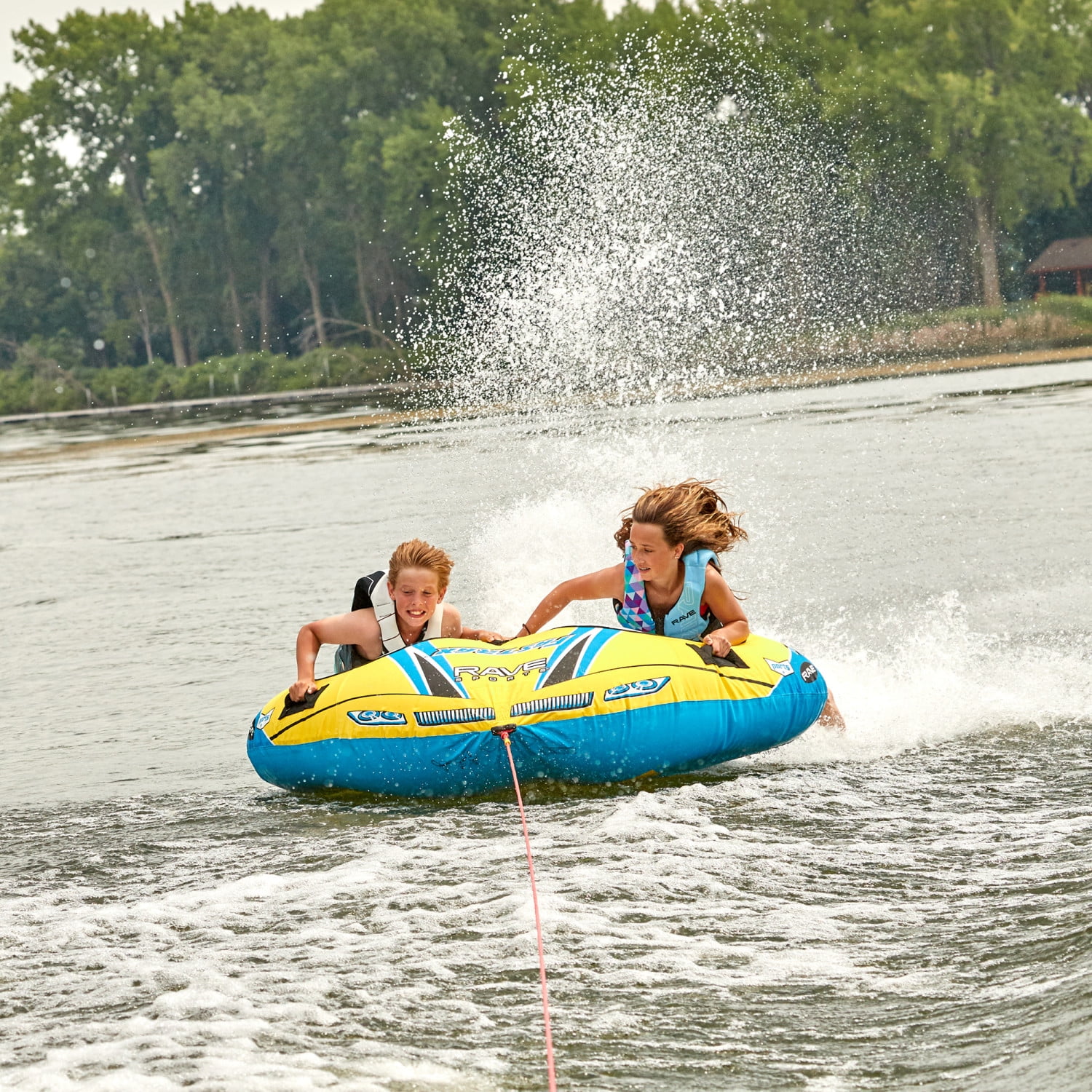 The Fastrax dual donut style tow tube features a Skim-Fast™™ bottom that provides a slick and fast ride making it easy to plane and skim across the wake, four handles, and a quick connect tow point. We added extra excitement with the RAVE Tail™ that shoots water high into the air and alerts other boaters that tubers are under way!