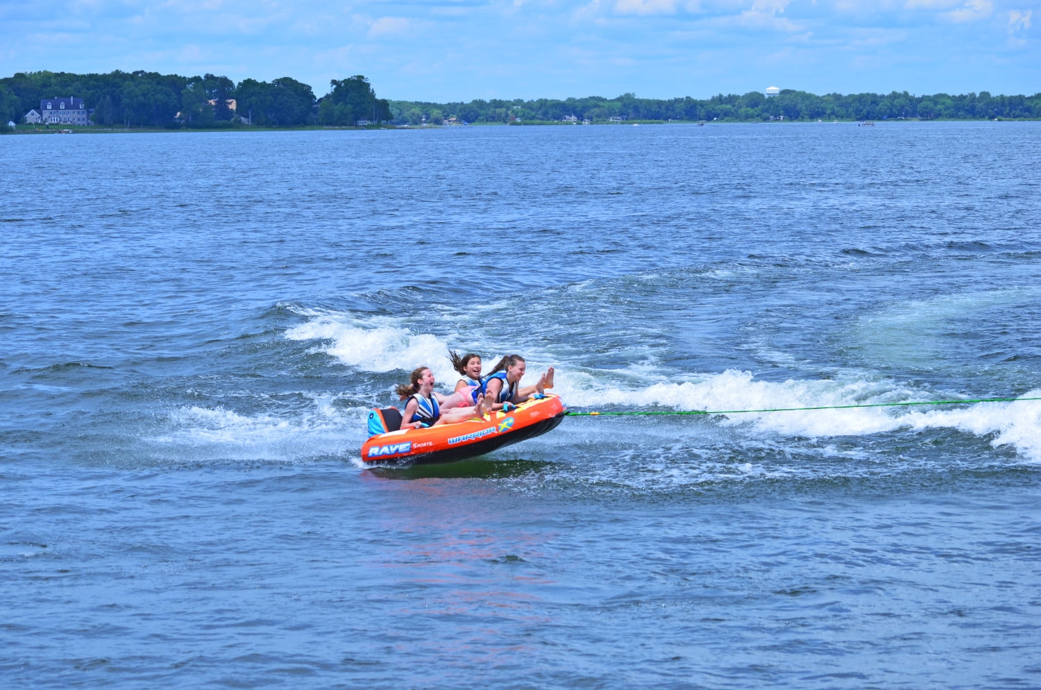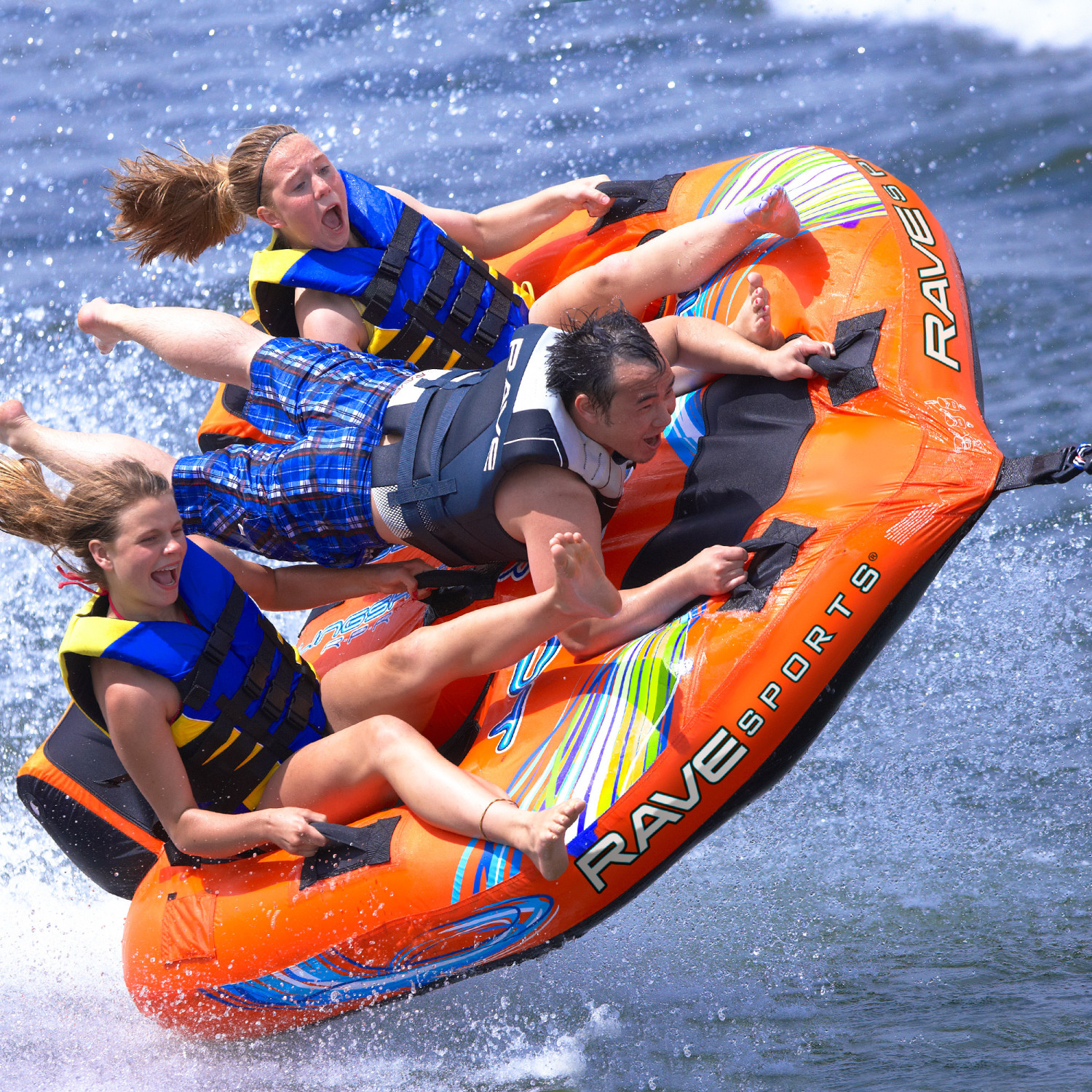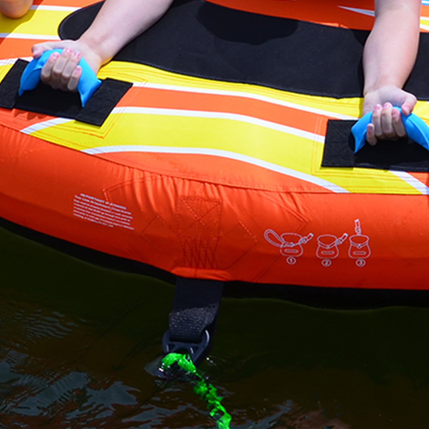 The unique design of the Warrior X3 tow tube allows for two sit on top riders and one prone with a large anti-chafe guard to protect elbows, 6 handles, and a quick connect tow point. Laughter and smiles will be contagious on this durable, long lasting three rider tow tube!
