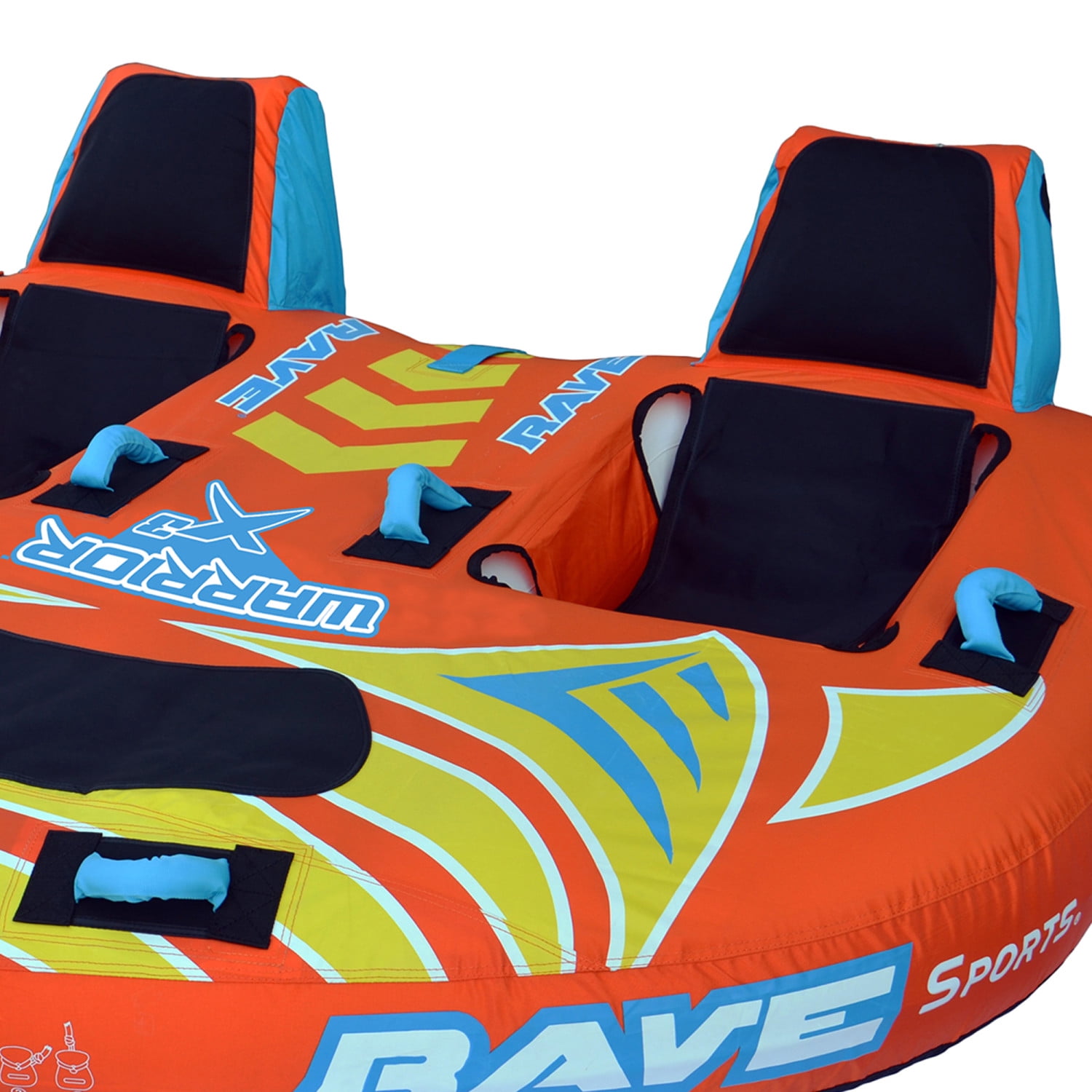 3 Rider Towable 510 lbs. (231 Kg) max rider weight Start your day of adventure on the exciting Warrior X3 towable tube! 65″ x 76.75″ x 22.5″ (165cm x 195cm x 57cm) inflated70″ x 80″ (178cm x 203cm) deflated Heavy duty 28 gauge PVC bladderDurable 840D Nylon Cover