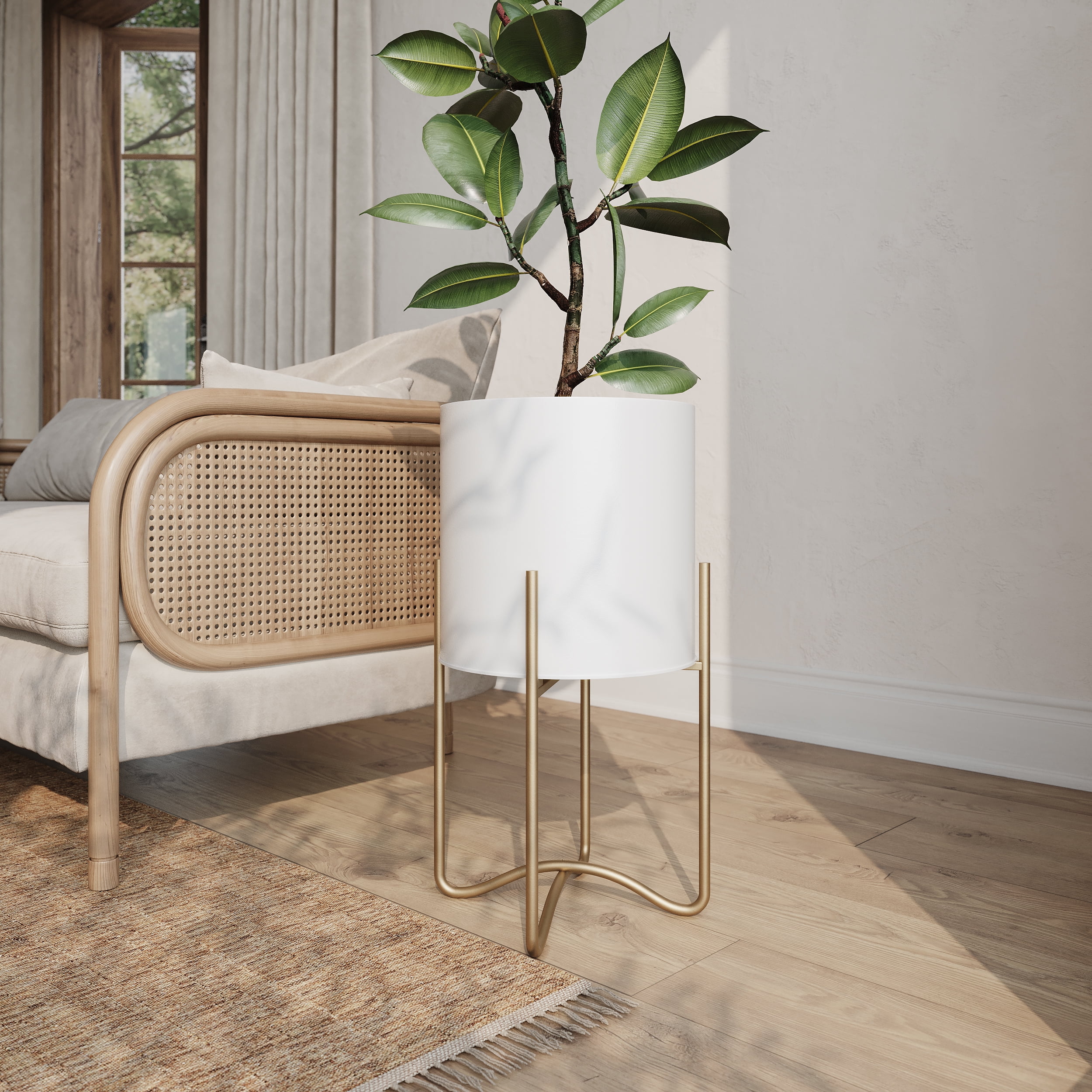 The Raya White Mid-Century Modern Planter with Tall Metal Base is a durable and elegant plant pot with stand. This all metal pot creates depth and style in your room while providing a functional pot for a variety of indoor plants. The Raya planter has smooth curves emphasizing the minimal aesthetic of mid-century modern decor. The planter sits on a tall metal base, creating the illusion of more space in your room. The round planter can accommodate medium to large-sized plants, while the touch of gold in the tall metal plant stand adds elegance to your decor.