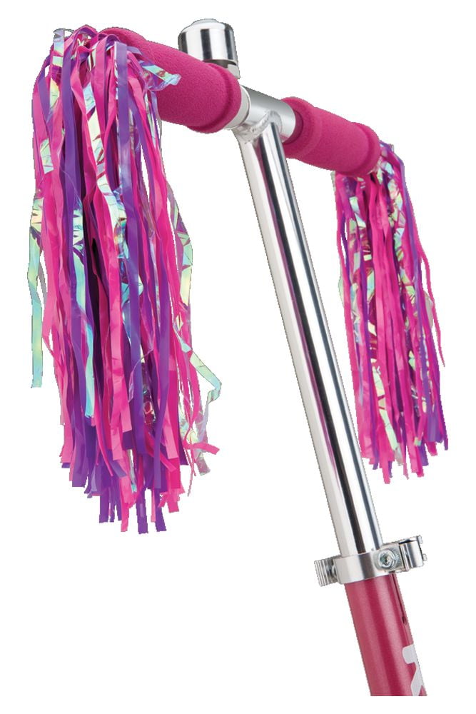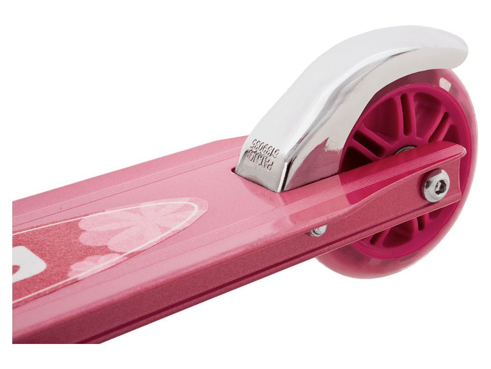 Top quality aluminum construction of the Razor A kick scooter is lightweight yet durable Features our original folding mechanism for quick and easy carry, transport and storage between rides Easy-adjust handlebars can be set to the perfect ride height Additional features include rear-fender brake and urethane wheels Sweet Pea model includes bell and streamers T-Tube/Deck: Aluminum Handlebars: Adjustable-height, folding Grips: Foam Downtube: Folding Wheels: Urethane Brake: Rear-fender Age: 5+ Age Group: Child, Tween Max Rider Weight: 143 lb (65 kg) Assembled Product Dimensions: 23.9” x 11.3” x 32.4” (607 mm x 288 mm x 823 mm) Product Weight: 4.62 lb (2.1 kg)