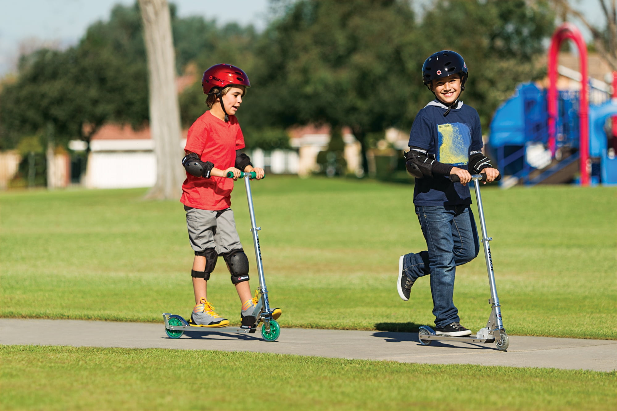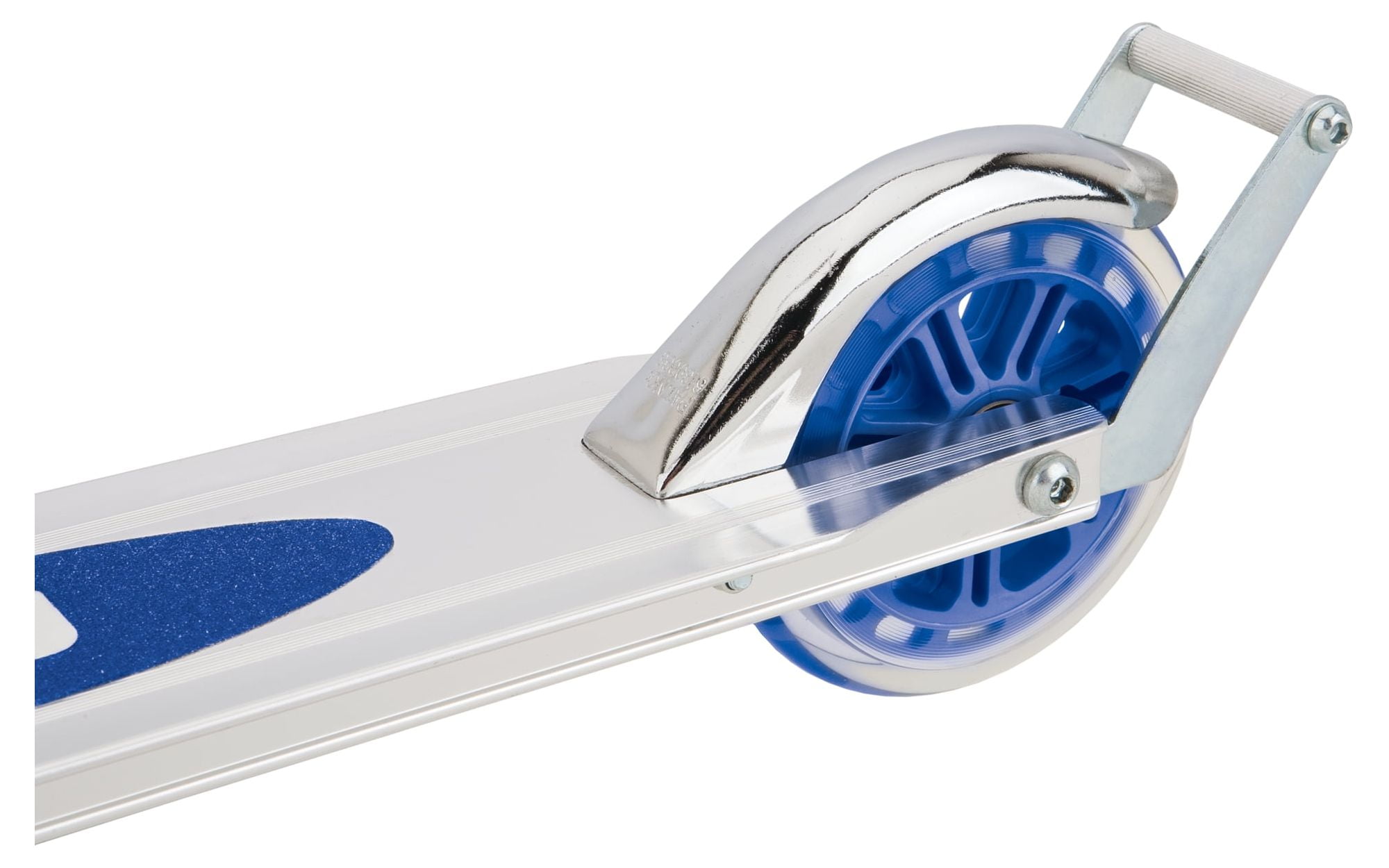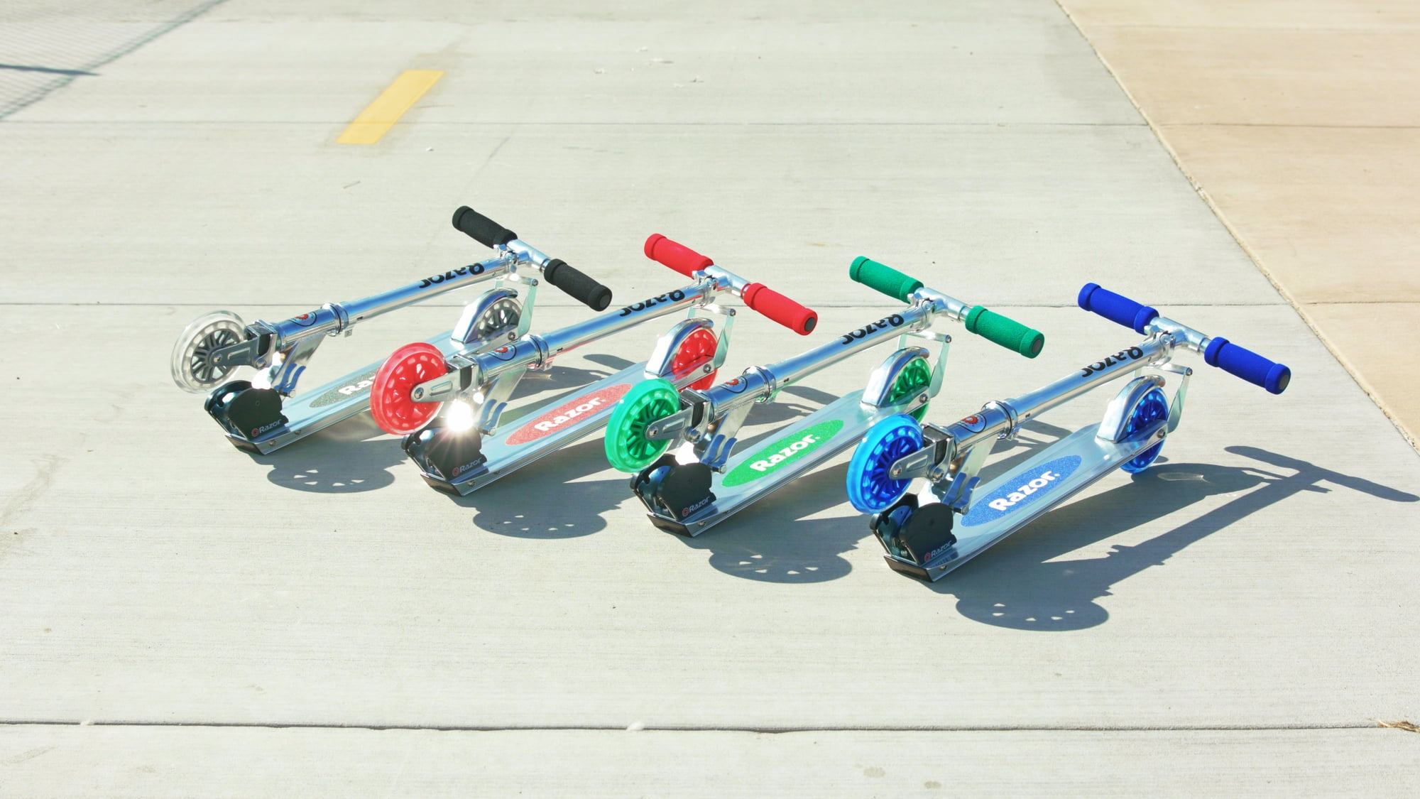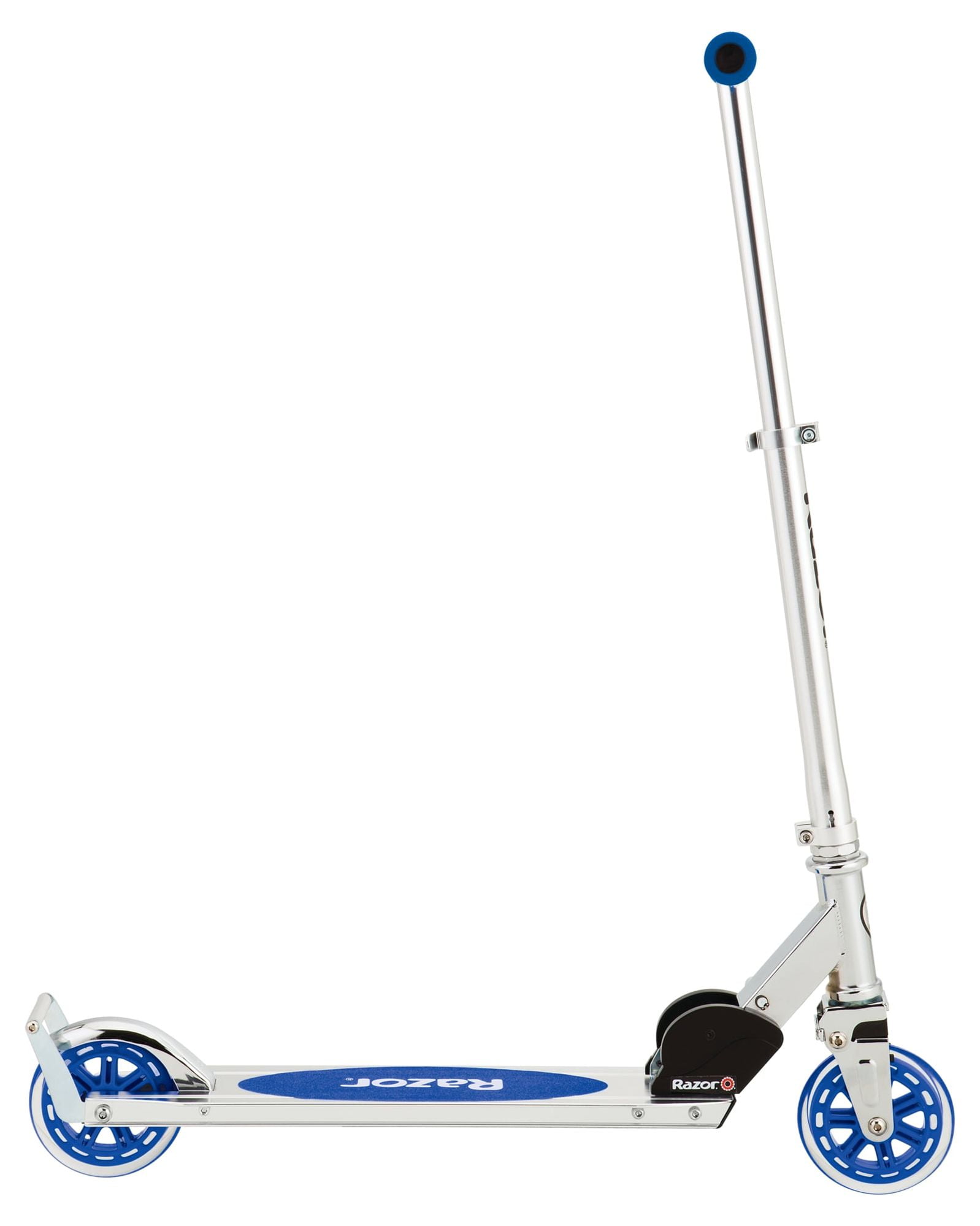 Made of top-quality aluminum, the A3 kick scooter is an upgraded version of the original Razor A kick scooter, with larger wheels and front vibration dampening suspension system to ensure a smoother ride and a wheelie bar for tricks. The scooter can be smoothly stopped by stepping on the rear-fender brake, on to urethane wheels. No assembly required, ready to ride out of the box, just unfold, set the handlebar height, and go! While there are many products out there, choose Razor, a brand America knows and trusts. Accept no imitations. This is a smooth and fun ride that anyone can enjoy.
