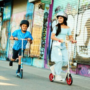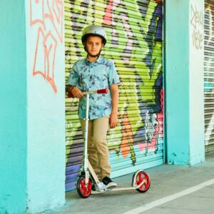 The Razor A5 Lux joins a kick scooter line well-known for its smooth ride, extra-large urethane wheels and cool profile make for the smoothest ride around. Anodized finish features bold colors and attention-grabbing graphics. Quick and easy to fold and ready to go, the Razor A5 Lux has a super-strong aluminum t-tube and large deck to comfortably support riders up to 220 pounds (100 kg). No matter you’re looking for a kick scooter for kids, teens, or even adults, the Razor A5 Lux is a lightweight kick scooter that will deliver.