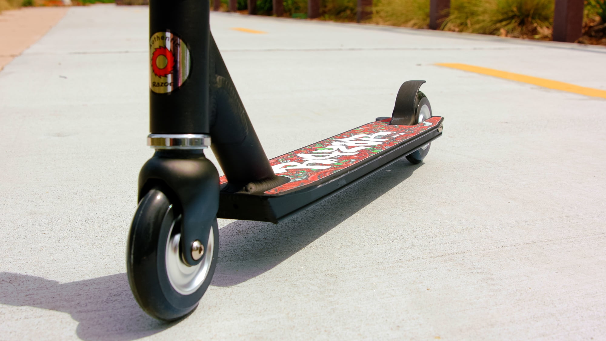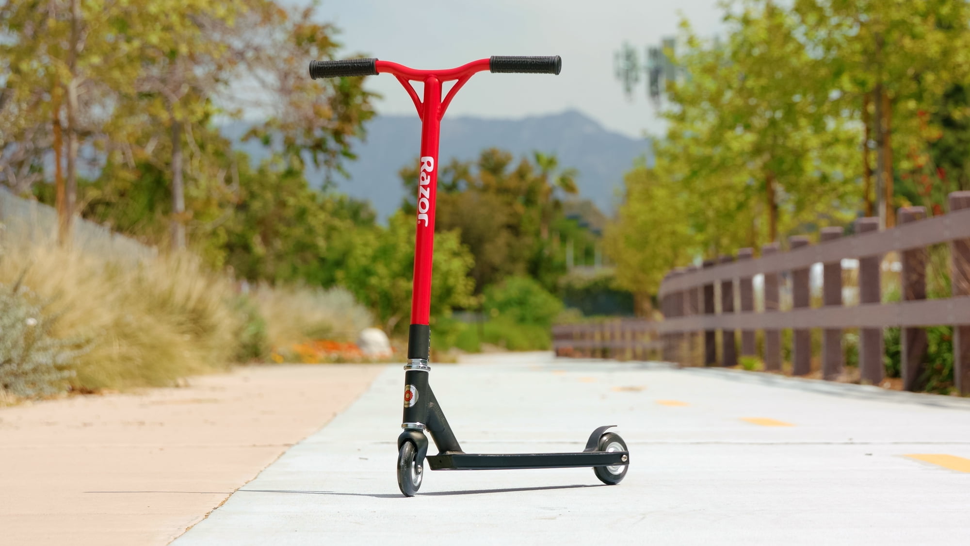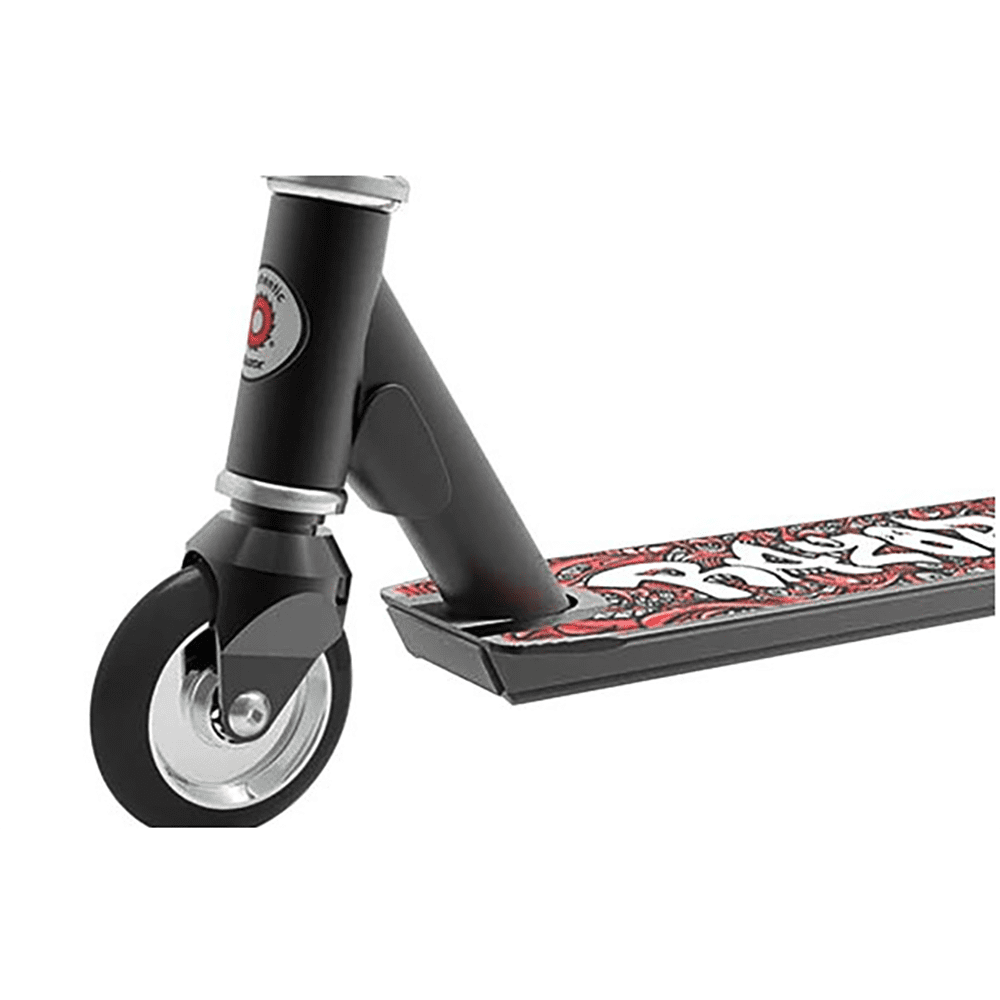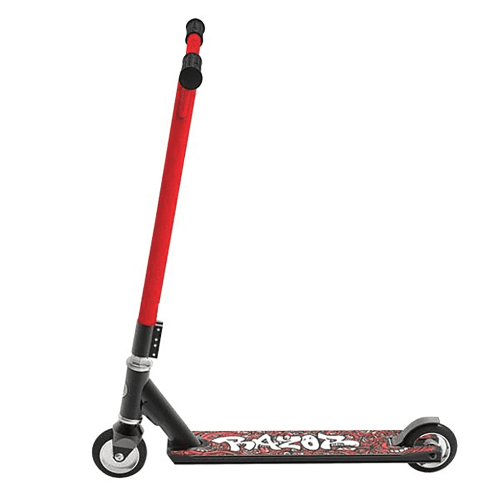 Razor Beast V6 Sport Scooter. Roar onto the scene, throwing down tricks like a pro, on the Razor Beast V6 sport scooter! A pro-style stunt scooter for more advanced riders, the Beast V6 features custom-designed graphics on a pro-style, aluminum deck, a fixed, riser-style handlebar, soft, rubber grips, and 100 mm, solid core, urethane wheels with smooth-rolling bearings for a fast ride and sick stunts. Rule the skatepark on the Beast V