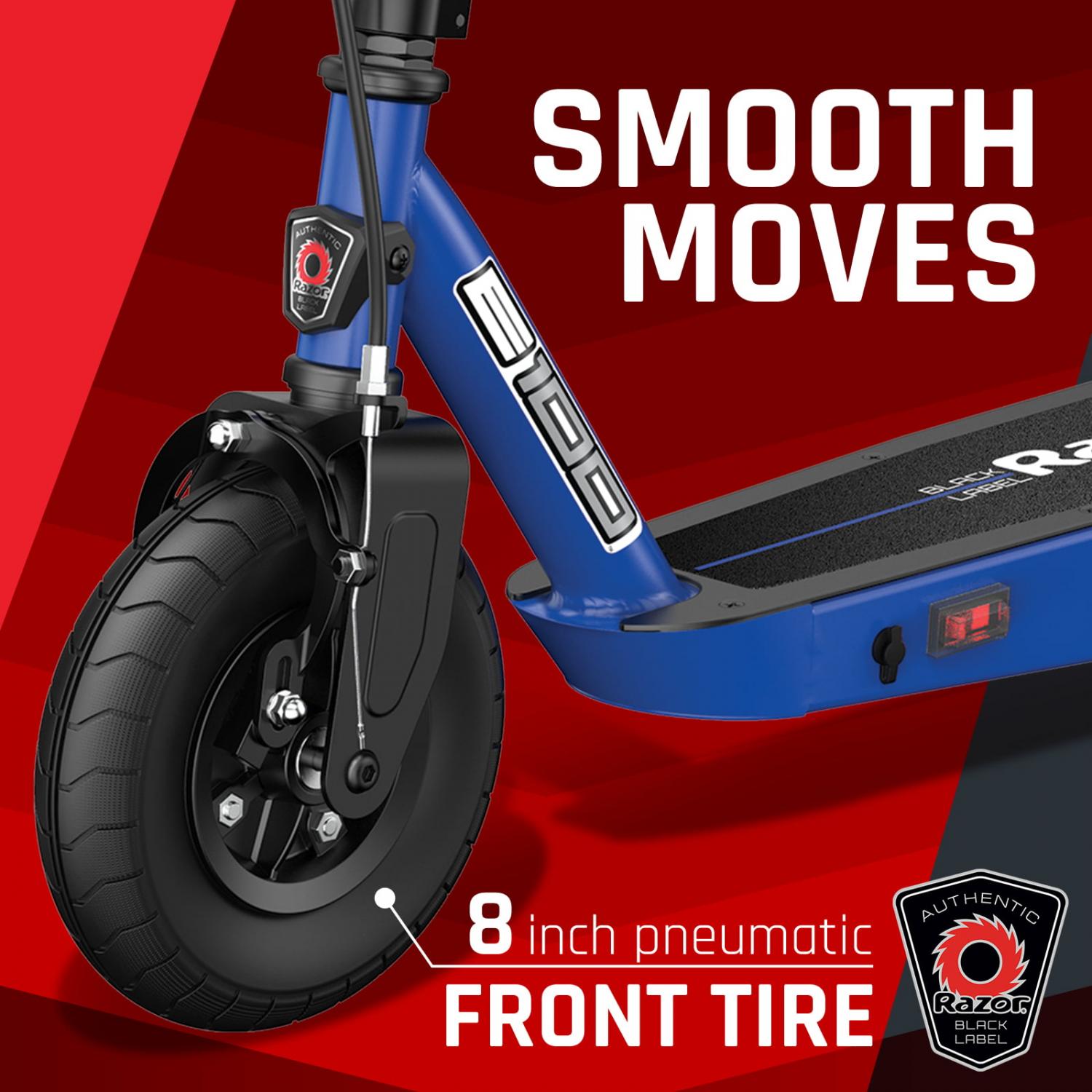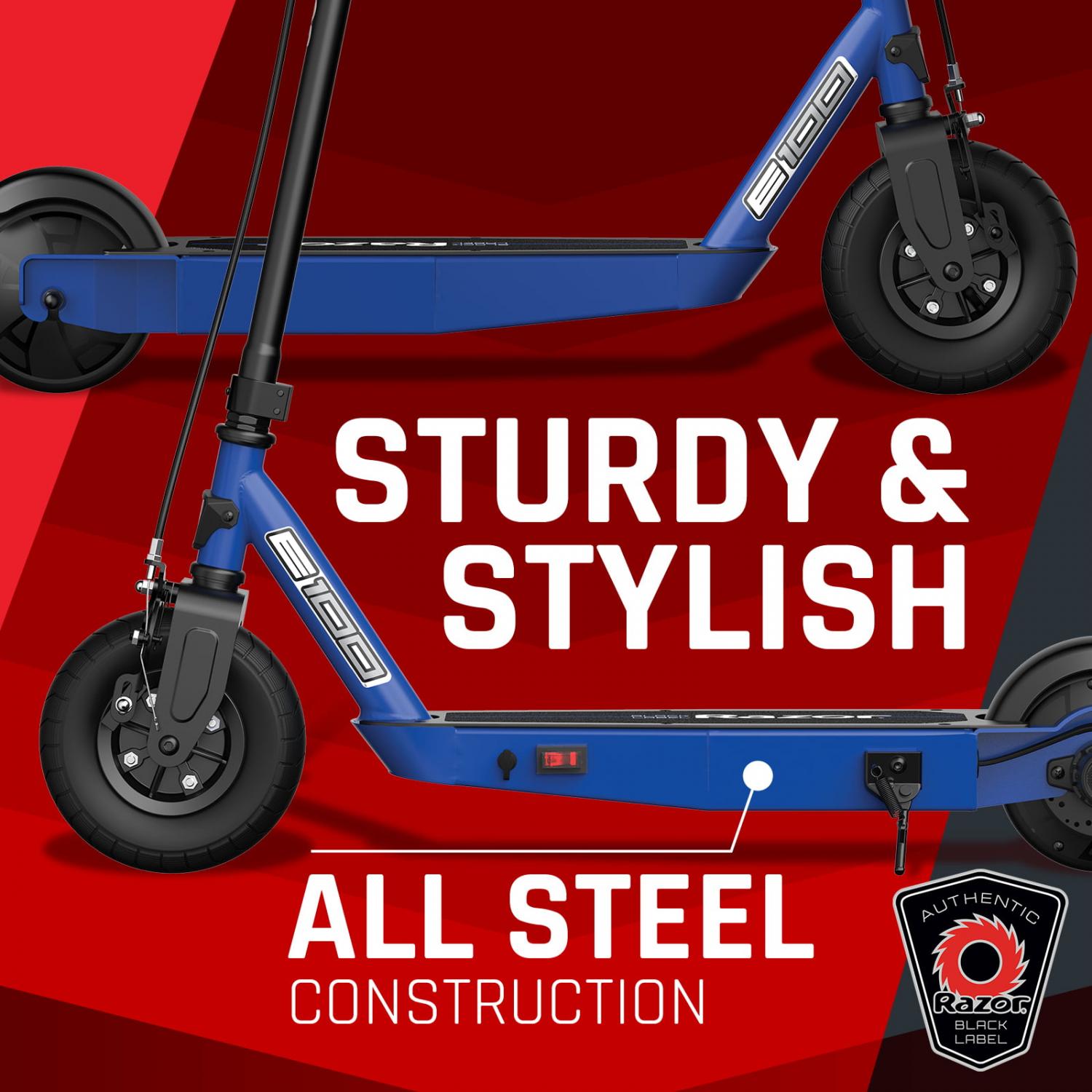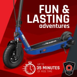 Razor Black Label E100 Electric Scooter – Blue, for Kids Ages 8+ and up to 120 lbs, 8 Pneumatic Front Tire, Up to 10 mph and up to 35 mins of Ride Time, 90W Power Core High-Torque Hub Motor