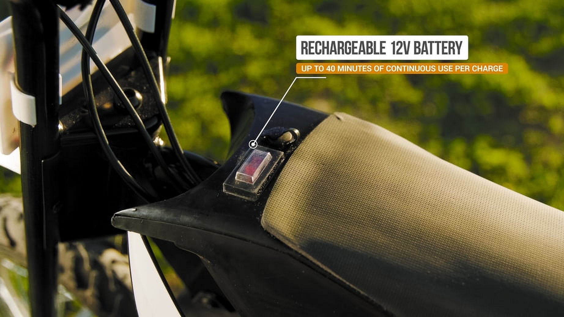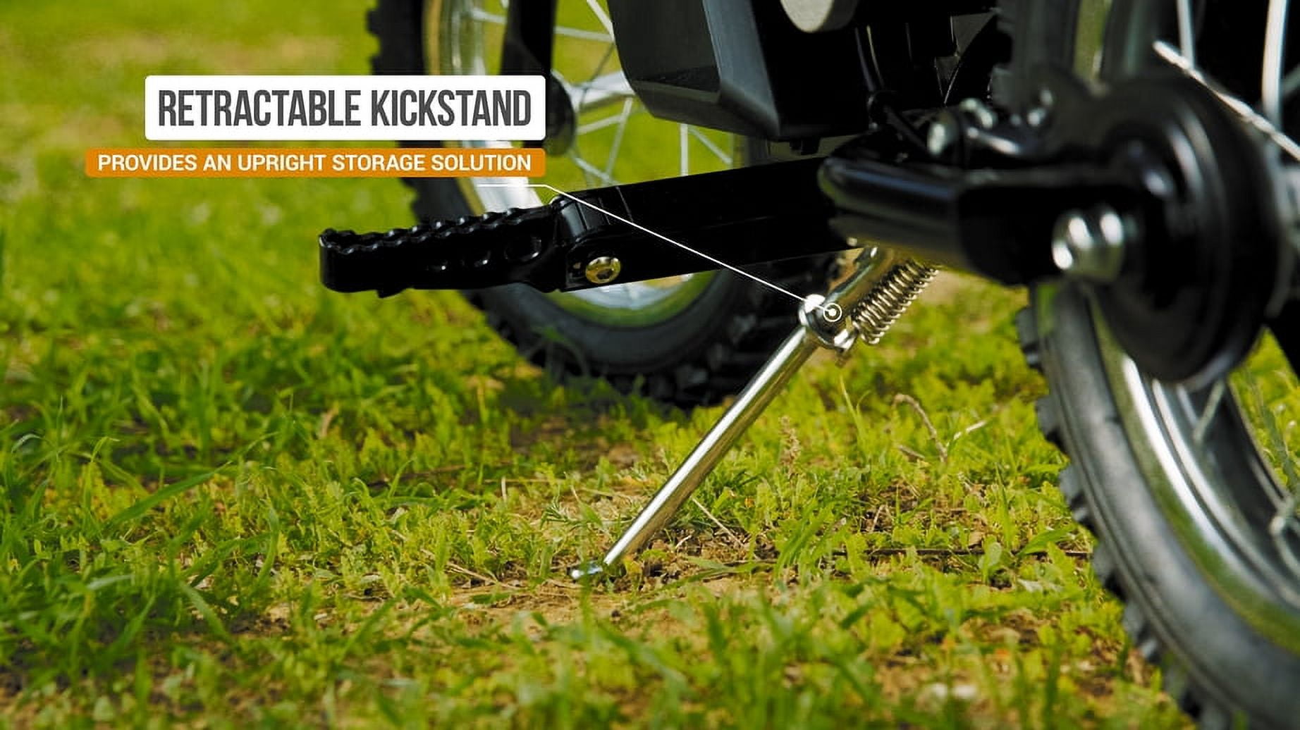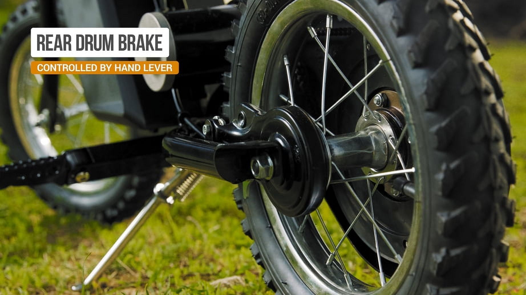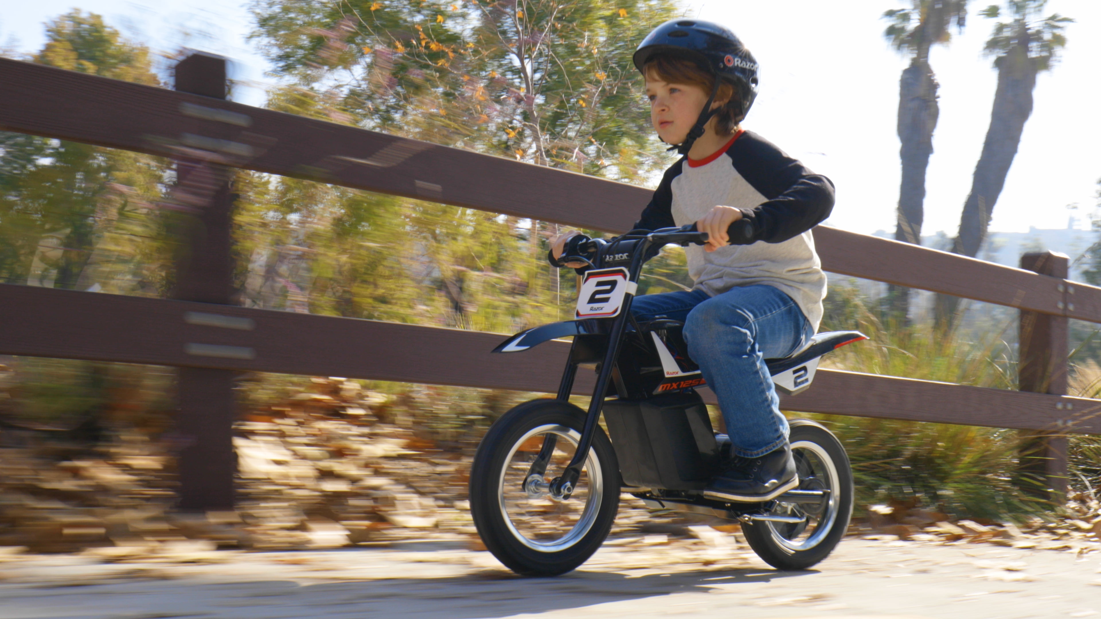 The MX125 is Razor’s smallest electric dirt bike, scaled down to size for riders ages 7and up Designed with motocross dirt bike geometry, knobby tires and twist-grip throttle Rear-wheel drive delivers better balance control and traction for a safer, more stable ride Carries riders at speeds of up to 8mph (13km/h) with up to 40minutes of continuous use Features a crossbar reinforced handlebar, spoked wheels with 12” pneumatic, knobby tires, retractable kickstand, and hand-operated rear brake Range- Up to 5 miles on a single charge Includes a 12Vsealed lead-acid rechargeable battery Speed: Up to 8 mph (13 km/h) Run Time: Up to 40 minutes of continuous use Motor: 100 watt, high-torque, chain-driven, rear-wheel drive Throttle: Twist-grip Brake: Hand-operated, rear Frame: Steel with authentic dirt bike geometry Fork/Handlebars: Steel Fairings: Shatter-resistant, plastic Grips: Foam Wheels: Spoked with 12” pneumatic, knobby tires Kickstand: Retractable Foot Pegs: Folding, metal Battery: 12V sealed lead-acid, rechargeable Electrical system certified compliant with UL2272 by ACT Lab LLC, an accredited testing lab. Includes: Battery charger Age: 7+ Max Rider Weight: 110 lb (54 kg) Some Assembly Required Assembled Product Dimensions: 36.42” (925mm) L x 21.46” (545 mm) W x 25.16” (639 mm) H