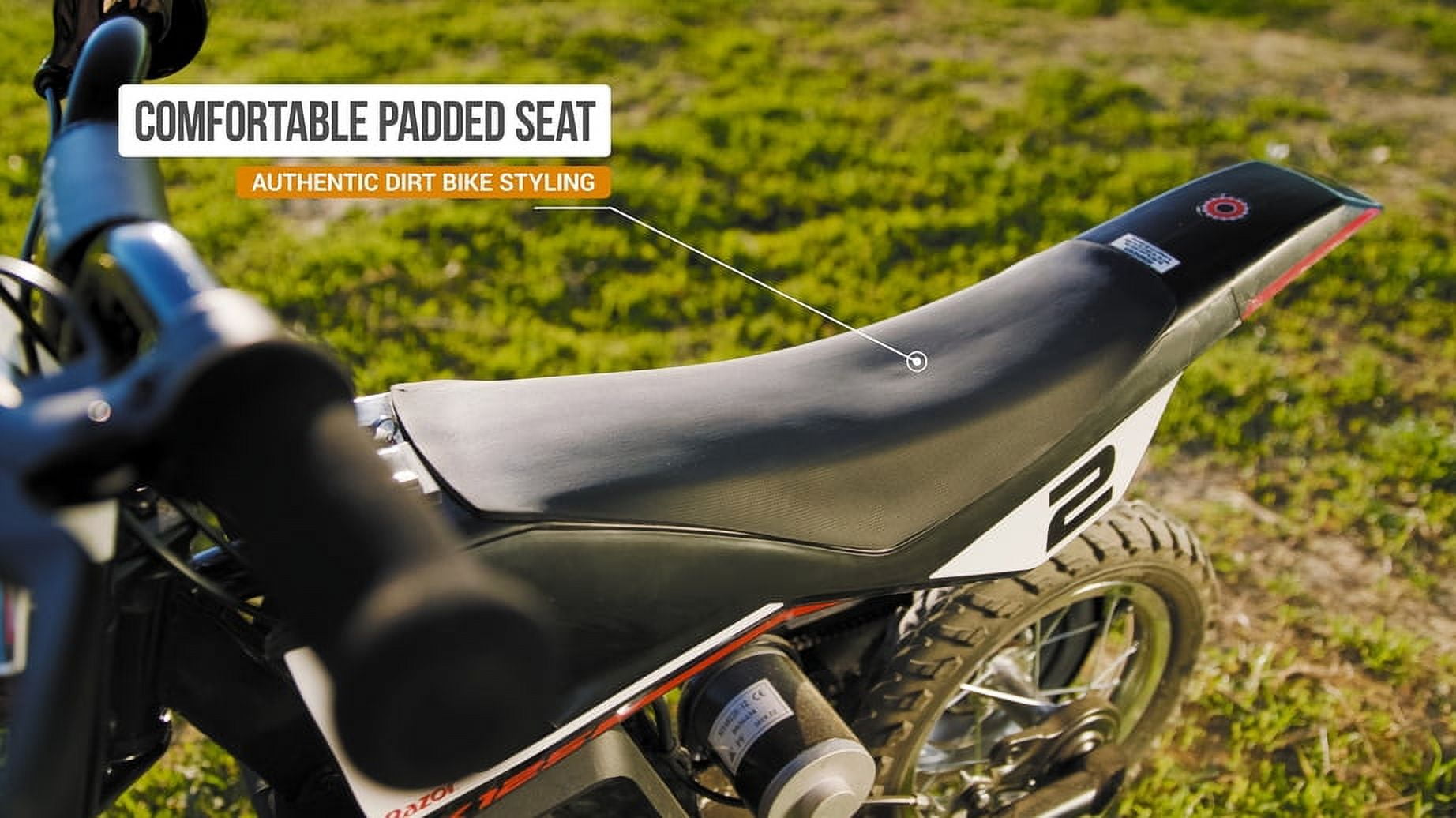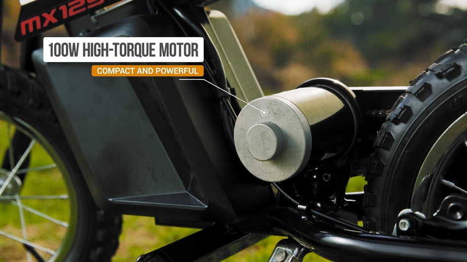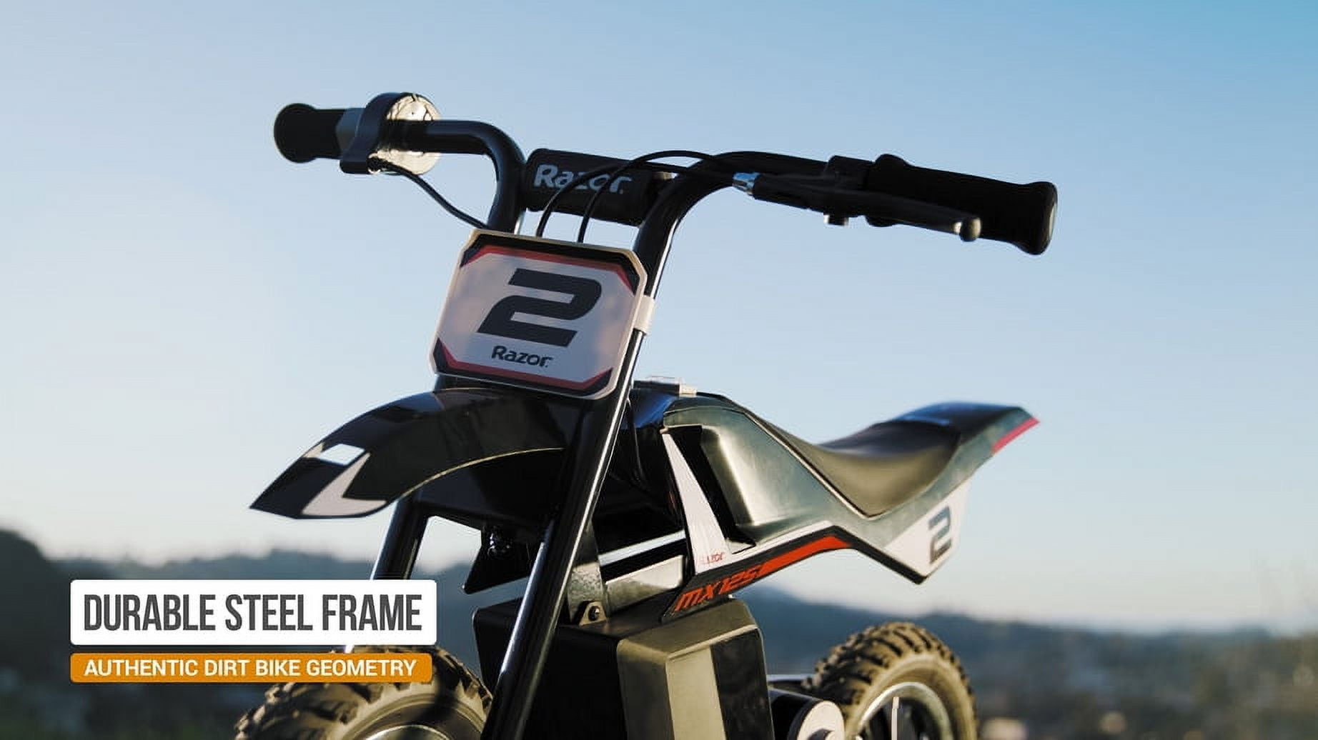 The MX125 Dirt Rocket is your intro to adventure, offering the adrenaline pumping fun of off-road riding in a scaled-down size designed for dirt bike riders ages 7 and up. Razors smallest electric-powered dirtbike, the MX125helps younger riders build confidence on dirt, delivering top-notch performance with authentic MX-frame geometry, motocross-style knobby tires and twist-grip throttle for a true-to-life dirt bike ride. Rear-wheel drive delivers better weight and balance control for greater safety and stability, while the high-torque, chain-driven electric motor powers riders up to 8mph 13km-h for up to 40minutes of continuous use. Its the perfect introduction to the excitement and adventure of off-road riding.