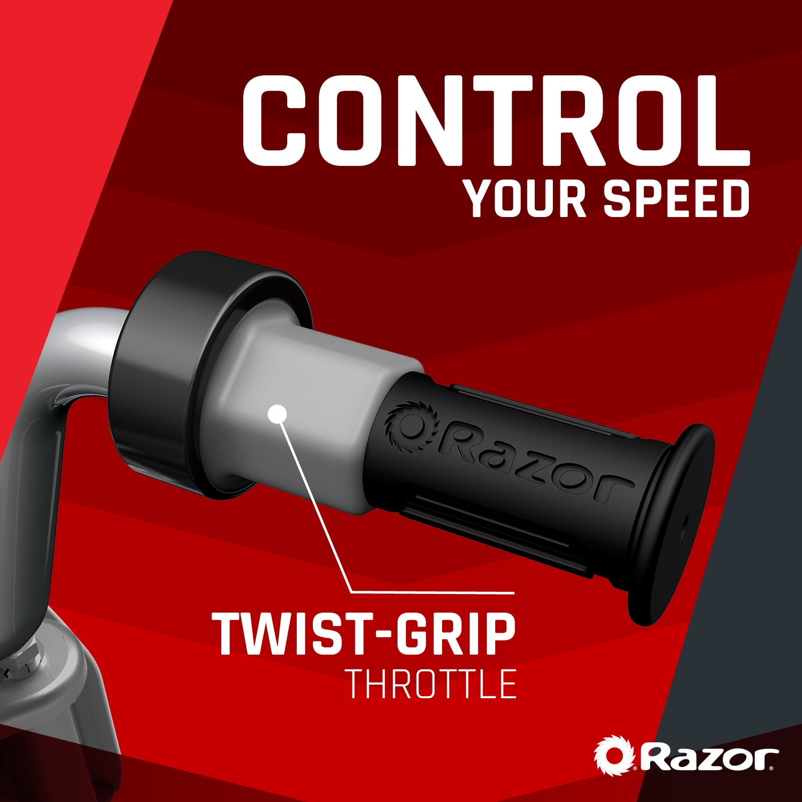 Kick start your off-road adventures with the Razor MX350 Dirt Rocket. The scaled-down, electric powered dirt bike is the perfect start for the next generation of motocross riders, combining top-notch performance with true to life motocross design. Designed with rear-wheel drive for better traction and balance control, the high-torque, chain-driven electric motor powers riders up to 14 mph (22 km/h) for up to 30 minutes of continuous use, while the authentic MX-frame geometry, knobby tires and twistgrip throttle prepare riders for adventures on dirt.