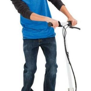 Twist the throttle to crank up the fun with the Razor E300 electric scooter. Top of the line and the talk of the neighborhood, the E300 s super-sized deck and frame are built to stand up to the adventurous abilities of responsible teen and adult riders. Leave other rides in the dust with 250 watts of high-torque, electric punch, hitting speeds up to 15 mph (24 km/h) for up to 40 minutes of continuous use. The E300 features an all-steel frame and fork for durability and larger 9 (229 mm),pneumatic front and rear tires to take the bite out of rough surfaces. And, with its twist-grip acceleration control and hand-operated,rear brake, the E300 puts power and control in your hands.