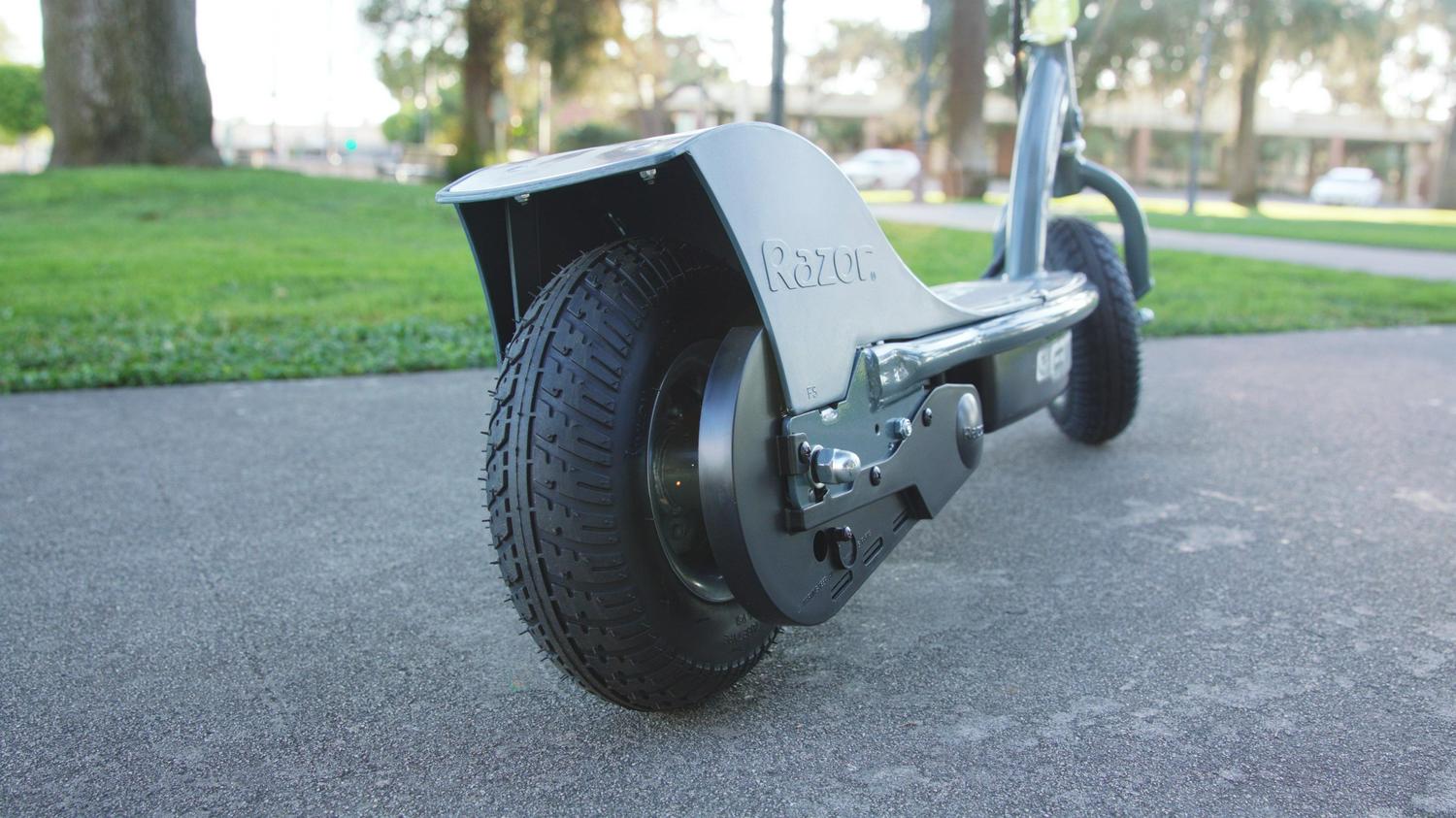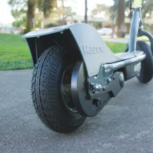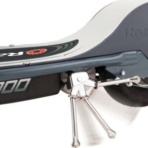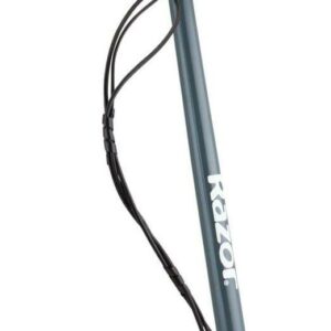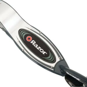 Twist the throttle to crank up the fun with the Razor E300 electric scooter. Top of the line and the talk of the neighborhood, the E300 s super-sized deck and frame are built to stand up to the adventurousabilities of responsible teen and adult riders. Leave other rides in the dust with 250 watts of high-torque, electric punch, hitting speeds up to 15 mph (24 km/h) for up to 40 minutes of continuous use.The E300 features an all-steel frame and fork for durability and larger 9 (229 mm), pneumatic front and rear tires to take the bite out of rough surfaces. And, with its twist-grip acceleration control and hand-operated, rear brake, the E300 puts power and control in your hands.
