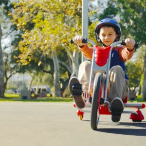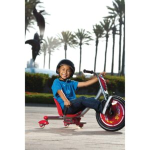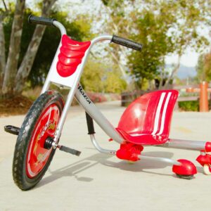 This Razor Flash Rider 360 Trike Ride-On, Red lets kids watch the sparks fly. Dual-inclined caster wheels offer the ultimate rotating action and fast 360-degree spins. This cruiser has a full-sized bucket seat for comfort. It is positioned for pedaling while riders are reclined, creating a low center of gravity for reliable ride stability. By centering the child’s weight over the rotating casters, it is flashier than almost anything else on three wheels. It accommodates riders up to 160 pounds and is ready to revolve. This Razor flash rider 360 ride-on will quickly become a playtime favorite. Some assembly is required. It is designed for children ages 6 and up. Kids will love making sparks fly as they race up the driveway or through the neighborhood. It will quickly become a playtime favorite with various ages. MX-style handlebars with rubber grips offers smooth handling while the high-impact wheels can tackle most flat surfaces.