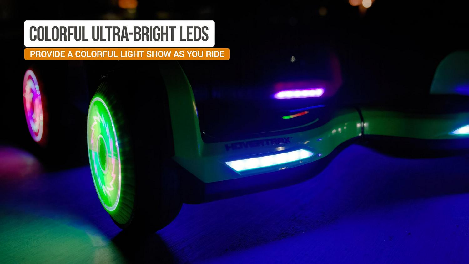 – Tires: Rubber with multi-color LED-lighted hubs.