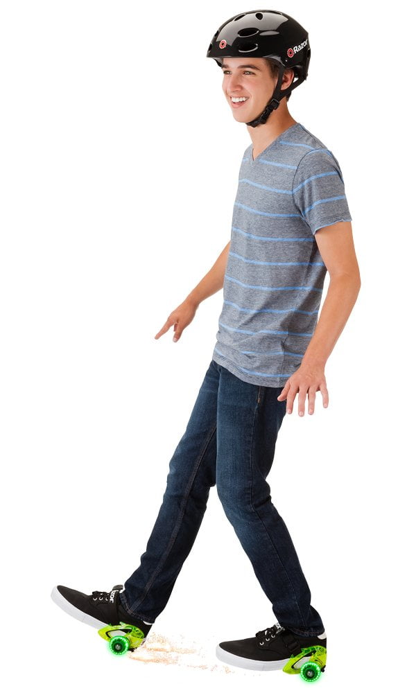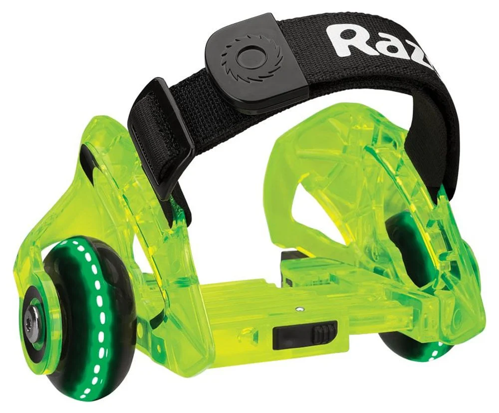 Put your sneakers into warp drive with the Razor Jetts DLX heel wheels. The glowing, LED wheels and a translucent, polycarbonate frame will take you to another dimension of fun, with an extra burst of flashing sparks when you want to really light it up. The Jetts DLX feature our “quick click” hook-and-loop strap system that makes it easy to get the perfect fit on U.S. shoe sizes youth 12 through adult 12. Simply step into the heel wheel and tighten the strap and you’re ready to roll. Razor’s light-up LED, urethane wheels deliver a smooth, colorful ride, while the removable and replaceable spark pads make it easy to keep the sparks flying on every ride. Designed for riders ages 8 and up weighing up to 176 pounds, the Jetts DLX are ready to blast off and turn any pair of sneakers into the brightest ride around.
