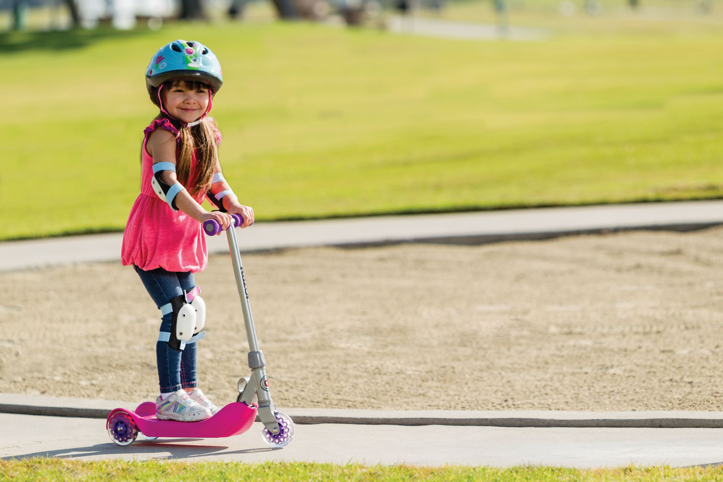 The Razor Jr. Folding Kiddie Kick Scooter features an all-new design with a cool retro-inspired style. This folding kick scooter also comes with a child safety latch on the folding mechanism for security. The three-wheel design of the Razor Jr. Kick Scooter provides stability and helps children build coordination. This Razor Jr. Folding Kiddie Kick Scooter also provides easy-grip handles and ample foot room, so it is easy for kids to ride. The steering column, t-tube, and handlebars on the Razor Jr. Kick Scooter are constructed out of aircraft-grade aluminum that ensures a durable and lightweight design. When assembled, the Razor Jr. Folding Kiddie Kick Scooter measures 13.5″ long x 29.5″ wide x 26″ high. This Razor Jr. Scooter is recommended for children between the ages of 3 and 5 years old.