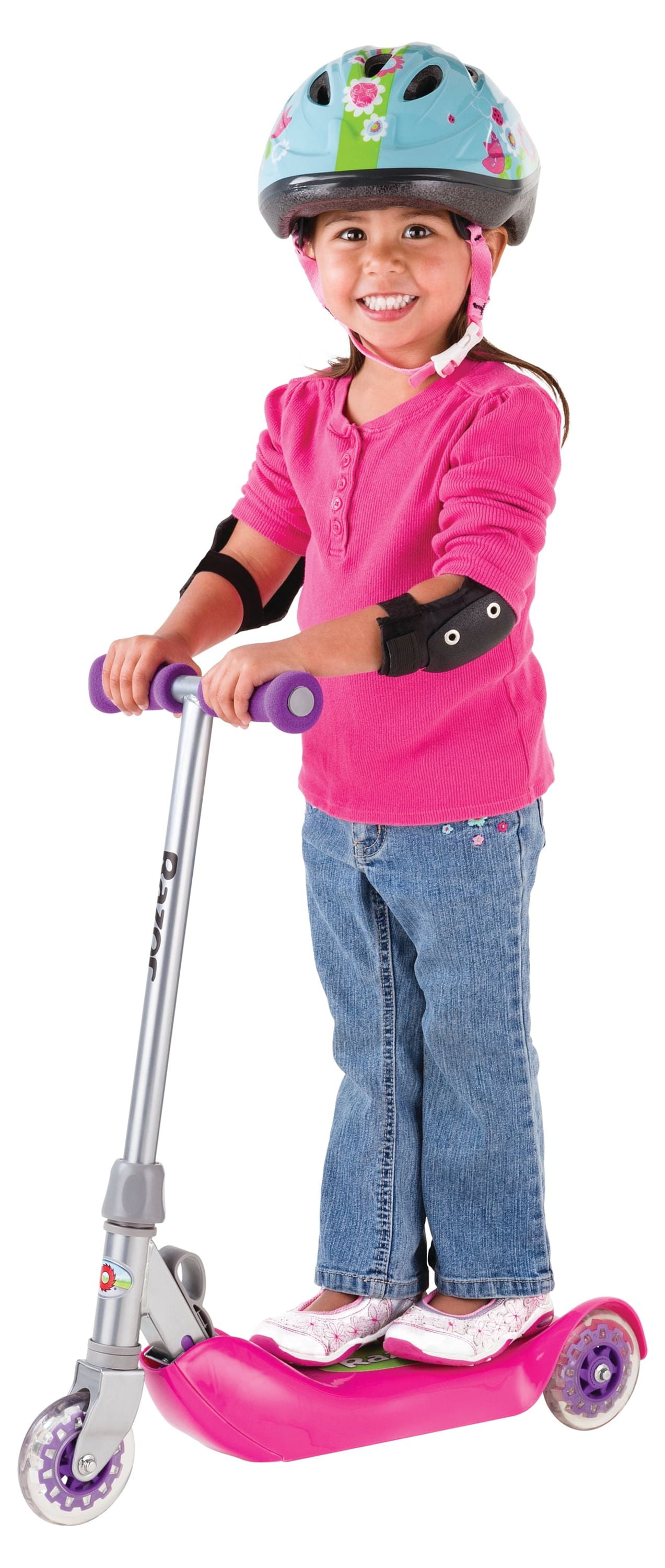 Razor Folding Kiddie Kick Scooter Pink- Easy Open Packaging: Features: Aircraft-grade aluminum steering column, t-tube and handlebars Child safety latch on folding mechanism Adjustable handlebar height Razor Jr. Kiddie kick scooter is quick and easy to assemble Specifications: Frame: Steel Handlebars: padded, steel Deck: Extra-wide, slip-resistant polypropylene Grips: Polymer Wheels: Extra-large, polymer Ages: 3+ Max Rider Weight: 44lb (20 kg) Assembled Product Dimension: 22.25″ x 10.50″ x 25.25″ Product Weight: 6.34 (lb) International Disclaimer: This Razor product is produced for sale in the United States and Canada. The Razor warranty for customers who intend to use it outside of the United States and Canada is not applicable. Razor products produced for and sold in international channels are warrantied as applicable in such foreign countries. Call +1 866 467 2967 or email [email protected] for more details regarding Razor products that require service, were purchased in the United States or Canada, and are now outside the United States or Canada. On these products, which require service, consumers are responsible for all costs including shipping, resulting taxes, duties of replacement parts and local power adapters at the owner’s expense.