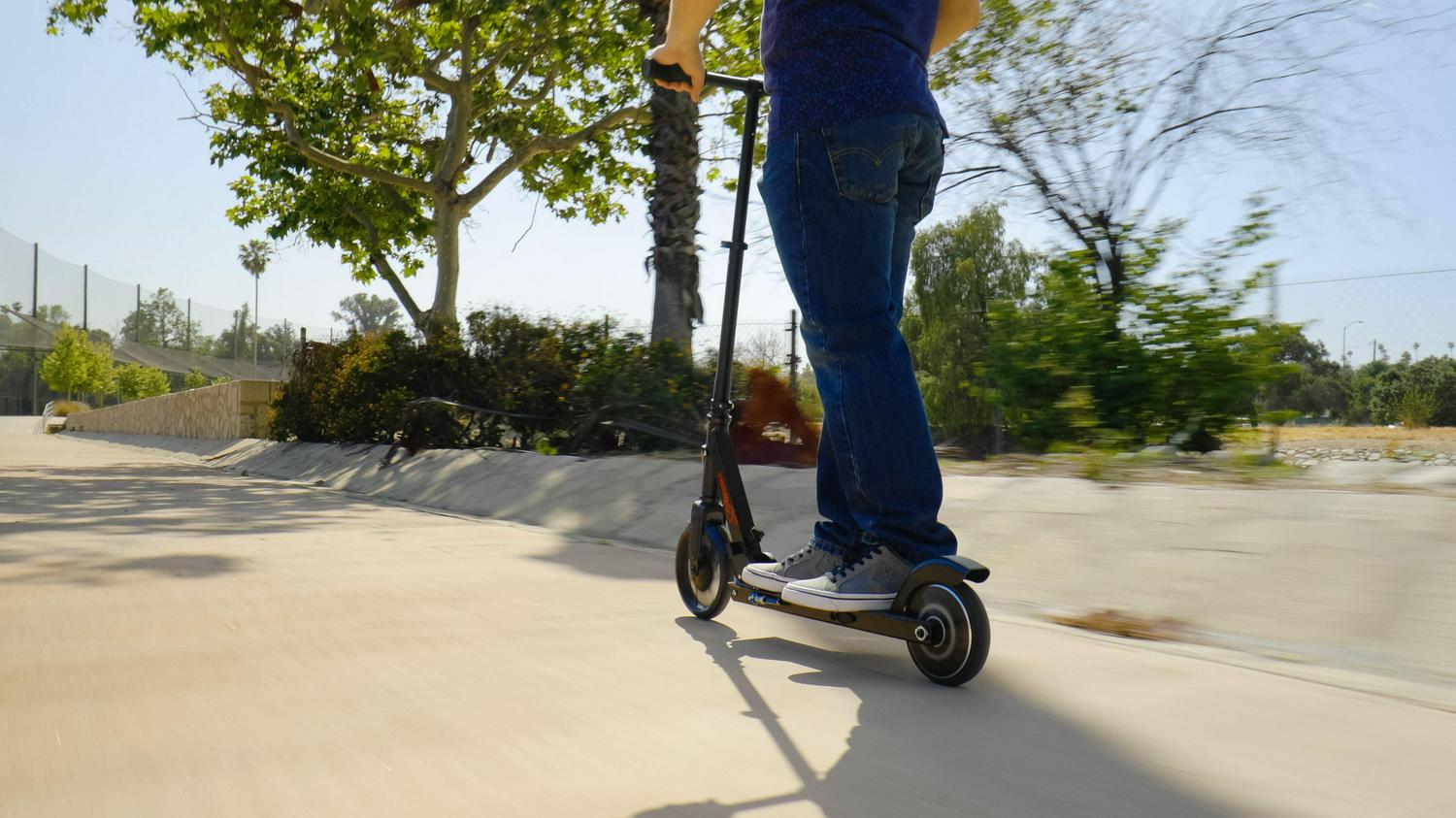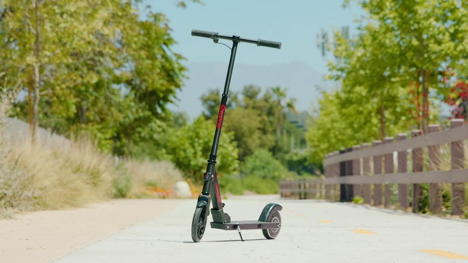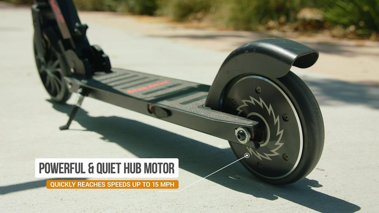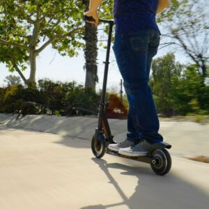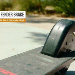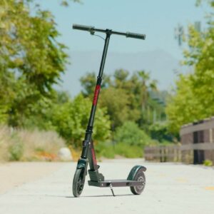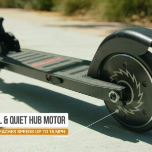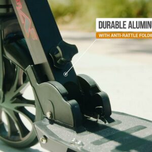 Parked at your desk or cruising the neighborhood, the Razor Power A5 Black Label electric scooter makes a stylish statement. With a kick-to-start, high-torque, brushless hub motor that maintains speeds of up to 10 mph (16 km/h) for up to 40 continuous minutes of (permitted) uses, you’ll be riding to work, running errands, or hitting the town in style. An extra-large, 8″ (200 mm) urethane front wheel and abrasion-resistant, airless rear tire smooth the road so you can travel in total comfort and a patent-pending anti-rattle folding mechanism provides a quieter ride, as well as easy portability and storage.