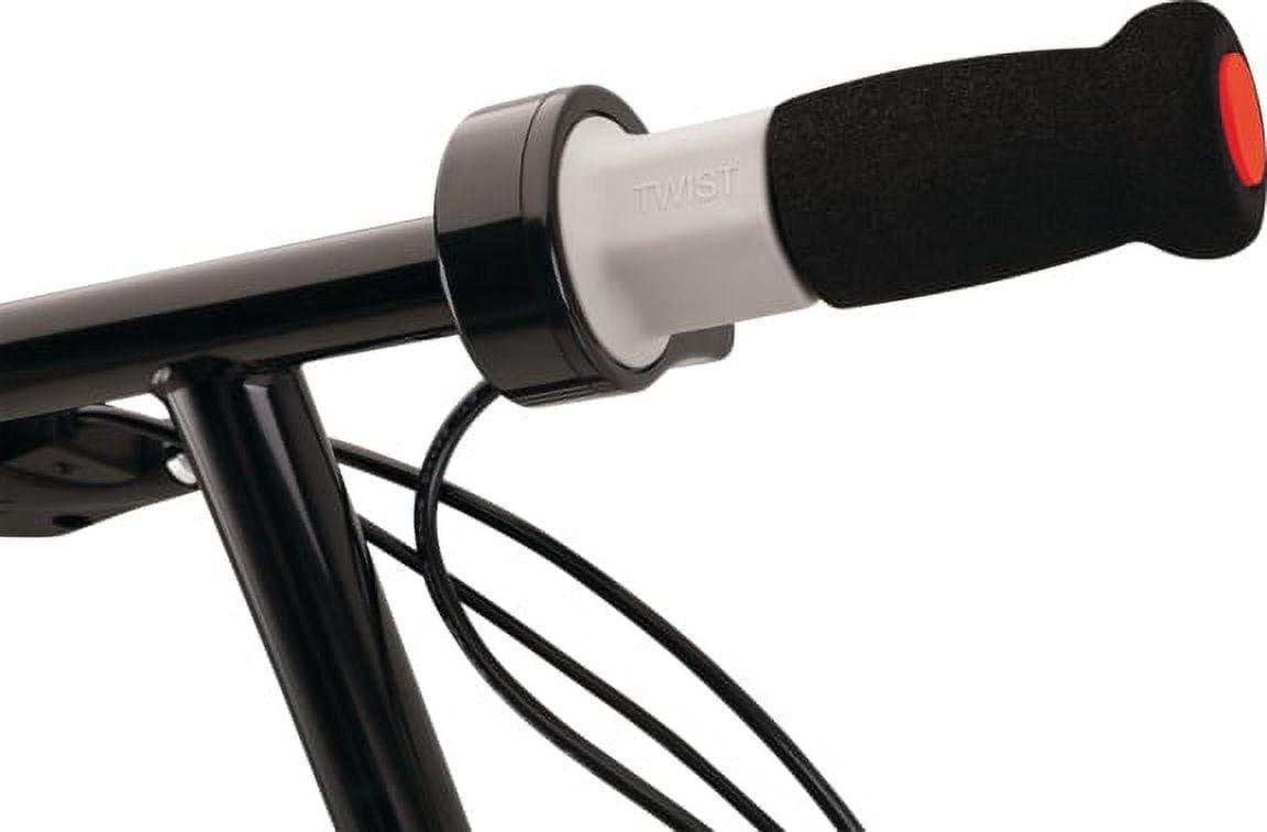 – Additional features include a twist-grip throttle, hand-operated, front caliper brake and retractable kickstand