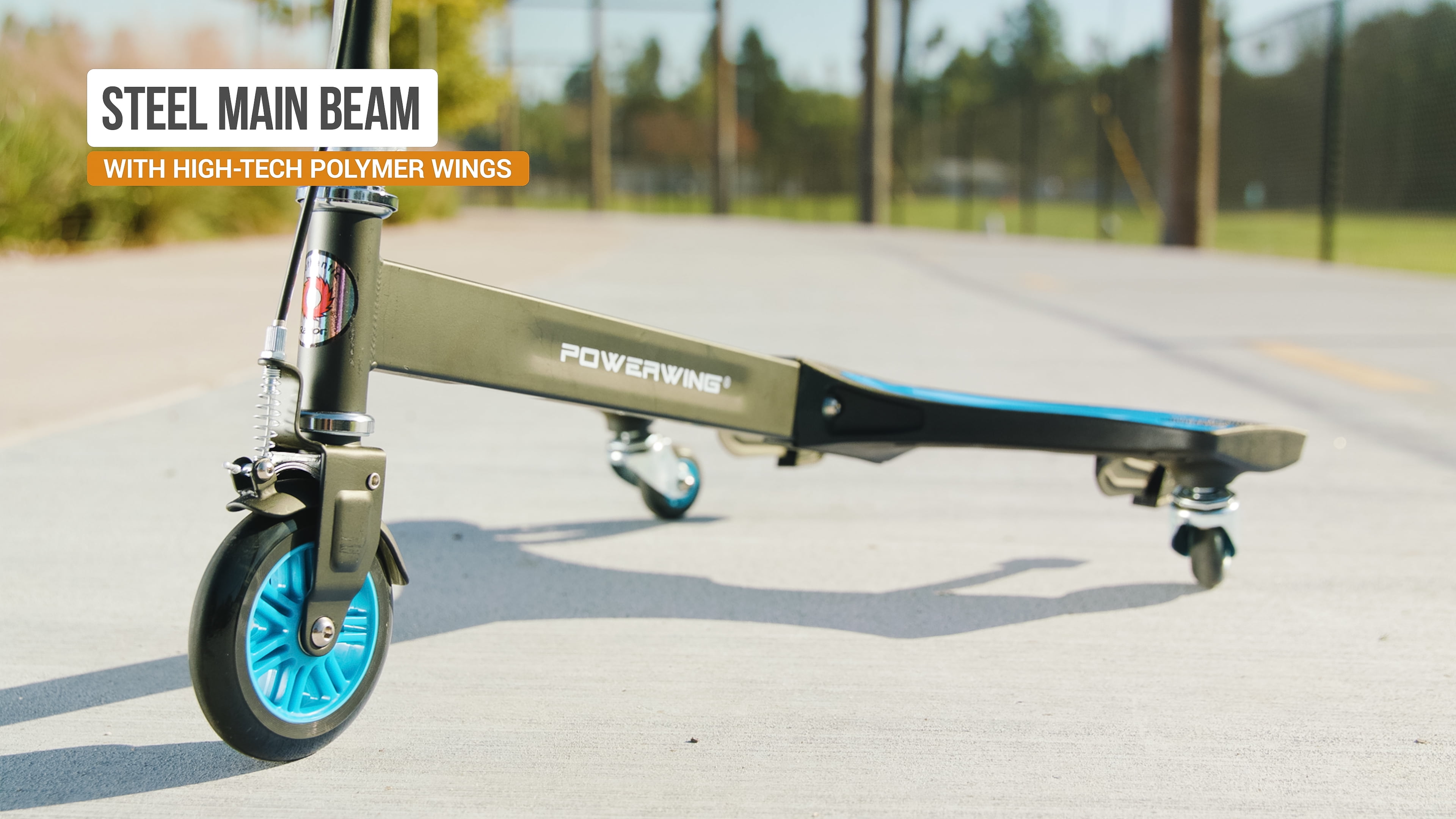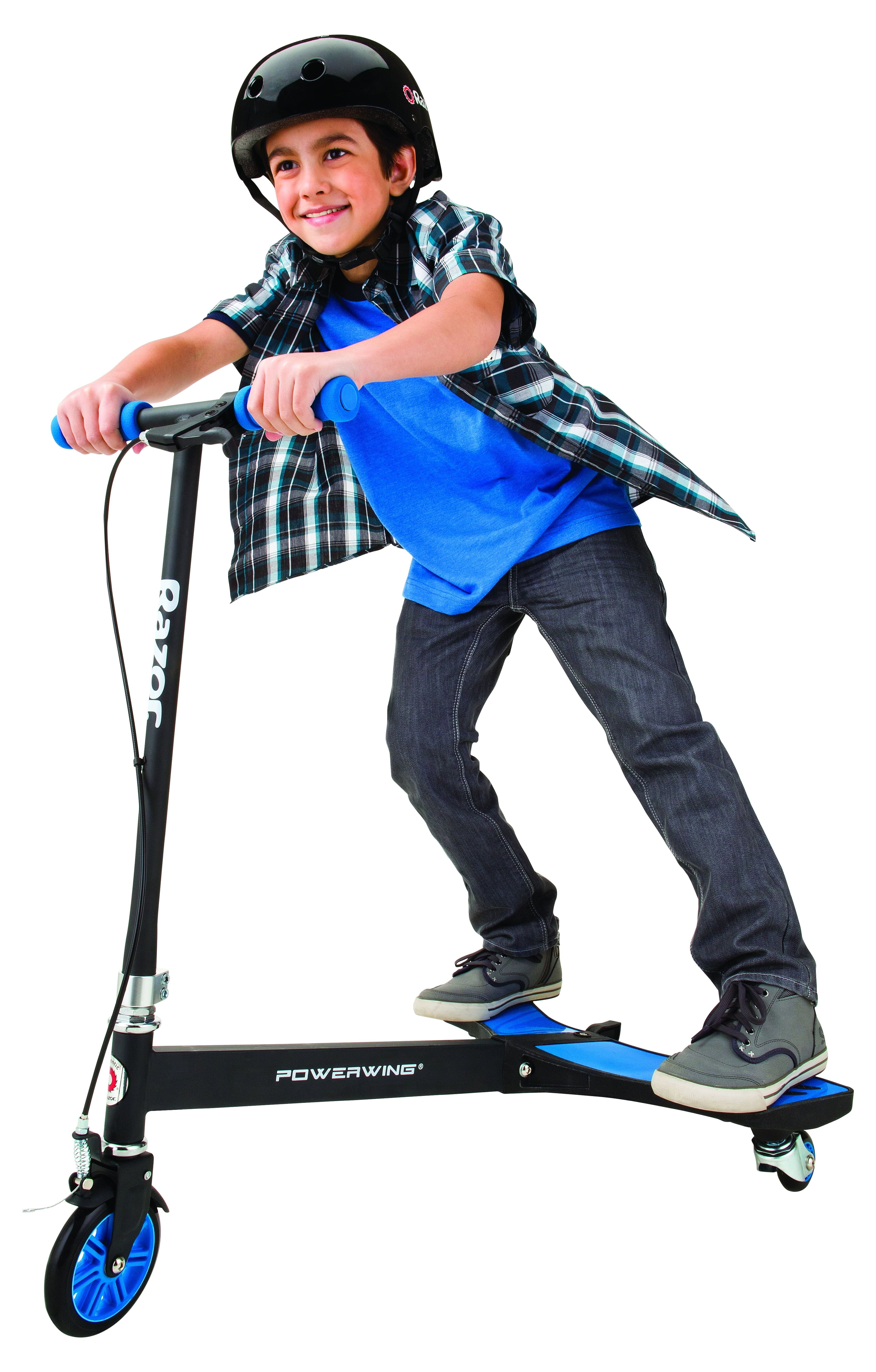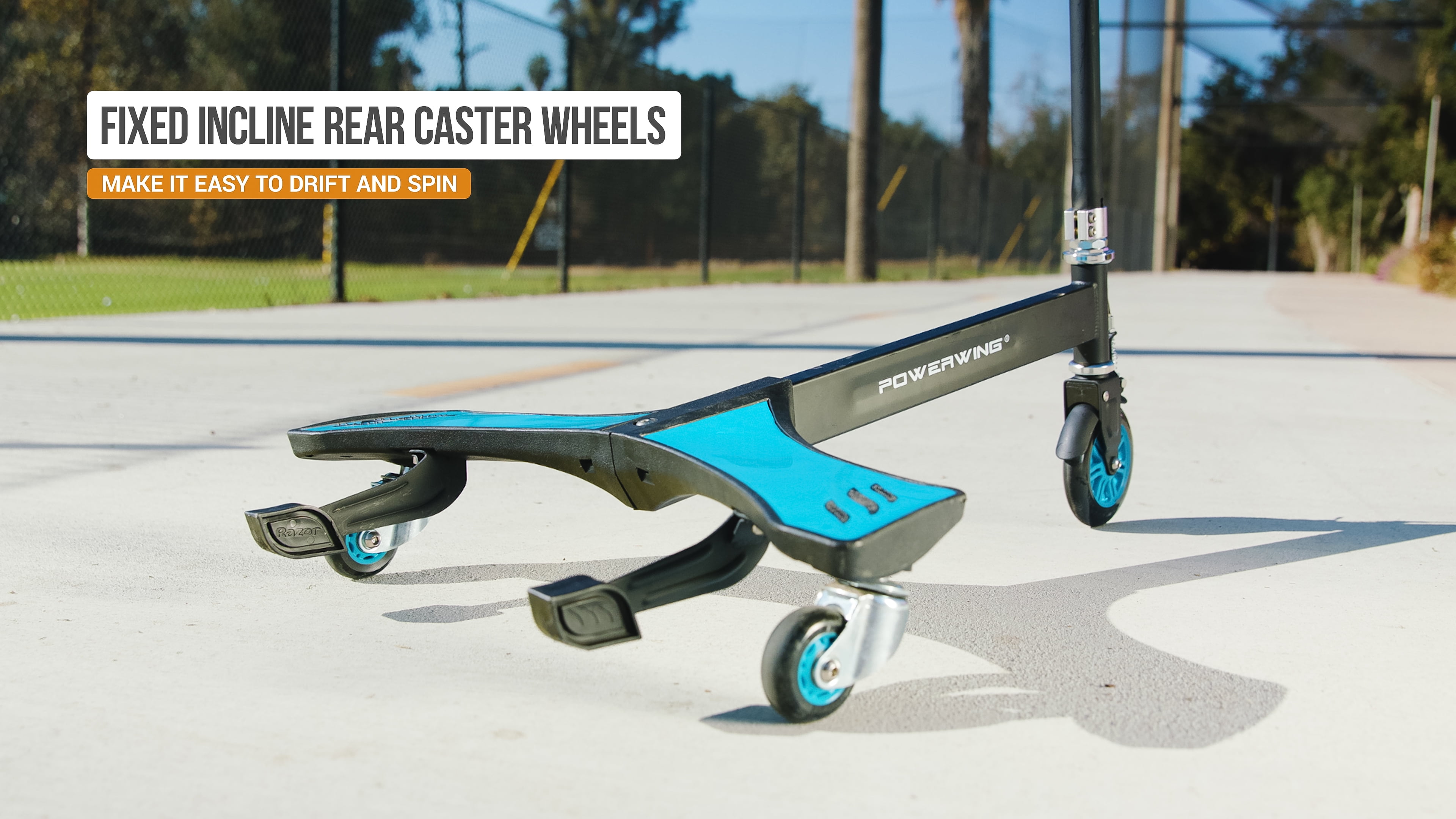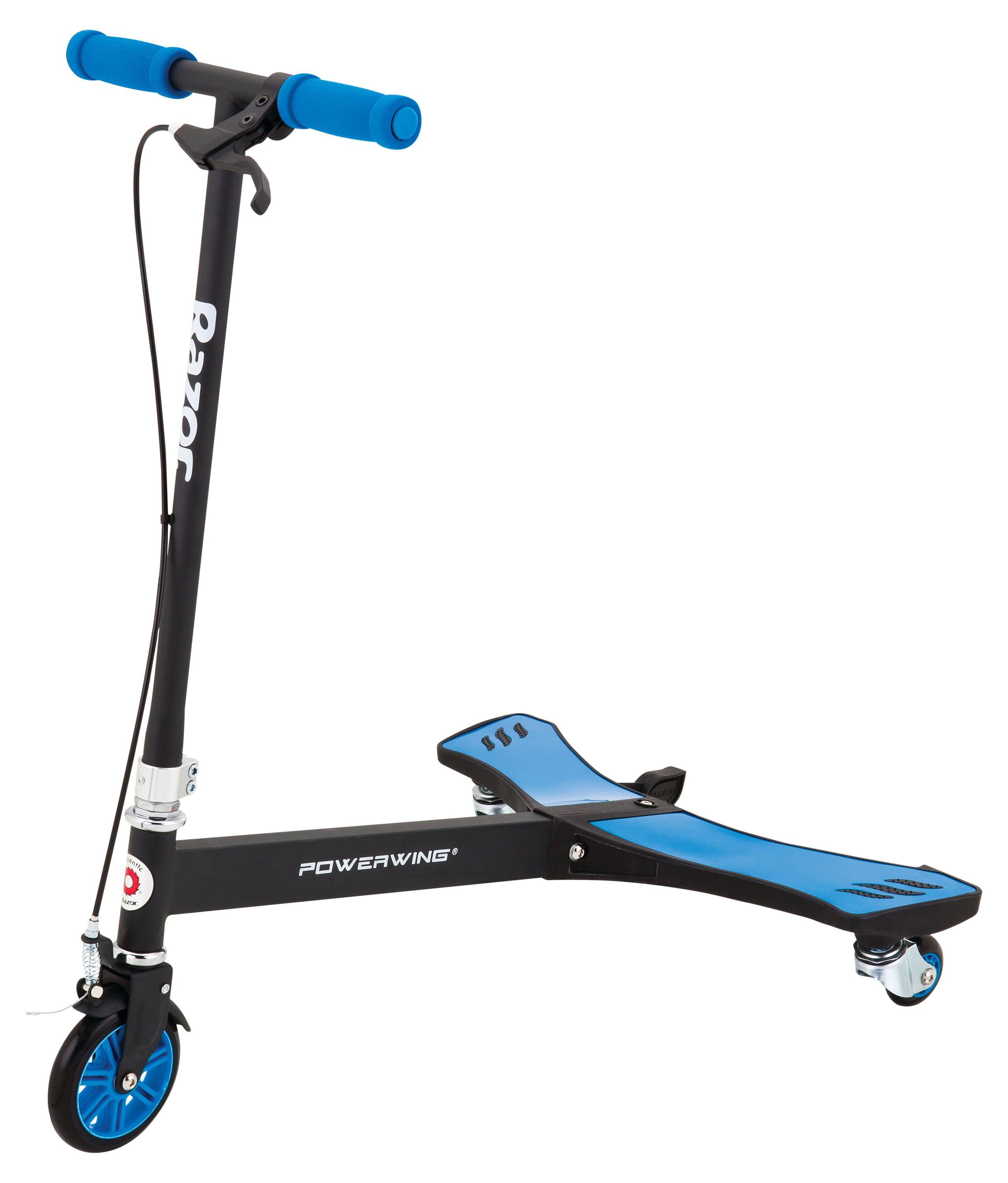 Razor Powerwing Caster Scooter- Blue, Ages 6+ and Riders up to 143 lbs, Unisex The Power Wing ushered in a radical new way to ride. This awesome three-wheel design gets going with a side-to-side movement and allows riders to master sideways drifting and 360-degree spins. Frame: Steel main beam and high-tech polymer wings Grips: Foam Front Wheel: Urethane Rear Wheels: Inclined casters for drifting and spinning. Brake: Front, hand-operated Stability Bars: Removable Some Assembly Required Age: 6+ Max Weight: 143 lb (65 kg)