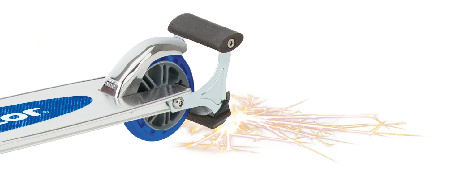 Kids can tear up the asphalt or the sidewalk in style with this Razor Spark Scooter. Made of durable aircraft-grade aluminum, it features a patented rear fender brake that allows them to stop on a dime every time. It comes with a foot-controlled, detachable bar with five flint pads that help create real and bright sparks while kids ride. The Razor scooter can be folded for convenient storage and portability. It includes rugged 98mm urethane wheels and ABEC-5 bearings for a smooth, fast ride with improved control. It also comes with a bonus replacement spark cartridge. This scooter creates 20 percent more sparks than other spark scooter brands on the market. This kids’ kick scooter can endure rough handling and is available in your choice of eye-catching colors. The handlebars are cushioned to provide comfort, even after hours of riding, and can be adjusted to suit the rider’s height.