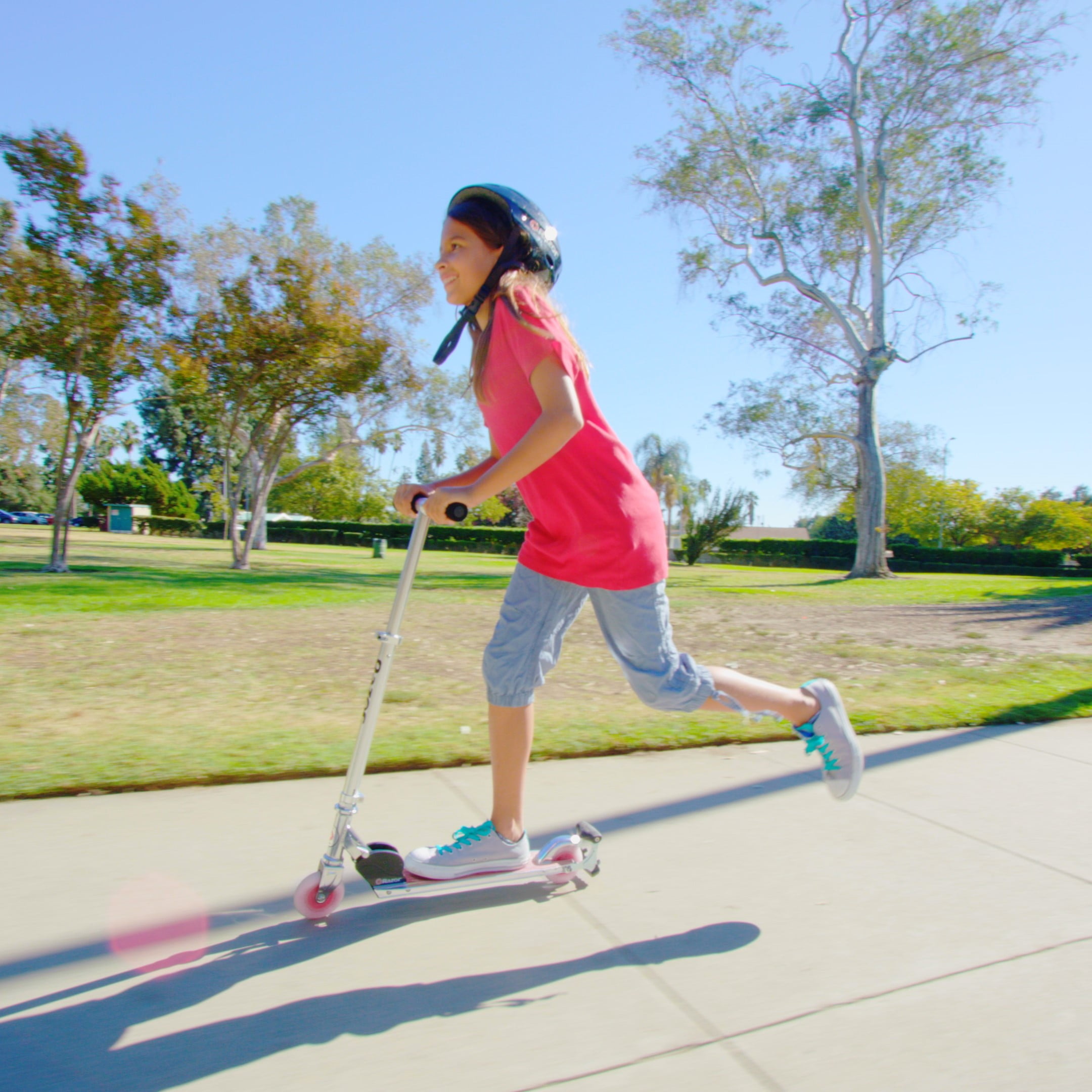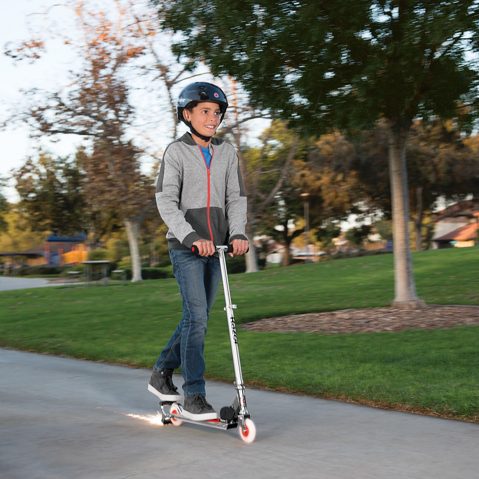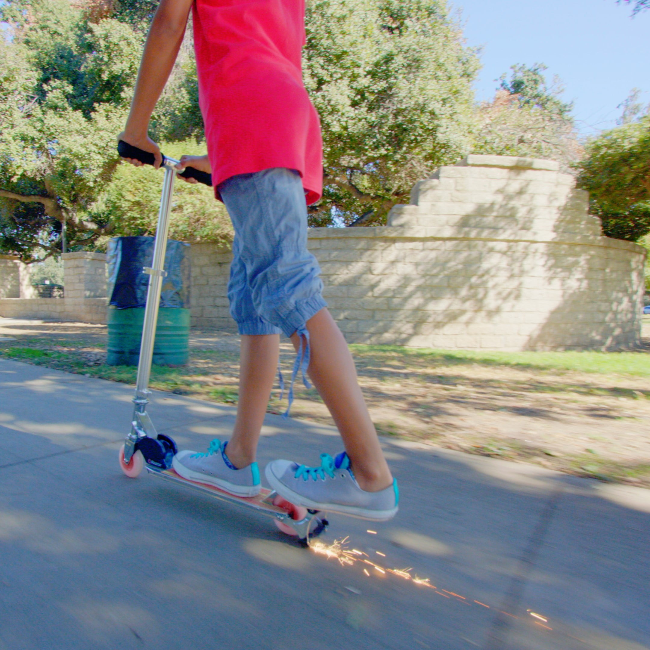 Lightning on wheels, the Spark Ultra is a blur of brilliant light that’s ready to take riders to a new dimension of fun. Featuring the brightest LED wheels of any scooter in the Razor lineup, the Spark Ultra doubles down on flash with every blast from its Spark Bar for a glowing ride that will light it up all day long. The full-length grip tape sets the tone with its spark-inspired design, while the easy-folding mechanism makes it easy to take your light show on the go. Designed for children ages 8 and up, the Spark Ultra’s aluminum t-tube and deck provide hand-me-down durability, with easy-adjust handlebars that let you find the perfect height.
