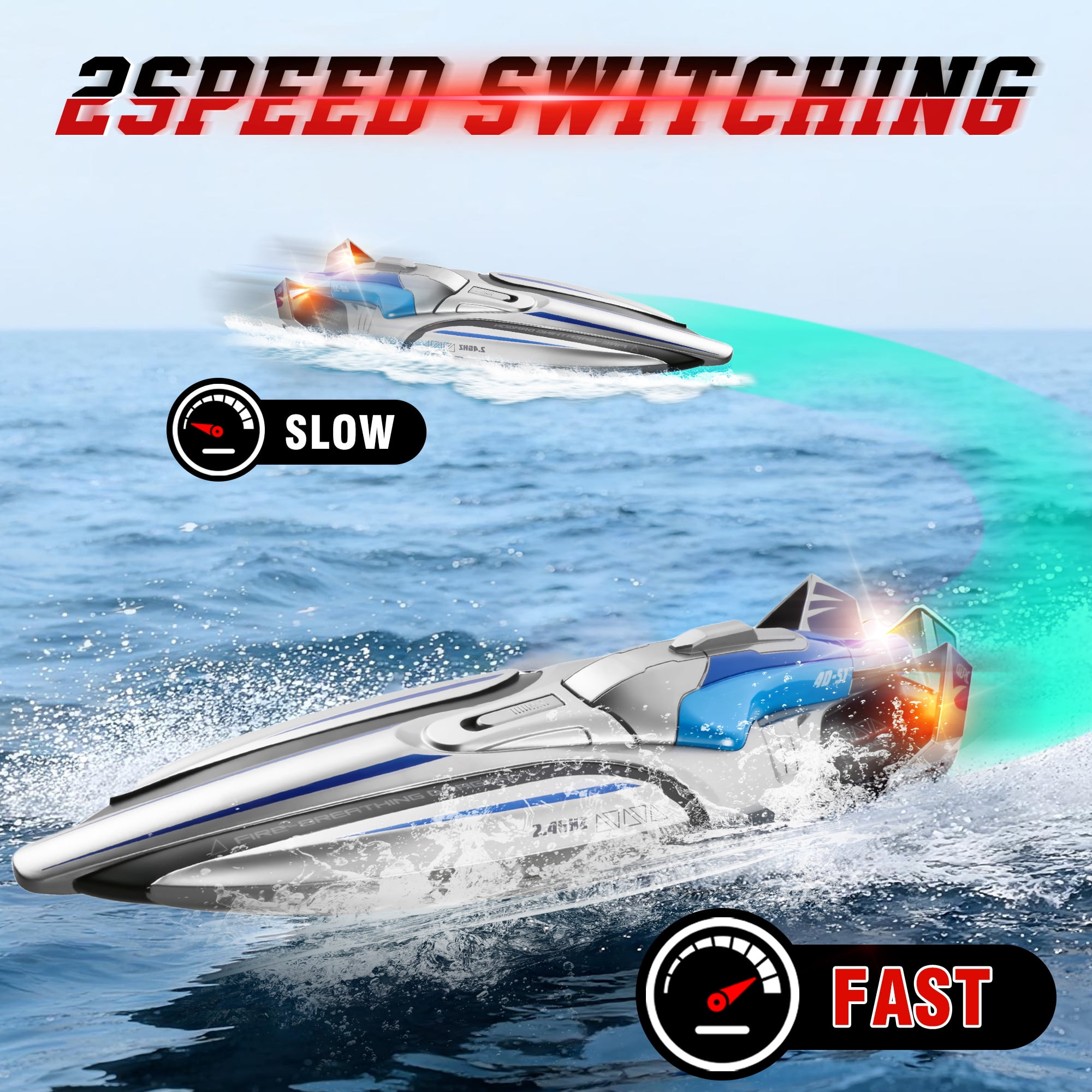 🌊Powerful and Thrilling This high-end speed boat is equipped with a powerful motor, reaching speeds of over 30KM/H, giving you the thrill of speed. 🌊Superb Performance, Fearless of Waves The boat has a one-button flip function, so even in rough waves, it can handle them gracefully. The 180-degree flip recovery function allows this boat to easily handle various water environments such as the ocean, rivers, and pools. ⚡Excellent Endurance Efficient water cooling system ensures safer and longer-lasting use, preventing overheating during extended play. Also comes with 2 1500mAh high-capacity batteries, providing over 40 minutes of playtime on a single charge. 🚨Battery and Long-Distance Warning This fully waterproof racing boat is made of high-quality materials, able to withstand harsh conditions and extreme racing conditions, ensuring its long-term reliability and durability. Low battery and weak signal alerts ensure that you can enjoy your water journey from start to finish, avoiding getting stranded in the water. 💡2.4 GHz and Bright LED Lights LED lights illuminate the boat’s path, adding to the overall aesthetics, especially at night, providing you with beautiful scenery. 2.4GHz allows you to experience an interference-free racing boat experience.