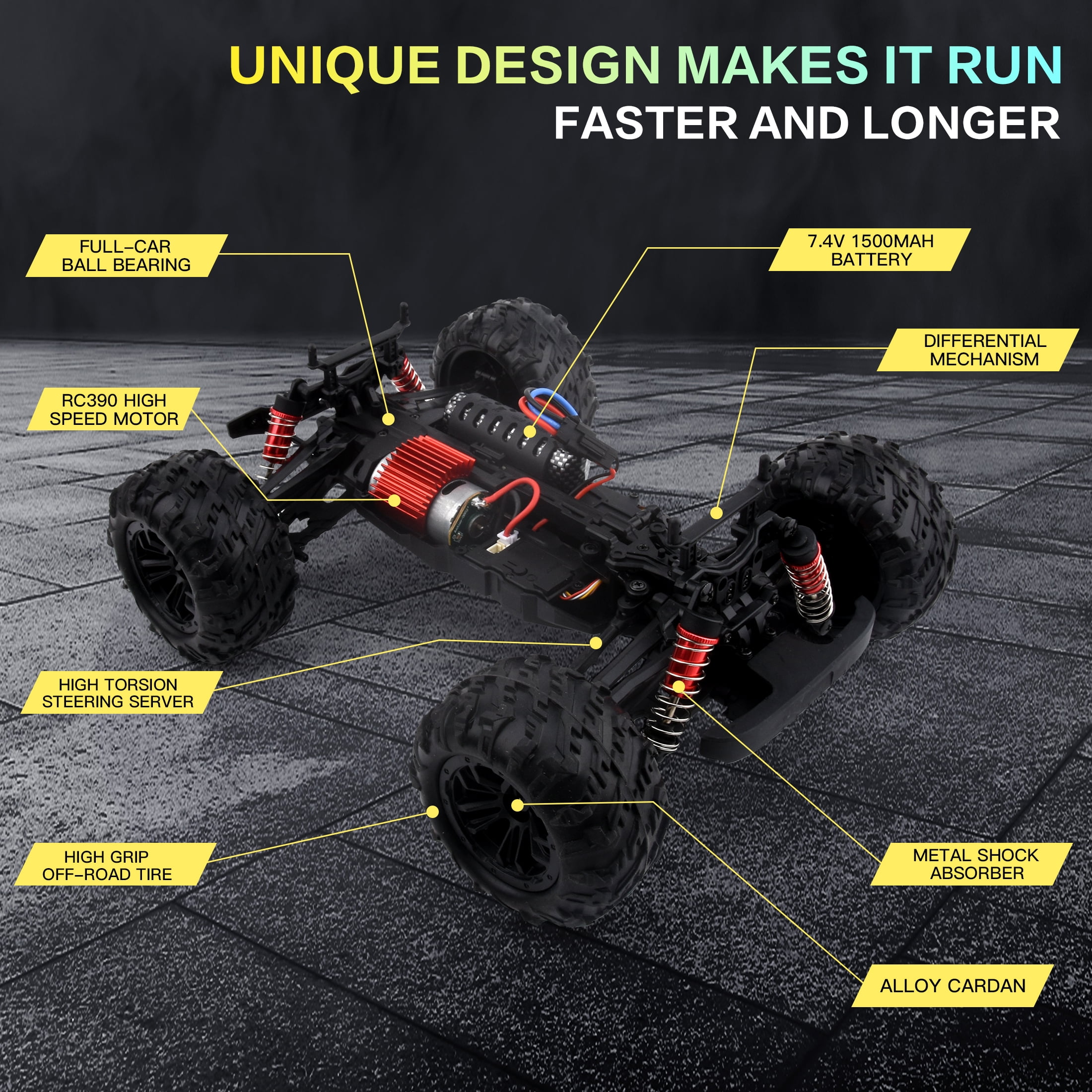 Elevate your rc car gaming with our YLSHRF 1/16 Brushed Motor 390 remote control car Truck Metal shock absorbers, designed to promote the rc car longevity and control 4WD RC Cars for all terrains with 4 oversized, high-grip, robust off-road wheels, built for power, resilience, and durability Metal Differential Mechanism 2 x 7.4V 1500mAh high-capacity batteries, providing up to 50 minutes of non-stop excitement