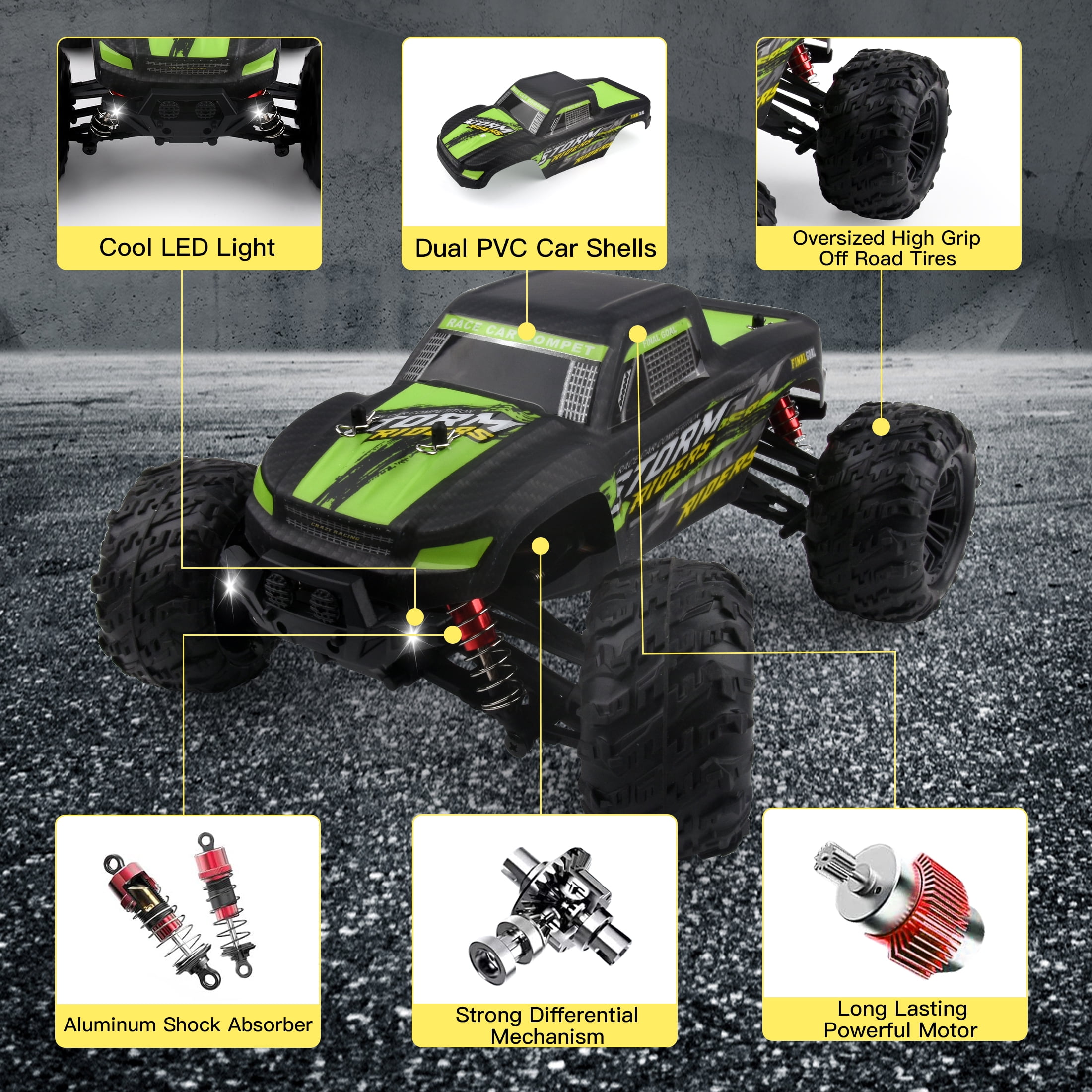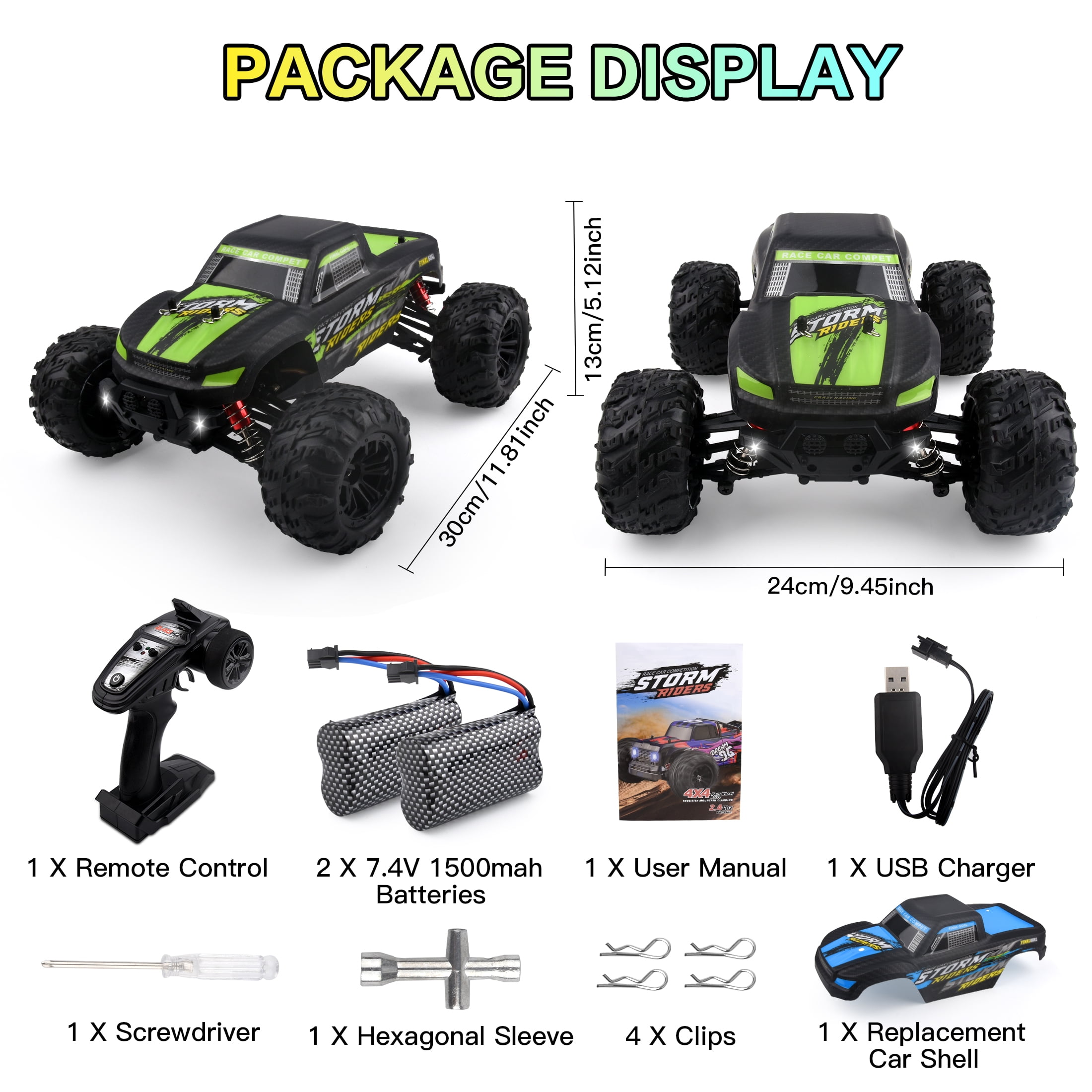【Brushed Motor RC Cars】This 1/16 scale 4WD RC car boasts an innovative design for enhanced speed and handling. Its four-wheel drive and independent suspension allow acute cornering, while the thickened chassis ensures durability. Equipped with a strong RC390 motor, it can reach top speeds of over 60KMH. 【Upgraded RC Truck with Flexible Driving】 This RC truck features a sturdy chassis, enhanced steering system, and powerful rotation force for a noteworthy driving experience. It offers flexible performance and a 45-degree torsion angle for acute turns, providing a unique user experience. 【2 Batteries for Longer Running Time】This RC car comes with two 7.4V 1500MAh lithium batteries, offering strong power and up to 50 minutes of life(one battery lasts about 20+ minutes). The batteries are easily replaceable without removing the truck case. The car’s electronic system also features overheating protection and a low battery voltage cut-off function. 【2.4GHz Full Size Synchronized Remote Control】This RC car features a full-featured 2.4GHz remote control with a range of up to 300ft for easy operation, including forward/brake/reverse functions. It has a built-in anti-jamming function for multi-player racing. The remote allows control over the throttle size and tire angle, enabling fine adjustments for a smoother ride. 【Powerful RC Cars for All-Terrain Dominance】This off-road RC car can handle any terrain with its sturdy rubber tires and strong grip. Whether it’s beaches, sand, mountains, grass, or roads, this car easily overcomes any obstacle, thanks to its excellent climbing ability and responsive remote control. Specification Product Size: 11.81 x 9.45 x 5.12 inch Item Weight: 3.25lb Material: Hardware, electronics, plastic Control Distance: 0-300 Ft Remote Frequency: 2.4Ghz Product Battery: 7.4V 1500mAh Playing Time: About 50 minutes(two batteries) Package List 1 x RC Car 1 x Instruction Manual 2 x Lithium Battery 1 x USB Cable 1 x Remote Controller 4 x Car Shell Clips 1 x Alloy Wrench 1 x Screwdriver 1 x Replacement Car Shell Note: The package does not include the 3 AA batteries required for the remote controller.