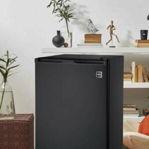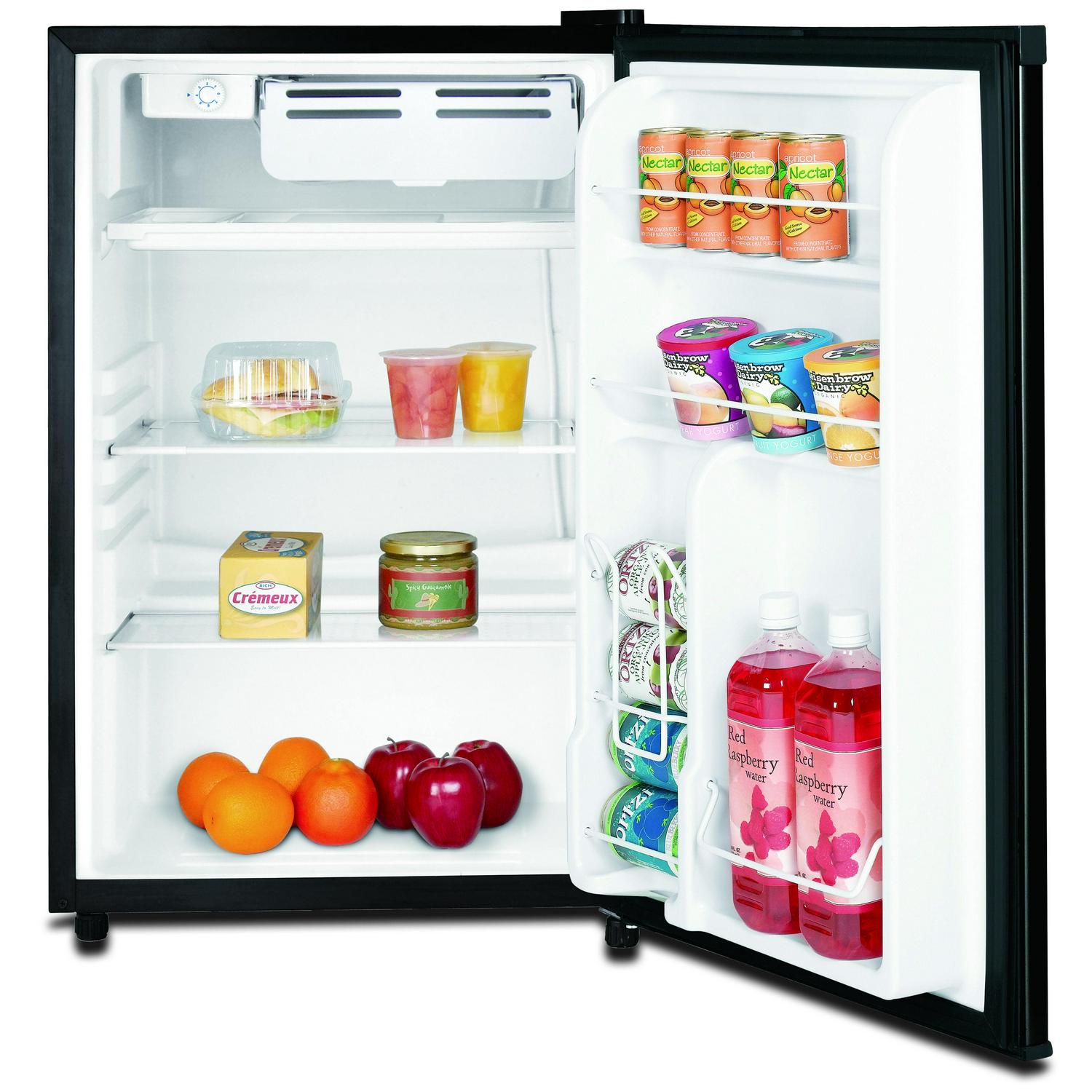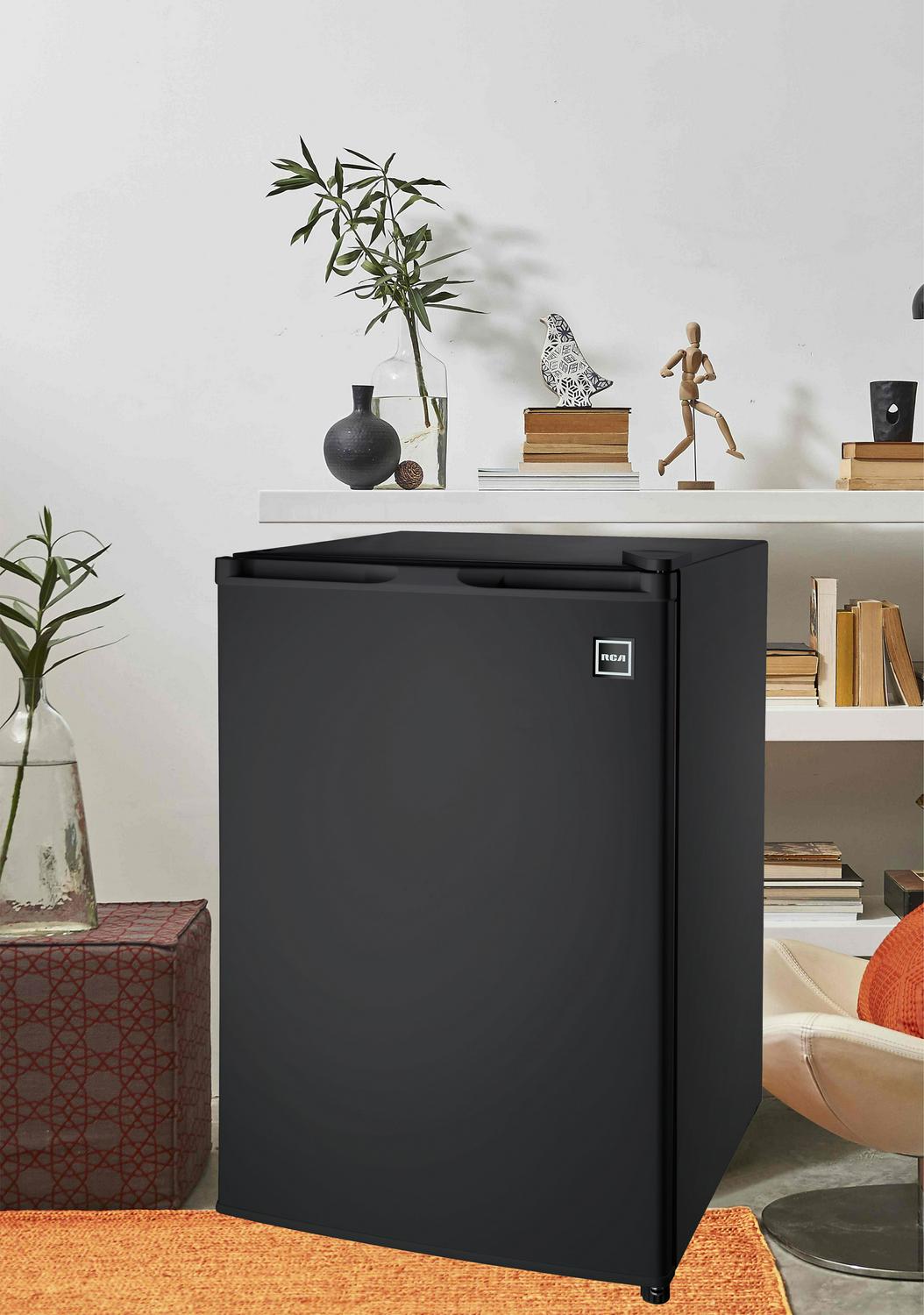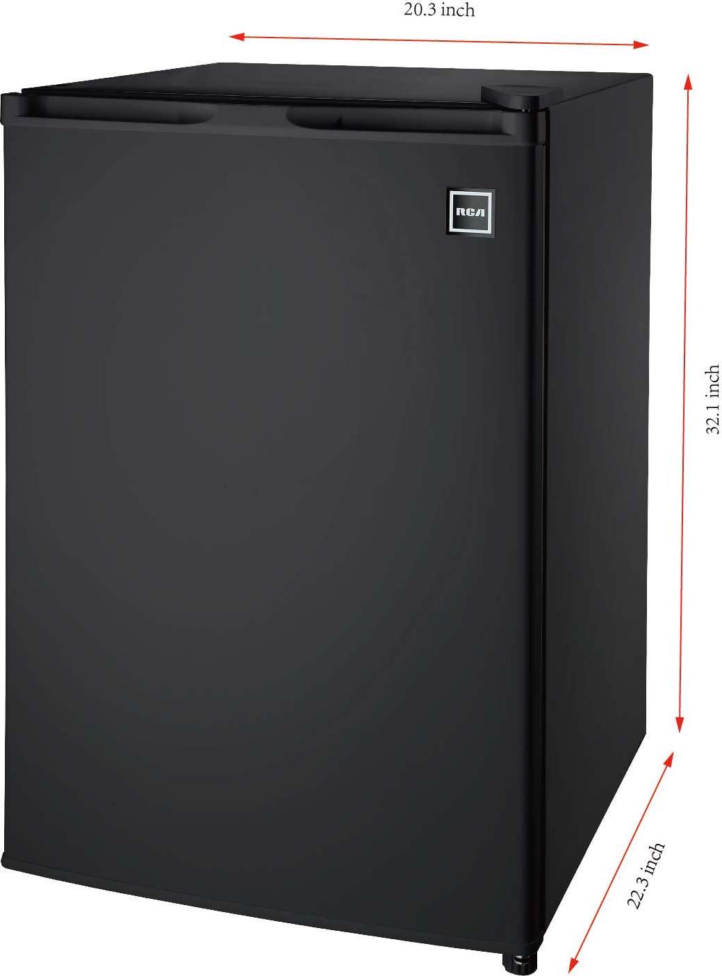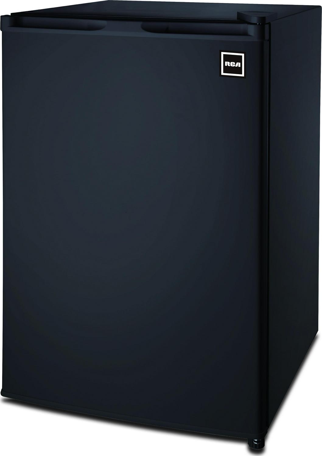 The RCA 4.5 cu. ft. Black Single door Compact Refrigerator is roomy enough for your groceries and beverages but small enough to fit almost anywhere. Keep groceries organized with removable food shelves, a food rack, bottle rack, dairy rack and even an ice cube chamber freezer compartment with an ice cube tray and drip tray. The can dispenser storage bins make it easy to access soda and juice cans. An invisible door handle and adjustable legs add to the unique design and helps you keep your unit level on uneven surfaces. The door is reversible, meaning you can adjust it to open from either the right or left. That allows you to place it anywhere, even in the tightest corners of your home. You can also adjust the temperature depending on what type of food is inside, helping you consume less energy and save on your electric bill. This unit can hold all of your groceries but allows you to save space whether this is going in a dorm room or in the den.
