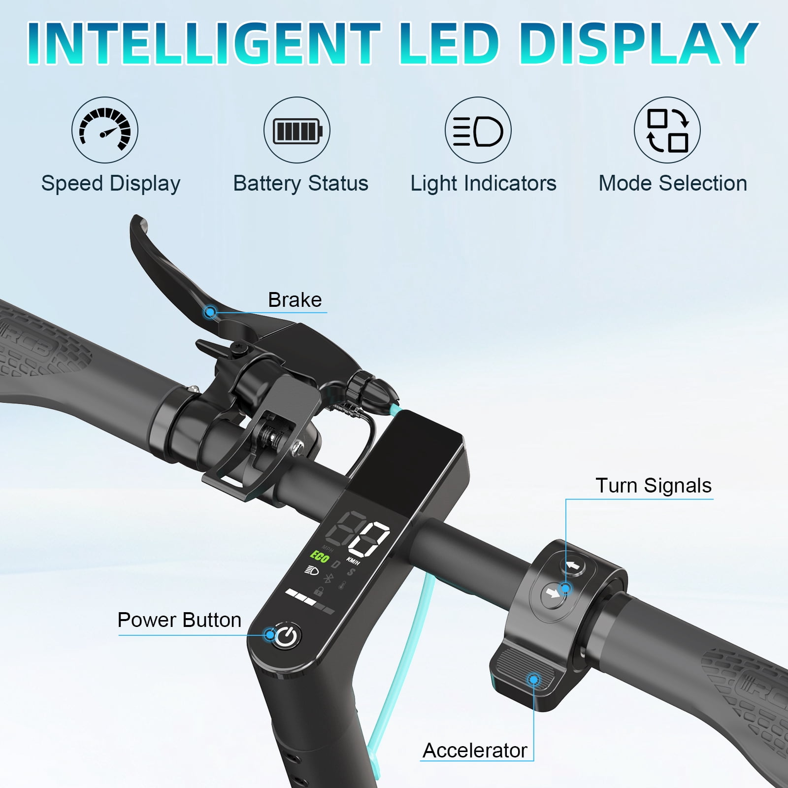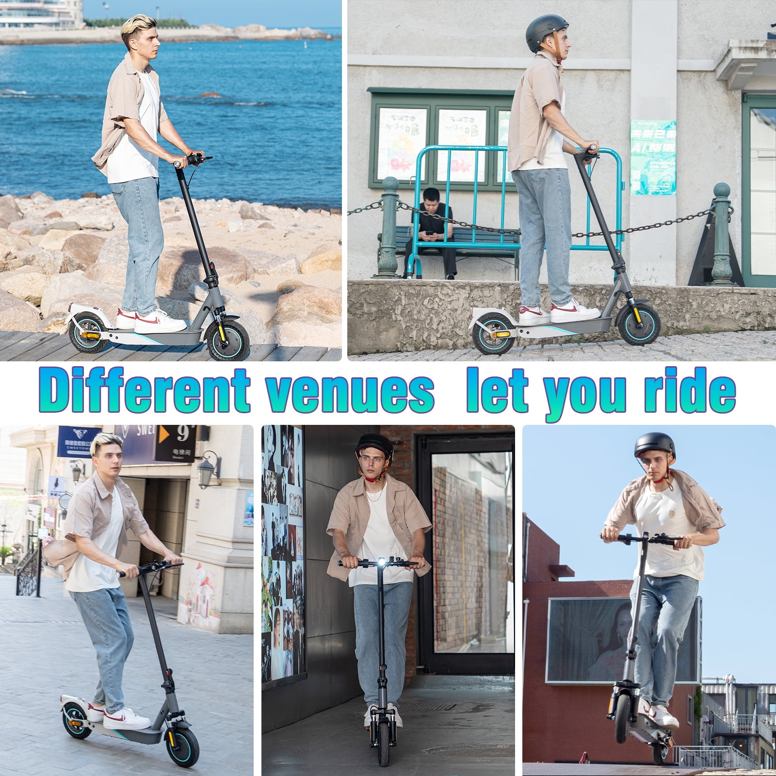 【APP Connection】 APP Bluetooth mobile phone connection, intelligent travel, convenient for users to know the status of the scooter at any time, master the riding status, easy to adjust the speed, more intelligent travel. 【10 inch honeycomb solid tire】10 inch honeycomb solid tire, wear-resistant and non-slip, suitable for all types of terrain and providing protection for your safety. 【Powerful Motor】This electric scooter is designed with a large capacity 36V 11.4 Ah battery, with a maximum range of 18-22miles. And a brushless motor with ordinary power of 500W, which can provide a maximum load capacity of 330Lbs. 【Safe Double Brakes & Portable Folding】The electric scooter with disc brake and electronic brake, this double brake system will improve braking precision and provide comprehensive protection for your journey. This electric scooter adopts innovative folding and hanging method, the folding operation is SUPER convenient, in just one second. 【High-quality LED screen and taillights】LED screen adopts semi-transparent display, high brightness, unique style, fully showing the texture of the electric scooter. Clearly understand the scooter’s speed, battery level, Bluetooth connectivity and other data. At the same time, the electric scooter is equipped with LED taillights to ensure the safety of driving at night. Specifications: Dimensions Scooter: L × W × H(cm) : 110*51*118 cm After Folding: L × W × H(cm): 110*51*54 cm Net Weight: 35.3 LBS Load weight : 330 LBS Speed (km/h): 7.5-12.5-15.5mph General Range (km):Load 165lbs—18-22miles Max. Climbing Angle (%):10-15° Ip Rating:IP54 Charging Time (h): 6h Rated Voltage (VDC):36 V Rated Capacity (Ah): 11.4 Ah Motor Power (W): 500 W Tires: 10 inch honeycomb solid tire Applicable Terrain: Flat cement or asphalt roads Braking Method: Disc brake + Electronic brake