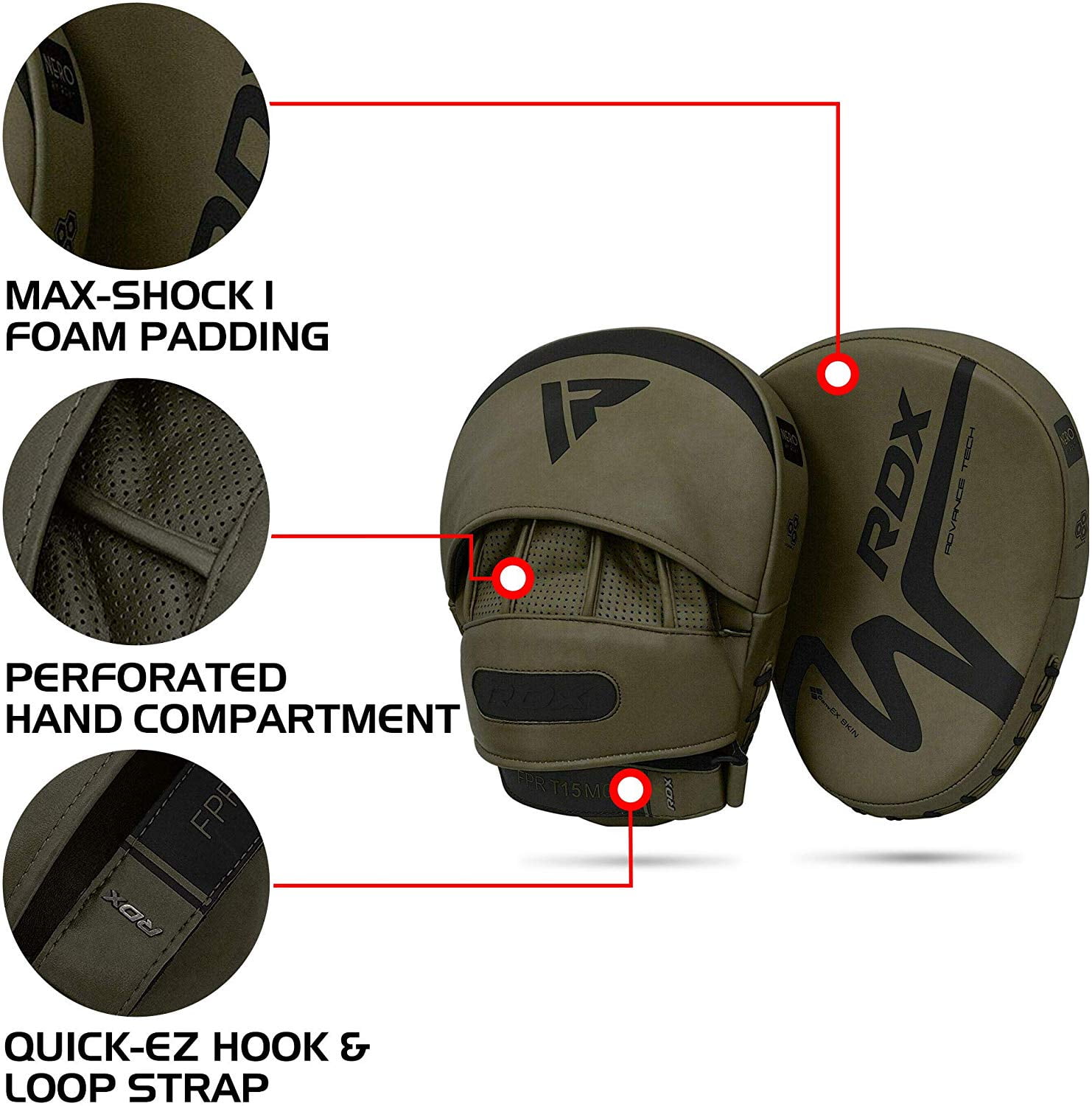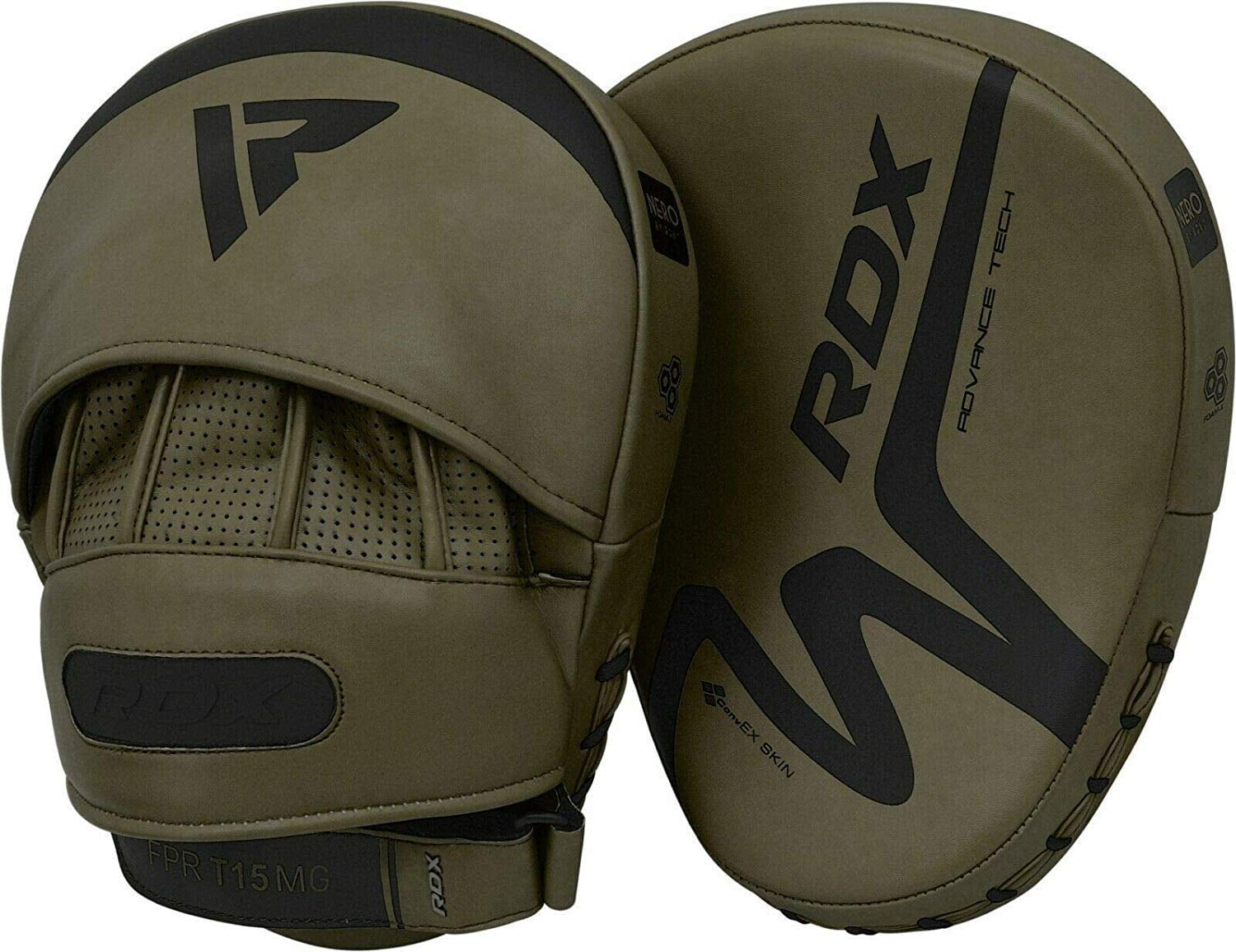 Features [ ConvEX Skin Combat Leather ] RDX boxing focus pads are manufactured with ConvEX Skin Combat Leather and nylon stitching for integrated durability. The resilient material resists wear and tear for a prolonged amount of time without losing its original shape. Perfectly assists you in Boxing, Muay Thai, Kick boxing, MMA, BJJ, Karate and more. [ Max-Shock 1 Foam Padding ] These focus pads are contrived using Max-Shock 1 Foam padding that assists with shock absorbency to protect the coach’s hands and wrists. The brunt of impact is evenly distributed across the surface area. [ Perforated Hand Compartment ] Our focus mitts are build using tactically placed aeration holes that keeps that hands well-ventilated, sweat-free and clean. It also minimizes bad odor. [ EZ-Grip Ball for Solid Grip ] Our hook and Jab pads are equipped with EZ-Grip technology that enables a solid grip when worn and zero chance of slipping when struck. The Ball grip offers secure hold when catching nastiest of blows and kicks during Kickboxing, Boxing or karate training sessions. [ Quick-EZ Hook-and-Loop Strap] Quick-EZ hook-and-loop with detachable padding for an easy and convenient fit secures the wrist and offers non-slip grip. Your wrist position stays aligned with your while receiving blows and the chances of slipping and sliding are eliminated.
