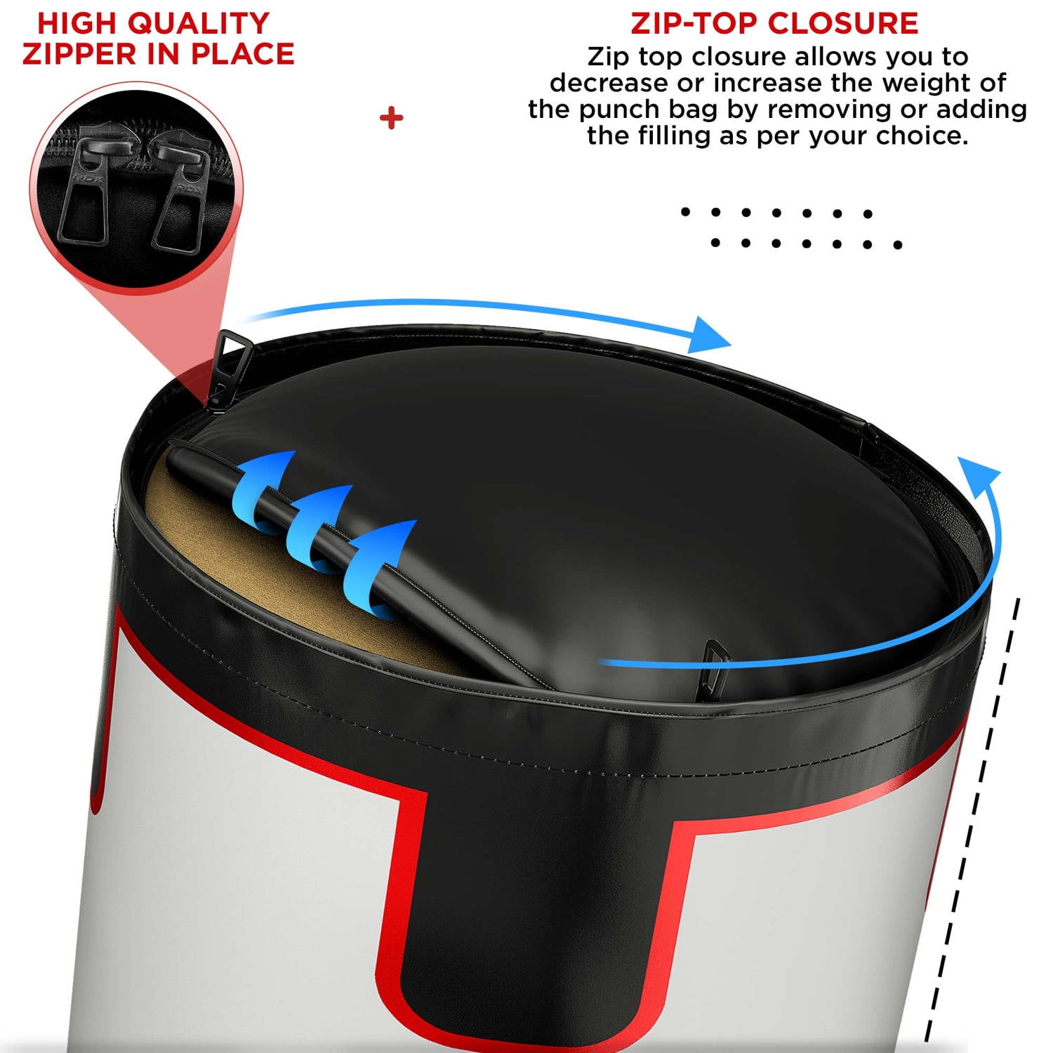 Train with enduring sports brand RDX Zero Impact G-Core™ twin layered non tear Maya Hide Leather Technology Punch bag. The RDX Maya hide Leather Unfilled boxing punch bag is 2ft high with 28cm diameter, weight approx 10 to 12 kg (when filled). Set comes complete with 6oz Gel boxing gloves and Zip top design allows to change the filling as desired. This allows to securely fix to majority of Boxing Frames and Wall Brackets. Amazing shock absorption, protecting wrists and hands while returning to its original shape rapidly. Double layered for durability and extended use. Supplied with free gel bag gloves. This RDX Punch Bag set is the perfect product for an affordable home boxing workout for kids under the age 14 years