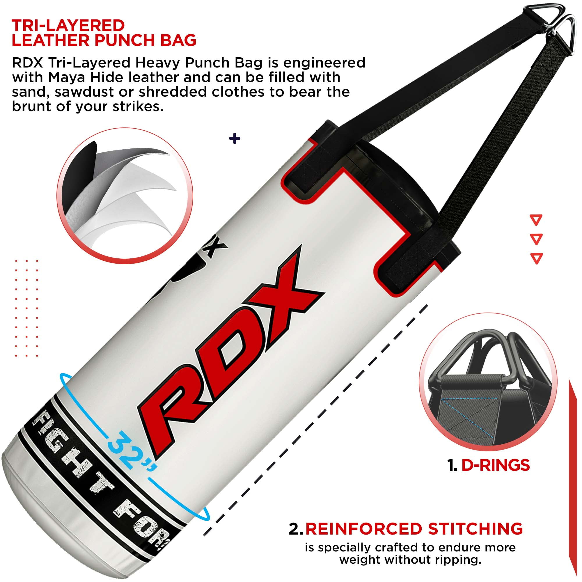 RDX twinned layer non tear Maya Hide Leather. Punching bag is 2ft High (3ft with Nylon straps) with 28cm diameter Our junior punch bag set offers Nylon Straps that deliver outstanding holding strength, they are resistant to splitting and can withstand approximately 9 to 12kg of weight. For your upcoming young MMA fighter this complete set includes kids sized gloves, a punch bag that can be filled with shock absorbing textiles for high-impact workouts. It helps to build stamina, endurance and develops hand eye coordination Resilient Maya Hide leather construction makes these gloves stubbornly durable and long-lasting