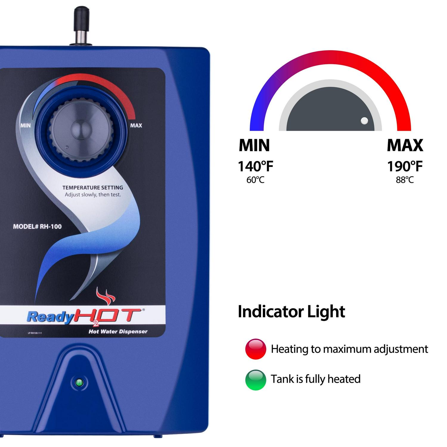 The Ready Hot instant hot water tank can deliver up to 60 cups per hour of 190 degree steaming hot water at your fingertips. The near-boiling water makes beverages and instant foods in seconds including tea, coffee, cocoa, soups, noodles, pasta, and vegetables. In addition, this under sink hot water dispenser may be used for many other household tasks like warming baby food and bottles or cleaning pots and pans. Whether you re cooking, cleaning, or preparing hot beverages, Ready Hot provides instant hot water that will save you time in the kitchen.