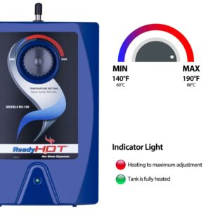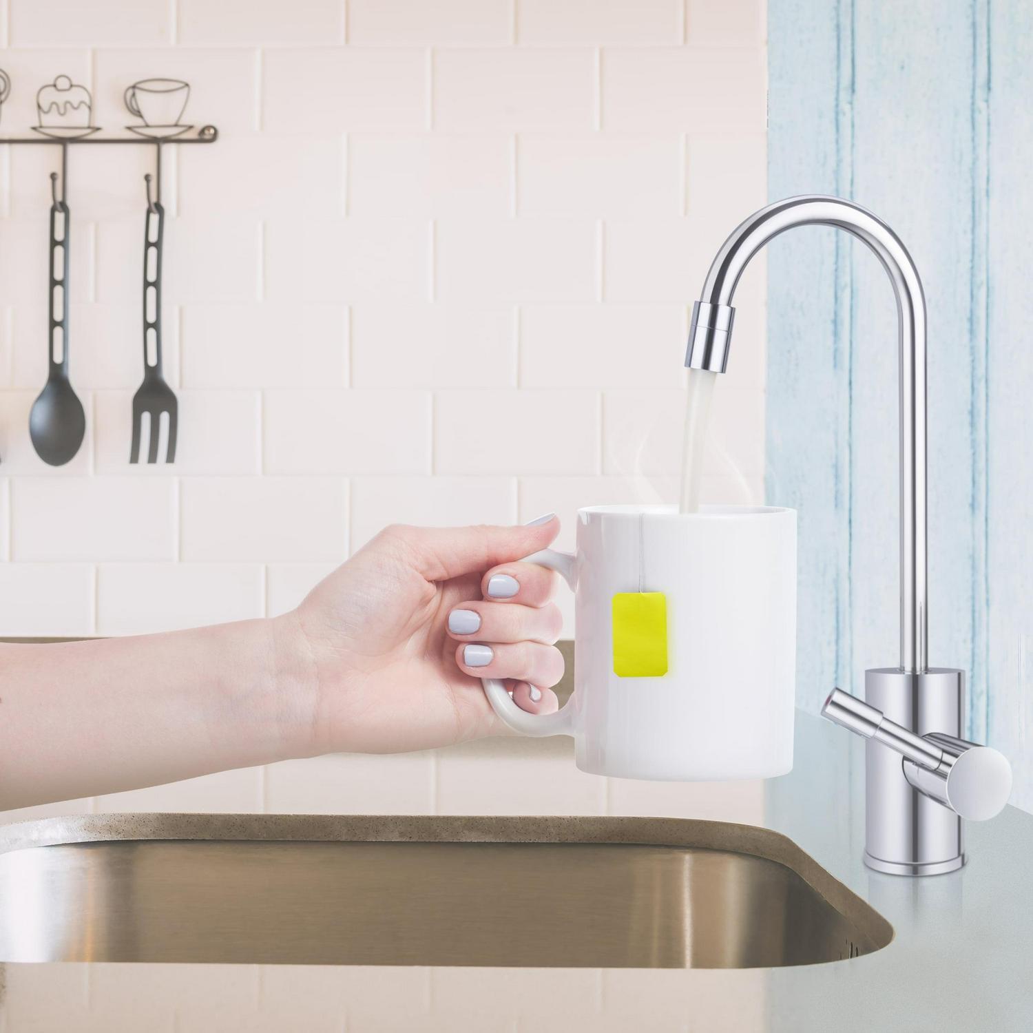 Whether you re cooking, cleaning, or preparing hot beverages, the Ready Hot Instant Hot Water Dispenser System provides steaming hot water that will save you time in the kitchen. The under sink instant hot water tank can deliver up to 60 cups per hour of near-boiling water at your fingertips. The single lever faucet sits on the edge of your kitchen sink and makes the perfect compliment to your main kitchen faucet.