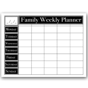 The Ready2HangArt Family Weekly Dry Erase Calendar – White keeps your family organized every day of the week. This reusable calendar features five columns for optimal organization for every family member. This frameless, modern dry erase calendar includes rear hanging system that makes it look like it’s floating on your wall. It features an ArtPlexi surface that’s clear polished and showcases every fine ink detail for easy reading.