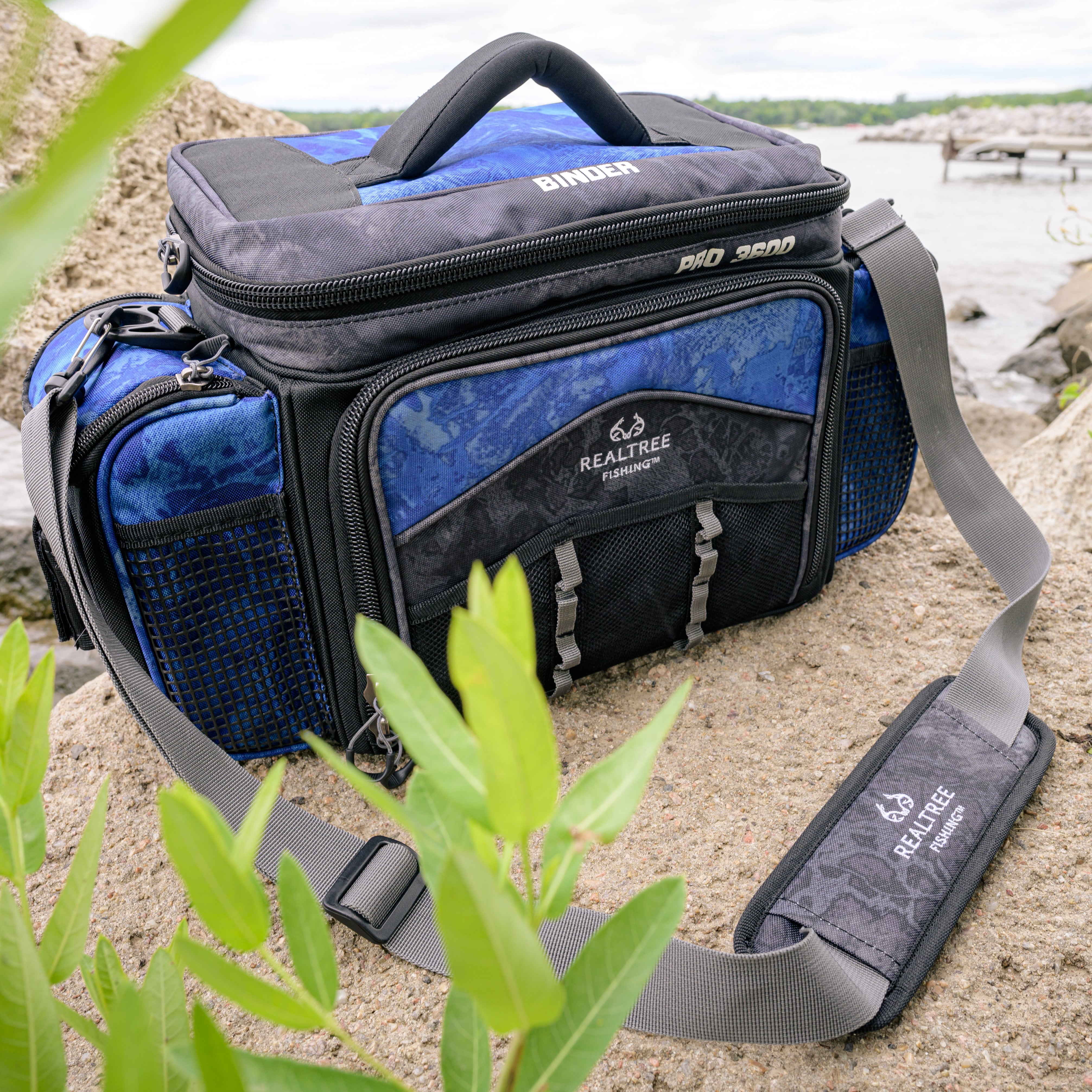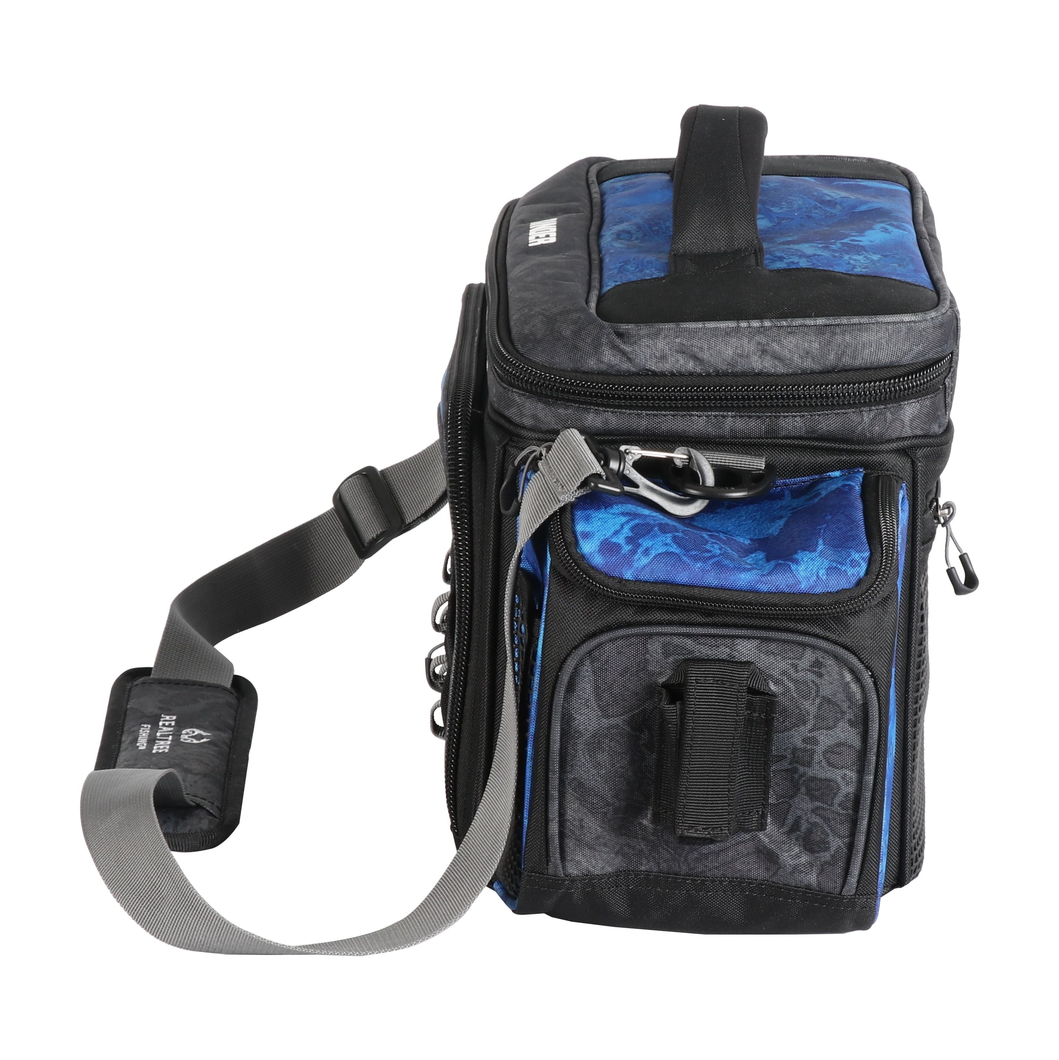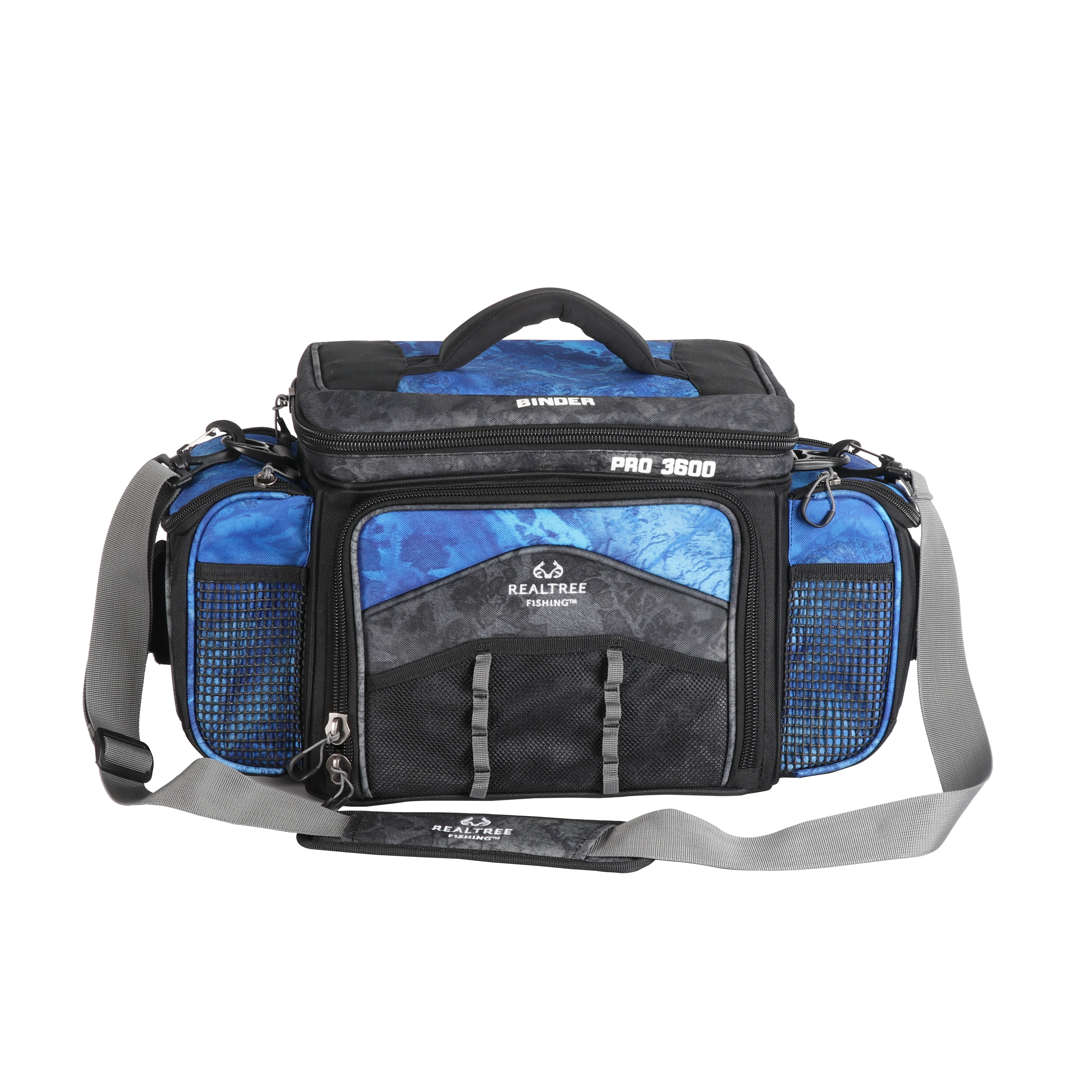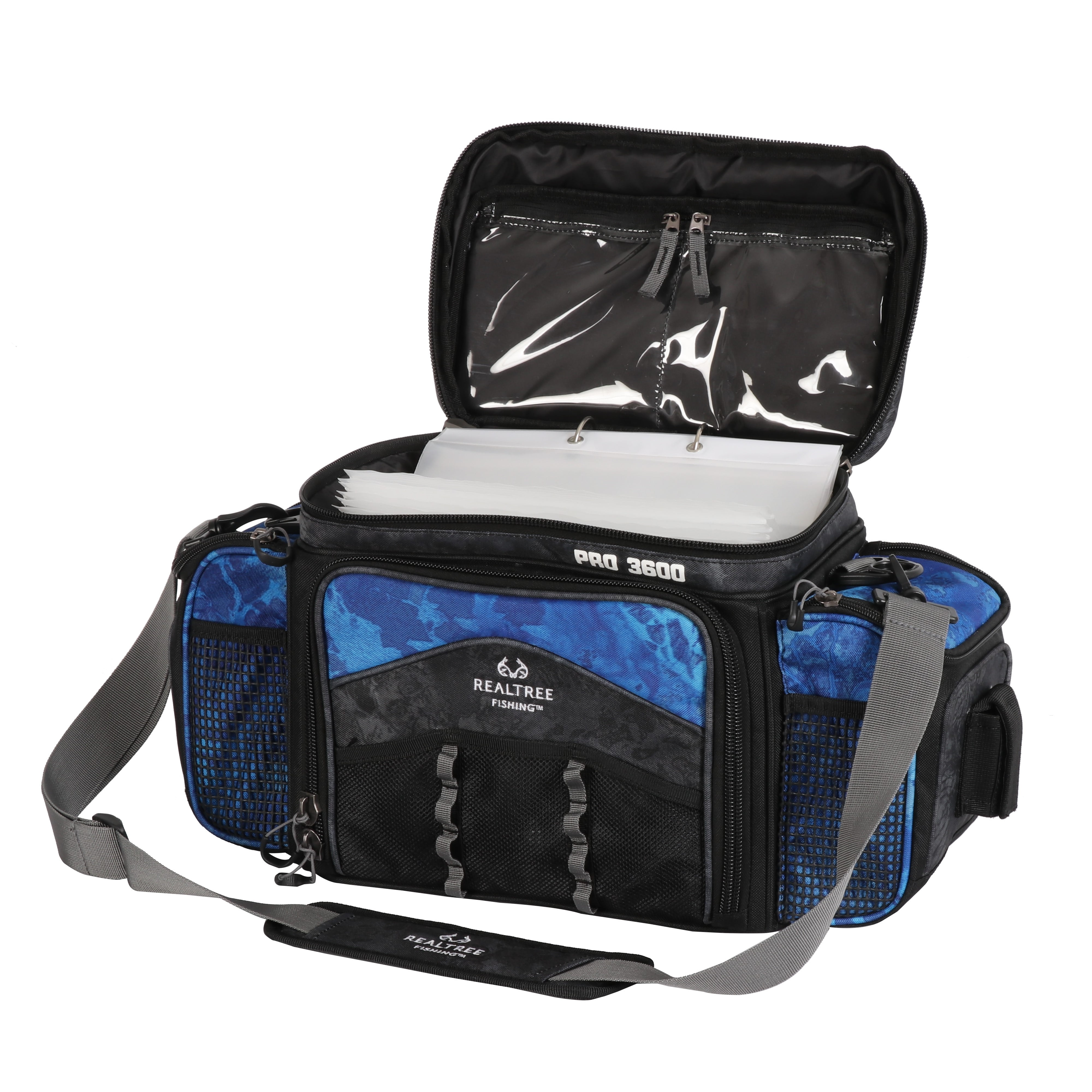 Realtree Adult Pro 3600 Fishing Tackle Binder Top Bag, Blue: Includes four 3600 size utility boxes for storing tackle and other important gear Binder top compartment with storage envelopes Bag designed with Realtree WAV3 camo (500D PVC) print Large, zippered side pockets offer additional storage Zippered and mesh pockets on back Adjustable, padded, removable shoulder strap Mesh accessory pockets on front panels Large, heavy duty zippers and zipper pulls Webbing plier holder on both side panels to keep your trusty tool within reach Multiple daisy chain web loops for accessories Padded carry handle for easy and comfortable carrying Unisex Product dimensions (inches): 18.90” x 7.87” x 11.02” Tackle bags Tackle boxes