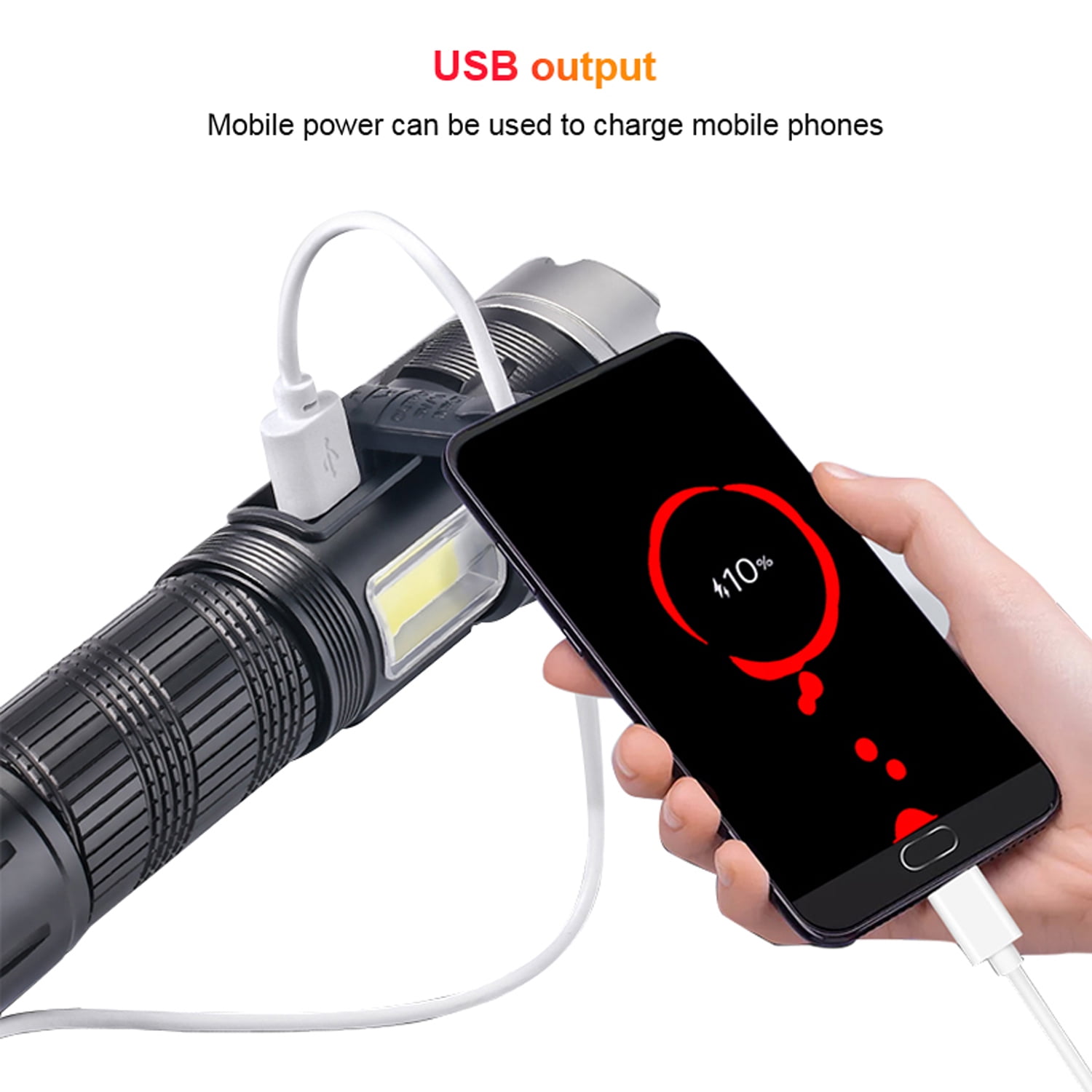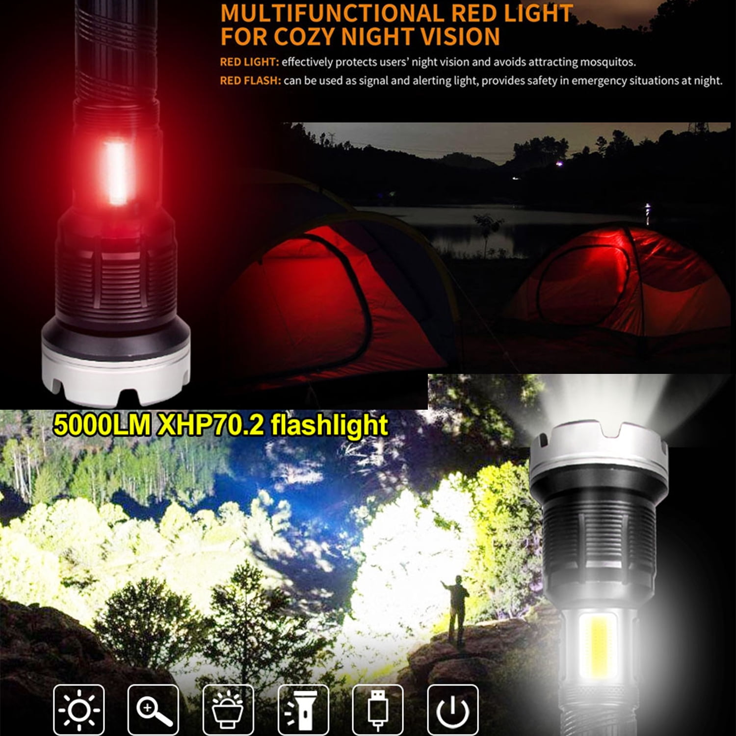 Super Bright True 5000 High Lumens Vastfire handheld flashlight bright enough to light up a football field, spotlight to illuminate your backyard or illuminate a mountain range a small distance away. Camping-grade flashlight ideal for emergency services, search-and-rescue COB White and Red Side Light Quickly double clicks the power button will turn on the side light .There’s two brightness settings, plus solid red and flashing red, Which is bright enough to read by or change a tire.While camping at night, this side red light will incredibly useful It works well for all typical camping scenarios, such as: Leaving the tent to use the bathroom Reading a book or looking at a map before going to bed Looking for something in the tent without disturbing your tent mate with a bright light As a Powerbank This flashlight uses a rechargeable 10000mAh battery. it has a power output function, which can be used as an emergency mobile power supply for mobile phones/iPads and other devices. 4 Blue light battery power indicator easily informed of the power level.Specially designed for outdoor applications Safe Shipment Make sure to unwrap batteries from the plastic before using( Insulating paper was used for safe shipment), the main reason caused this flashlight cannot be charged or turned on, 4 blue lights beside the power button will all on when it was fully recharged. One-handed Operation One hand operable side switch has a wearproof silicone cover which is friendly for glove users. Ergonomic Design Constructed with a CNC machined unibody design, featuring lightweight, solidity and excellent heat dissipation. Anodized aircraft-grade aluminum Waterproof (IPX4) and impact-resistant(1.5 meter). The anti-skid knurling is ideal for long term carry or operation Free 2 years Warranty Free 2 years warranty, contact us directly so no need to return the defective one, will get a new replacement for free Parameters Lamp Beads:P70.2 LED