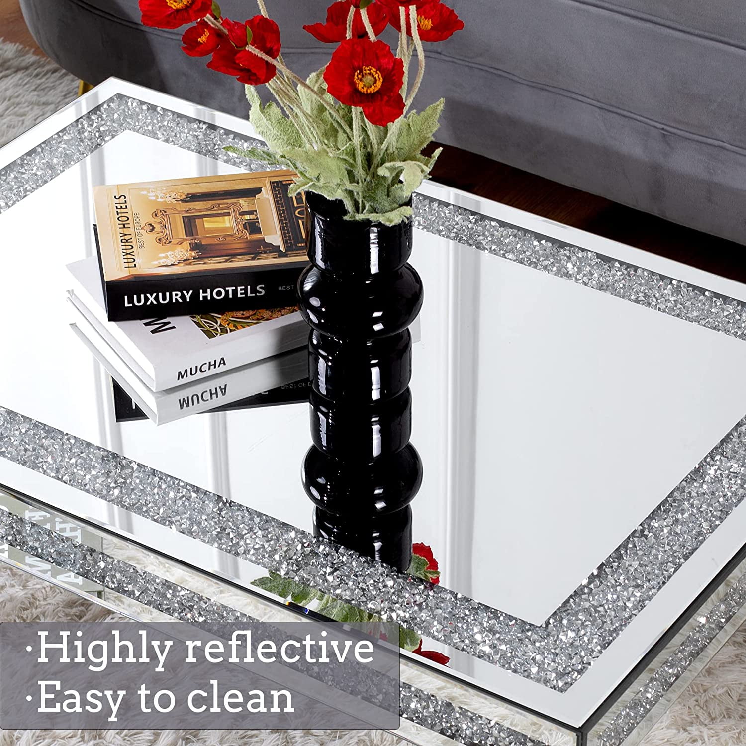 Make this diamond coffee table the focal point of your living room. This stylish table features a unique design with a sleek, stylish, and modern rectangular shape. The table’s surface is covered in high-quality silver mirrors and crushed diamonds to add depth and width to your living room. The large surface area provides you with space to put your belongings. Pair it with other items in the collection for a coordinated, chic effect.